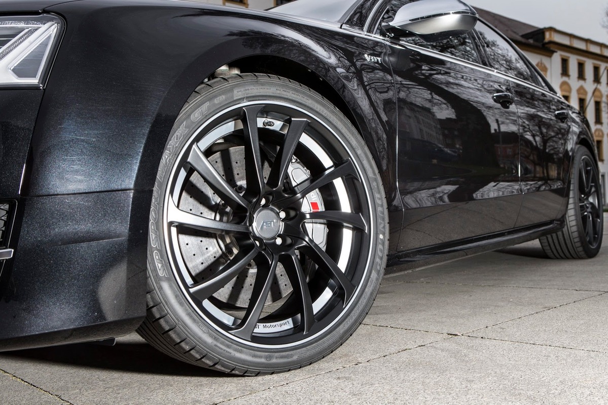 目前ABT Sportsline尚未公布實際測試的加速成績,僅表示已經將原廠250km/hr的電子限速解除。外觀部分,ABT Sportsline大致上維持原廠配置,僅為這部黑色Audi S8換上自家黑色輪圈與高性能跑胎。