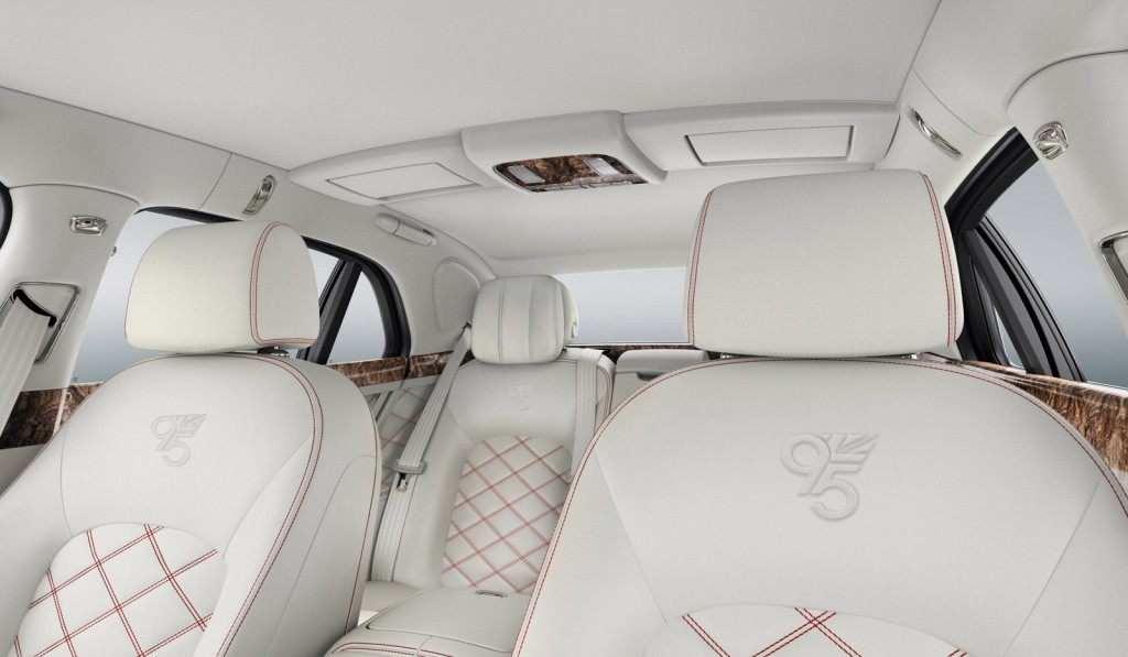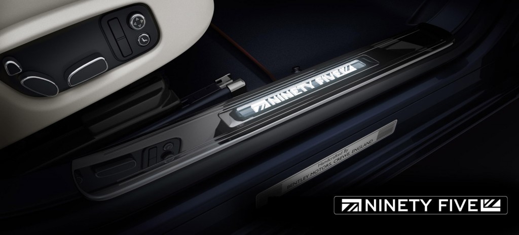 由於Bentley原廠為顧客提供多樣化的配備內容,有時候面對Mulsanne琳瑯滿目之選項,難免頓時會猶豫不決,因此有時候不如交給原廠設計師們進行精選。為了慶祝Bentley建廠95周年,英國克魯廠的Mulliner客製化部門推出限量15部、取名Bentley Mulsanne 95的特仕版本車型,提供Britannia Blue大不列顛藍色、Empire Red帝國紅色與Oxford White牛津白色等三種極富英國風的塗裝,同時將原本配在Mulsanne的進階操控套件(Mulliner Driving Specification)當中的21吋輪圈施以燻黑色塗裝。內裝部分,Bentley Mulsanne 95用上樹齡300年至400年的胡桃木作為飾板材料,不是Bentley沒有環保意識,而是該英國老樹於2007年在林肯郡富爾貝克(Fulbeck, Lincolnshire)的一場暴風雨中倒塌,Bentley有幸能將其年輪刻劃在車內飾板中。除此之外,這部限量特仕車款在門檻處貼有「NINETY FIVE」金屬字樣與國旗,並且在前後座椅頭枕處刺繡有「95」字樣,而內裝皮革則以白藍雙色真皮搭配紅色車縫線為主軸。