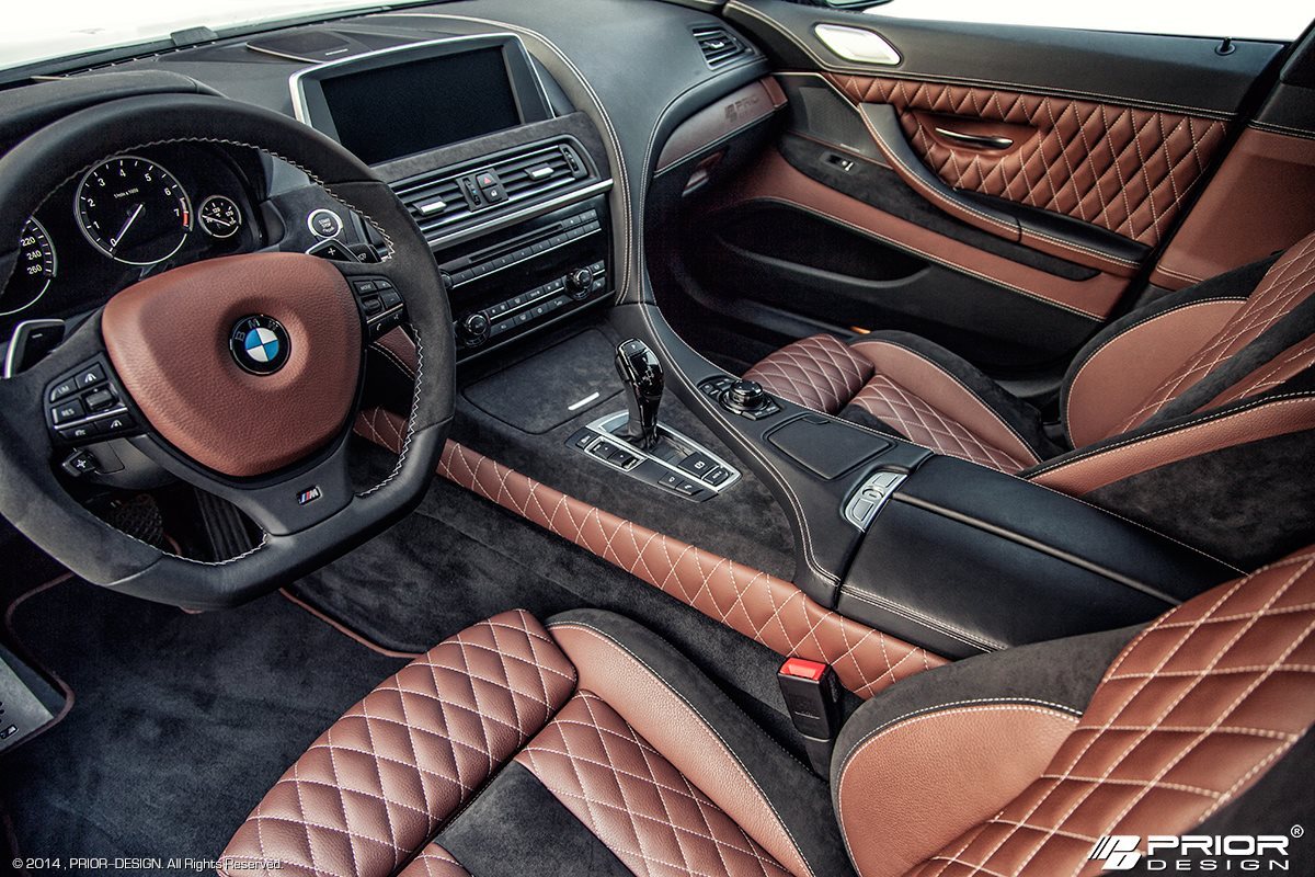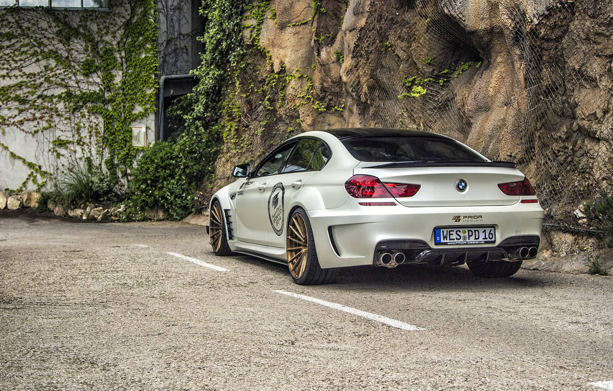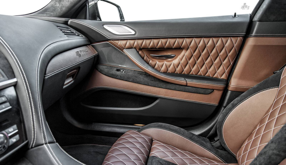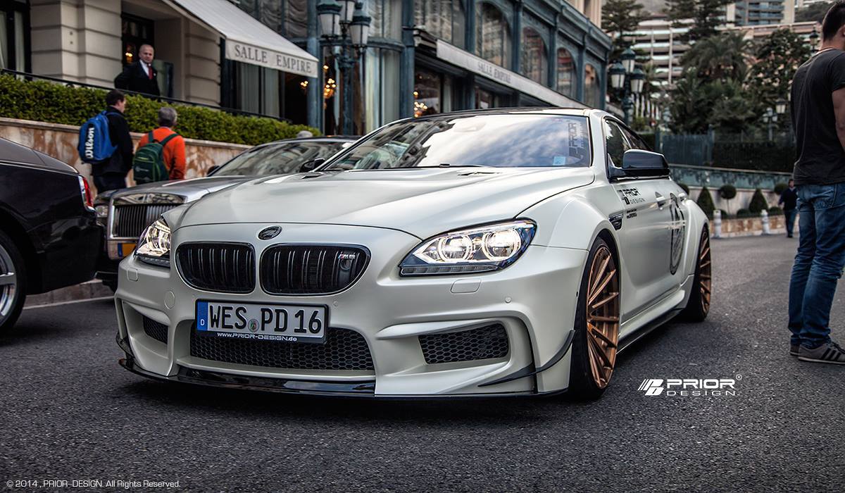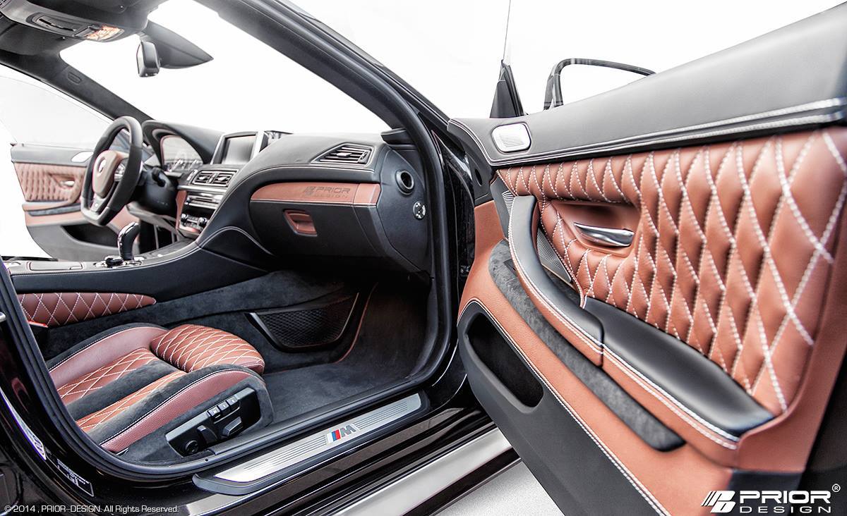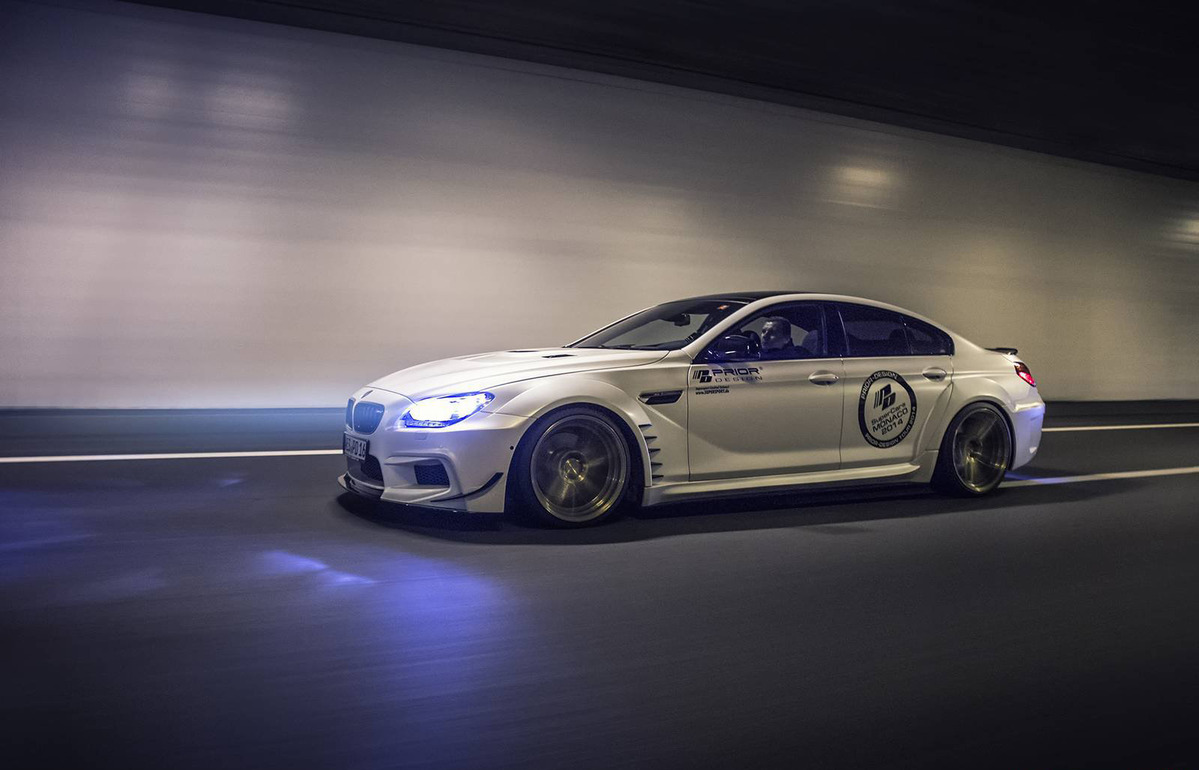 今天與各位分享的是由改裝廠Prior Design所操刀的BMW M6 Gran Coupe,換上全車寬車體空力套件,包含侵略性十足的前保桿、引擎蓋、側裙組、後保桿、後下擾流板與後上擾流尾翼等部品,搭配前20x10.5J、後20x12.5J的前後配ADV.1 Wheels金色輪圈與Dunlop Sport Maxx高性能跑胎,另外換裝H&R運動版本避震器組將車身降低,讓這部德國美型房車流露出濃厚動感。動力部分,Prior Design透過電腦程式改寫、進氣系統強化與高性能排氣管之換裝,將最大馬力提升至659HP,扭力峰值挺進至83.7kgm,使得百里衝刺成績跑進4秒內。內裝方面,針對這部BMW M6 Gran Coupe,Prior Design施以頂級真皮與麂皮包覆,再搭配樣貌特殊的菱格紋縫線,營造出一流質感。