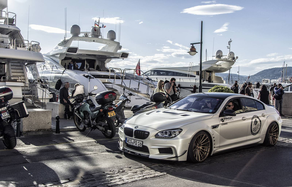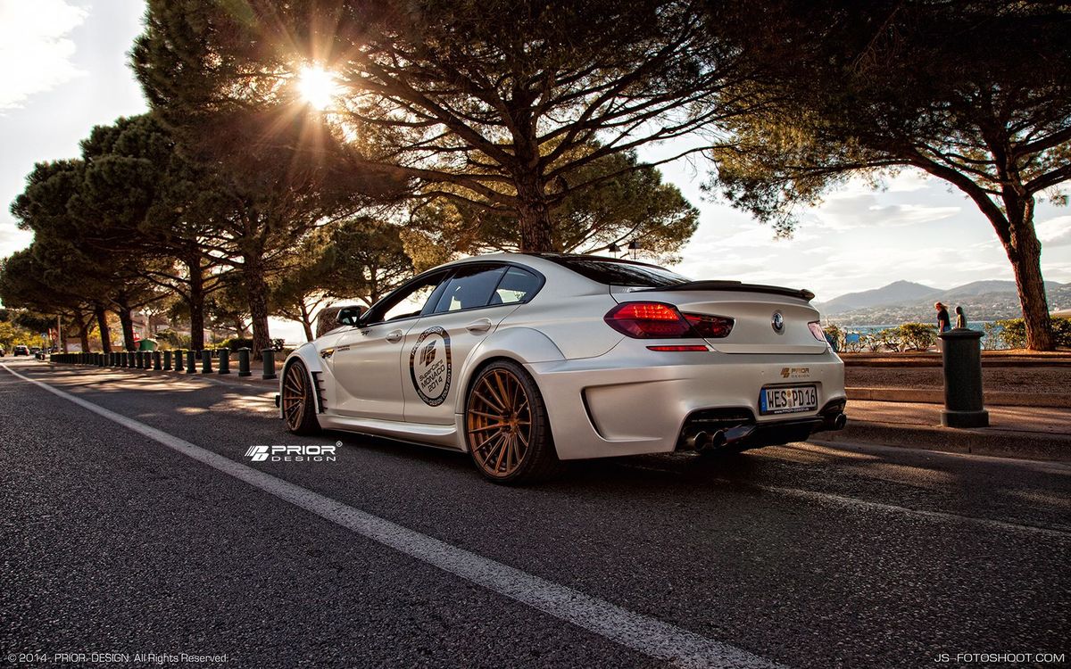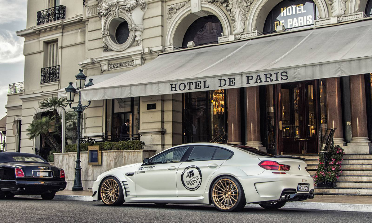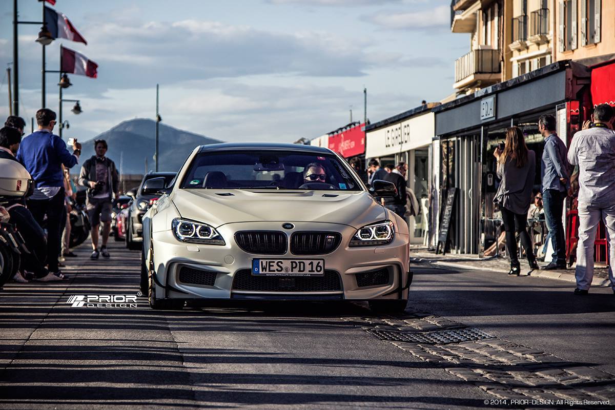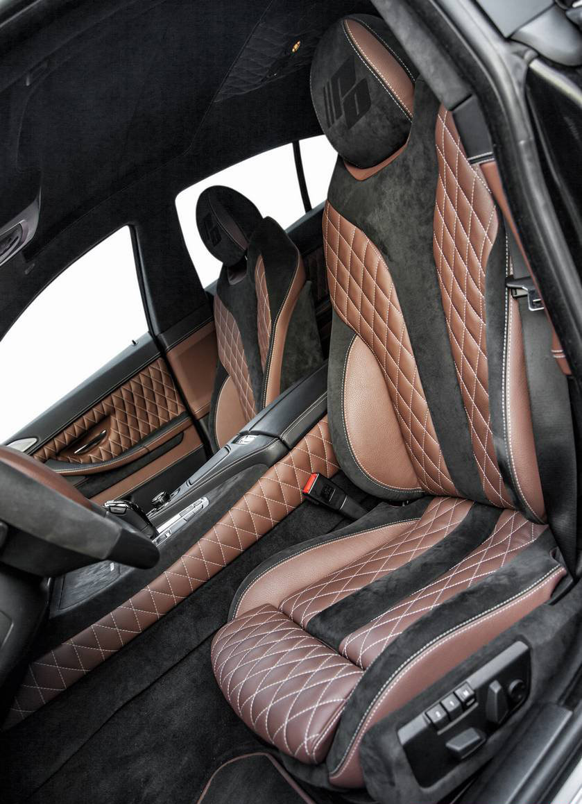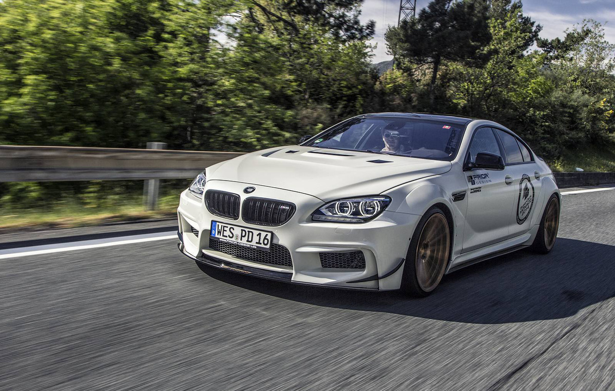 今天與各位分享的是由改裝廠Prior Design所操刀的BMW M6 Gran Coupe,換上全車寬車體空力套件,包含侵略性十足的前保桿、引擎蓋、側裙組、後保桿、後下擾流板與後上擾流尾翼等部品,搭配前20x10.5J、後20x12.5J的前後配ADV.1 Wheels金色輪圈與Dunlop Sport Maxx高性能跑胎,另外換裝H&R運動版本避震器組將車身降低,讓這部德國美型房車流露出濃厚動感。動力部分,Prior Design透過電腦程式改寫、進氣系統強化與高性能排氣管之換裝,將最大馬力提升至659HP,扭力峰值挺進至83.7kgm,使得百里衝刺成績跑進4秒內。內裝方面,針對這部BMW M6 Gran Coupe,Prior Design施以頂級真皮與麂皮包覆,再搭配樣貌特殊的菱格紋縫線,營造出一流質感。