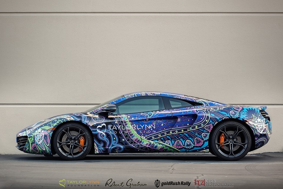 日前,以兒童福利為宗旨的著名慈善機構Taylor Lynn Foundation為了參加即將開跑的Gold Rush Rally路跑活動,特別將一部McLaren 12C送到專業貼膜廠商施以全車彩繪貼膜,由服裝設計師Robert Graham操刀設計圖騰,另外再於改裝廠TAG Motorsports換裝AWE高性能排氣管,配上原本的燻黑色輪圈與橘色煞車卡鉗,讓這部英倫超跑展現出獨特風格。