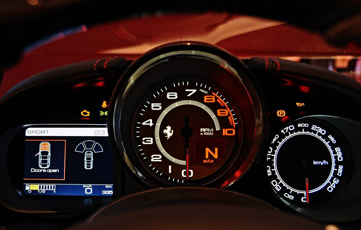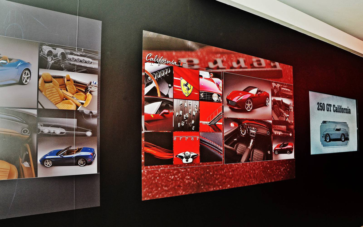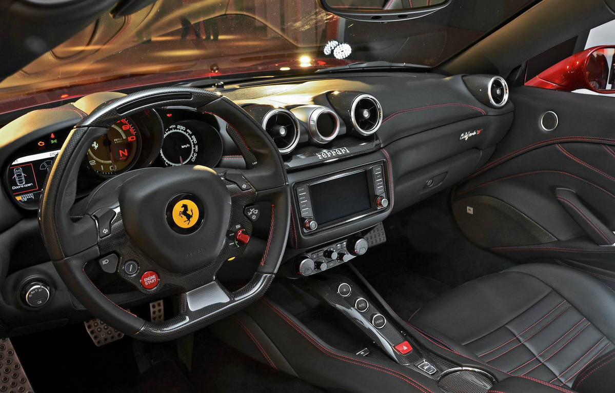 選擇在一年前展示Ferrari LaFerrari的同個會議廳,這次以紅黑two-tone雙色塗裝亮相的Ferrari California T在配備方面算是相當豐富,座艙內選用含LED超轉燈的碳纖維鑲飾方向盤、碳纖維駕駛區上半部飾板、碳纖維中央扶手內側、碳纖維門檻飾板、黑色真皮內裝與紅色車縫線等,另外配有倒車攝影機、衛星導航系統、全新中央螢幕與能結合Apple產品的CarPlay系統,展現諸多最新科技與性能的結合。