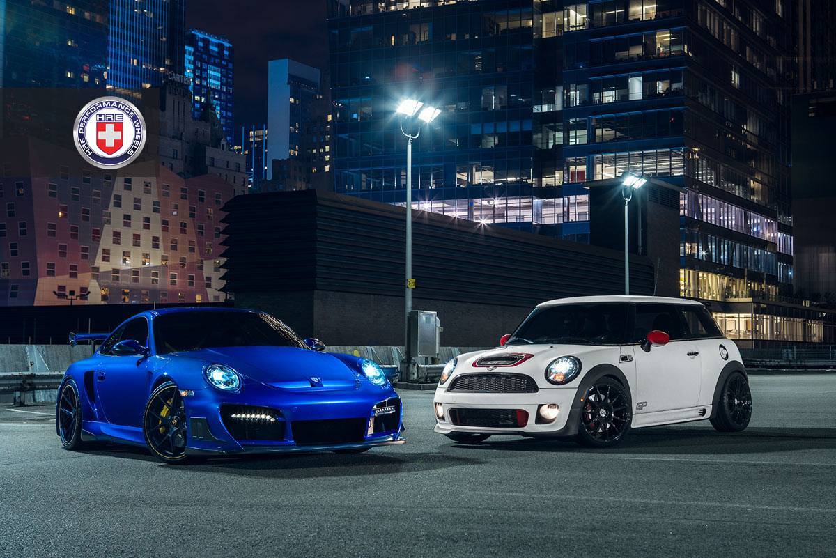 今天帶給各位兩部強調操駕樂趣的車款,一部是小改款後Porsche 997 Turbo S與特仕版本Mini Cooper GP,兩者皆在各自所屬的領域當中佔有一席之地。其中,採用藍色塗裝的Porsche 997 Turbo S配有御用改裝品牌Techart、GTStreetR版本全車空力套件,搭配知名品牌HRE Performance Wheels出品、型號P101的消光黑色輪圈,再透過高低軟硬可調式避震器組的換裝將車身降低,展現出兇悍無比的氣勢。另外,可說是Mini車系當中最強悍版本的鐵灰色Mini Cooper GP也選用同樣來自HRE Performance Wheels、型號P43SC的亮面黑色輪圈,質感倍增,而兩部車都在攝影專家Andrew Link Photography的高超技巧下,盡情流露英姿。