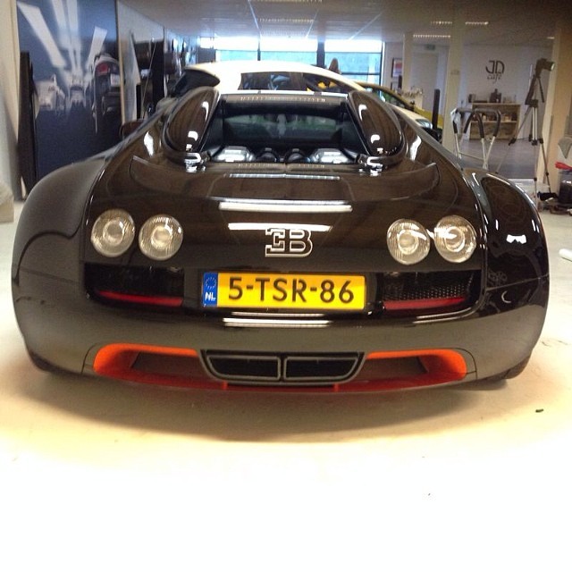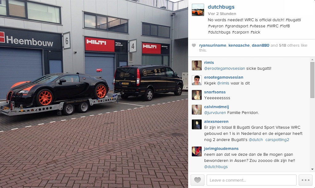 這幾天,有部記錄著Ferrari F430圍繞著Bugatti Veyron甩尾燒胎的影片廣為流傳,而其中那部Bugatti Veyron便是由社交網站Instagram、帳號dutchbugs的隱藏人物所擁有,而他總共持有三部不同版本的Bugatti Veyron,包含一部初期型Bugatti Veyron與進階版本Bugatti Veyron Grand Sport,另外一台則是眼前這部Bugatti Veyron Grand Sport Vitesse World Record Car Edition。顧名思義,該名車主來自荷蘭(Netherlands),而由於政府稅率規範所致,諸如Bugatti Veyron等被視為奢侈品的超級跑車都被課以極重的稅額,因此有不少玩家選擇在稅率沒那麼高的鄰近國家領牌,然後在牌照許可的區域行駛。這部Bugatti Veyron Grand Sport Vitesse World Record Car Edition原本懸掛德國(Germany)車牌,然後在許可德國車牌臨時上路的瑞士(Switzerland)使用,雖然手續較為繁雜,但較省錢。