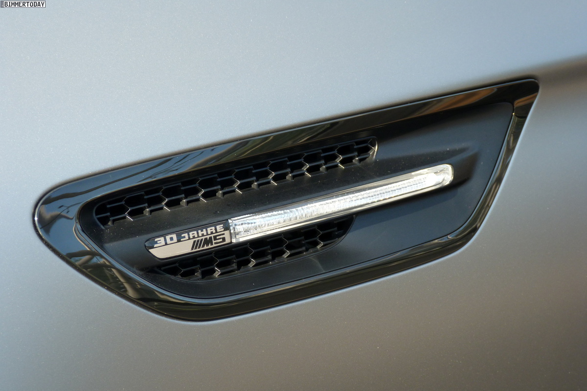 這款紀念版本BMW M5擁有黑色水箱護罩、Frozen Dark Silver Metallic消光暗銀色金屬塗裝、Competition Package套件當中的輪圈與原廠陶瓷碳纖煞車系統,同時於葉子板、門檻、內裝飾板與座椅等處貼上30 Jahre M5 1/300的銘板,以彰顯其不凡身分。內裝部分,BMW給予這部紀念車款最頂級的麂皮與真皮材質,同時配有頂級環繞音響與16支喇叭,更進階的600瓦Harman Kardon或1,200瓦Bang & Olufsen音響則列為選配。