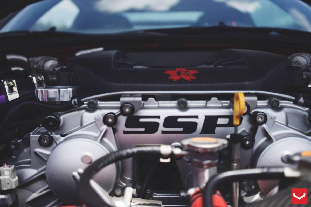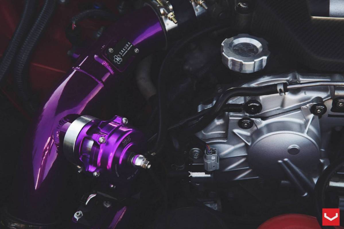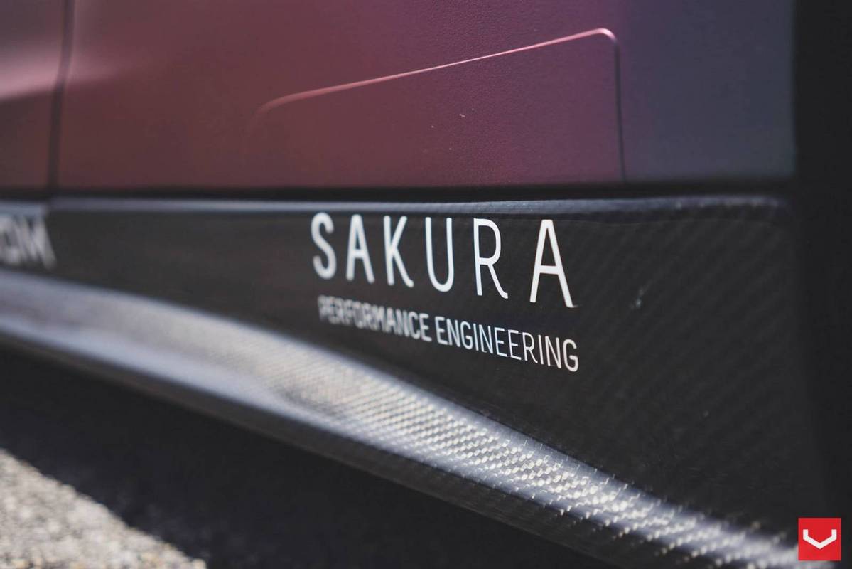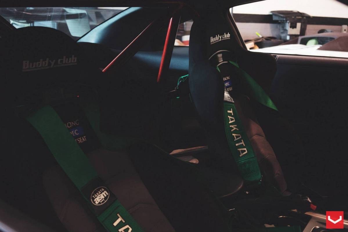 外觀方面,這部東瀛戰神被賦予搶眼的消光變色龍貼膜,再搭配碳纖維引擎蓋、前下巴、側裙、後下擾流板與後上擾流尾翼等,連同Vossen Wheels出品、型號VF2的多幅式20吋輪圈與藏在車內、圍繞著綠色Takata安全帶的Buddyclub賽車座椅,創造出獨有的競技氛圍。