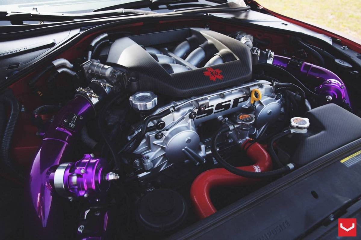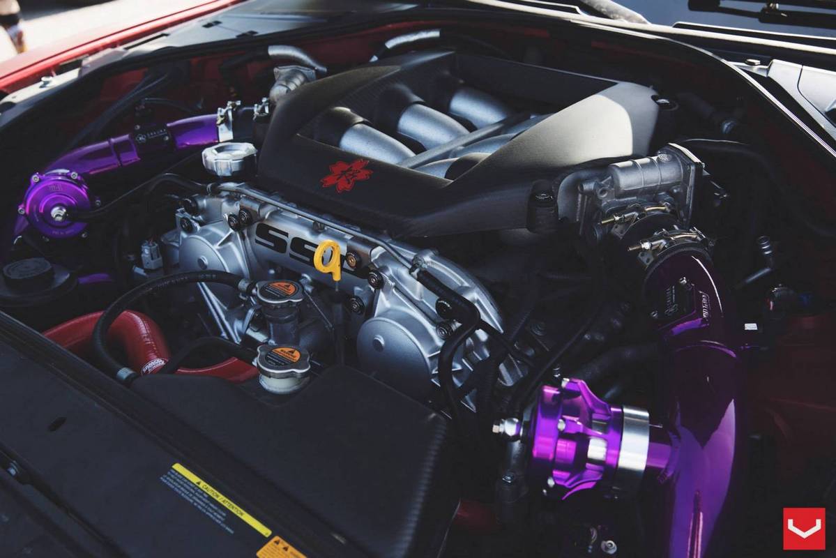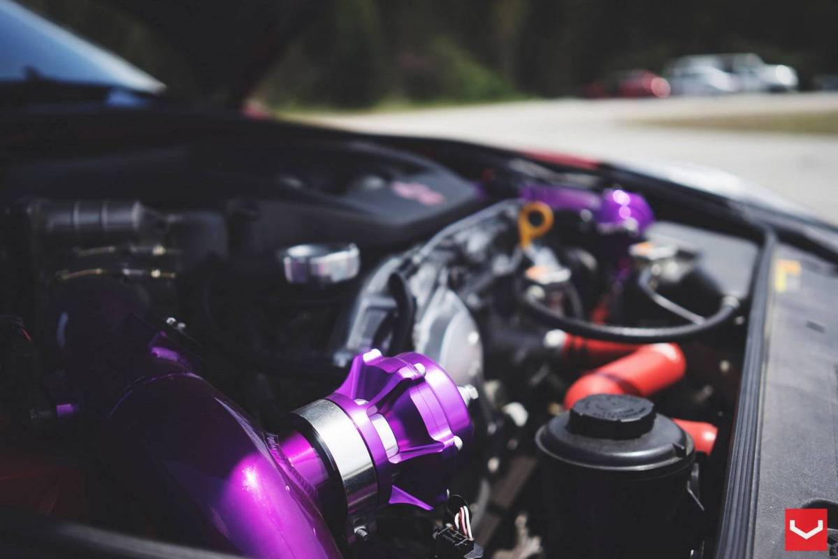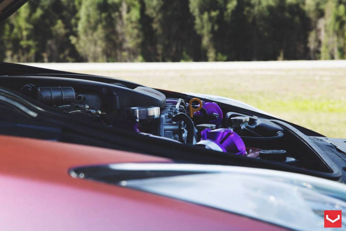 外觀方面,這部東瀛戰神被賦予搶眼的消光變色龍貼膜,再搭配碳纖維引擎蓋、前下巴、側裙、後下擾流板與後上擾流尾翼等,連同Vossen Wheels出品、型號VF2的多幅式20吋輪圈與藏在車內、圍繞著綠色Takata安全帶的Buddyclub賽車座椅,創造出獨有的競技氛圍。
