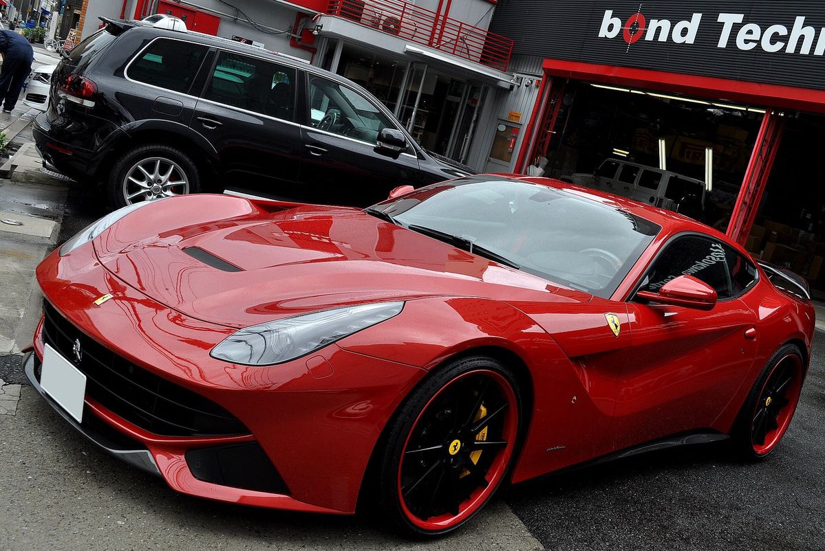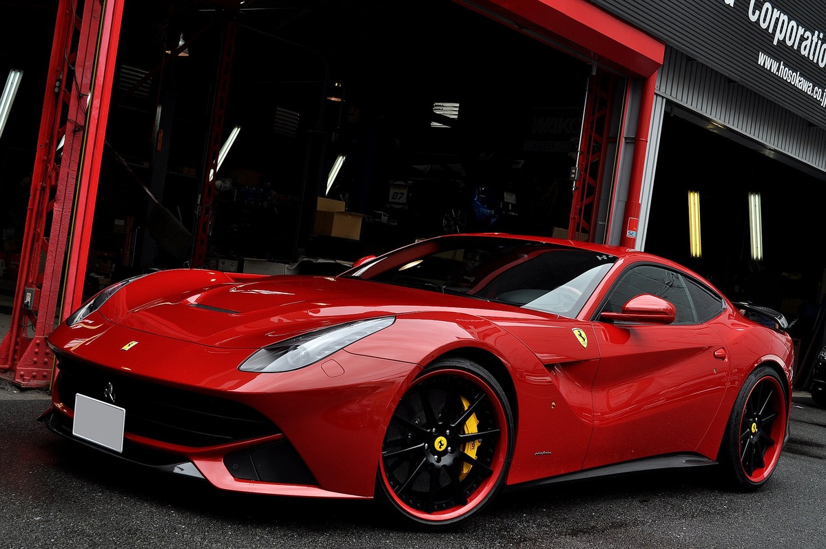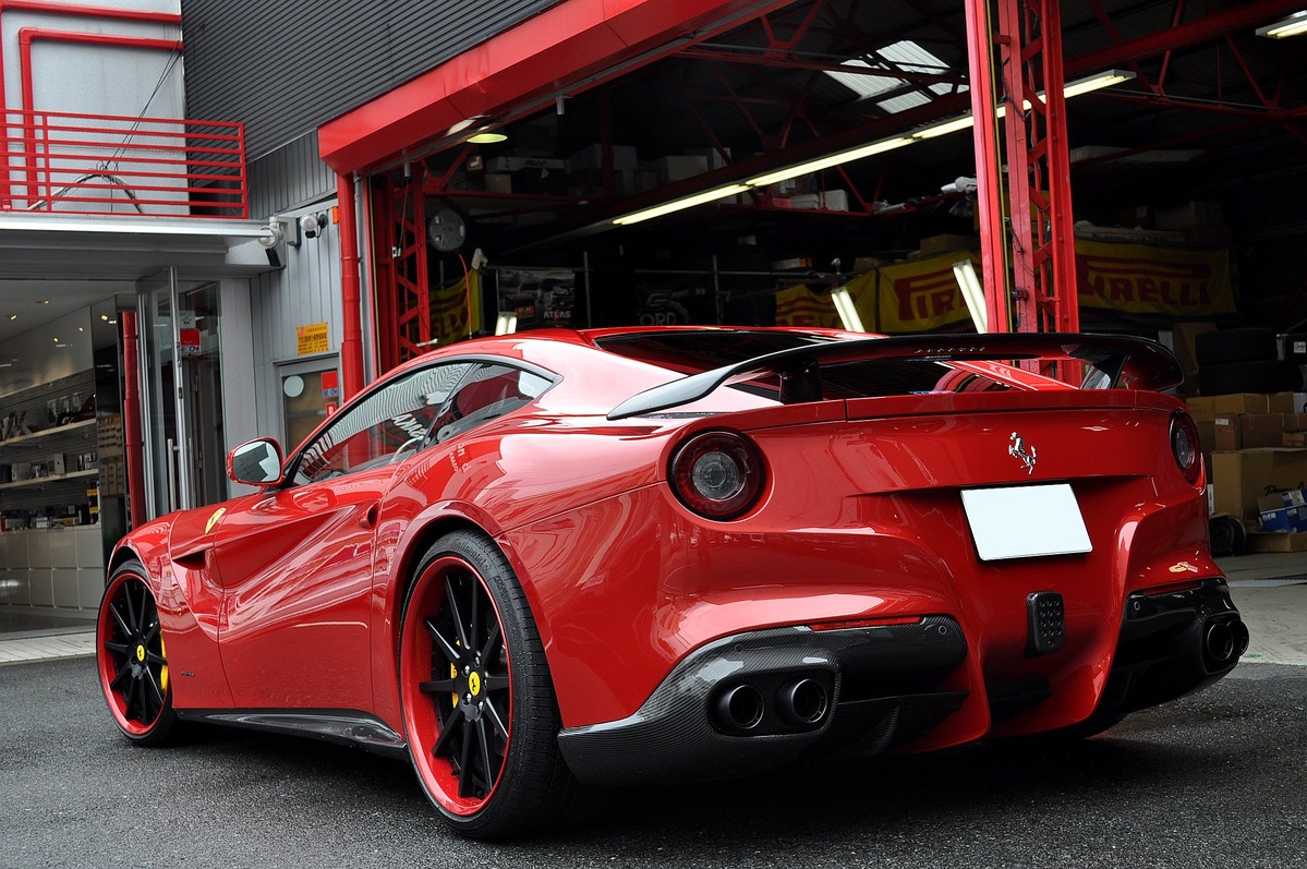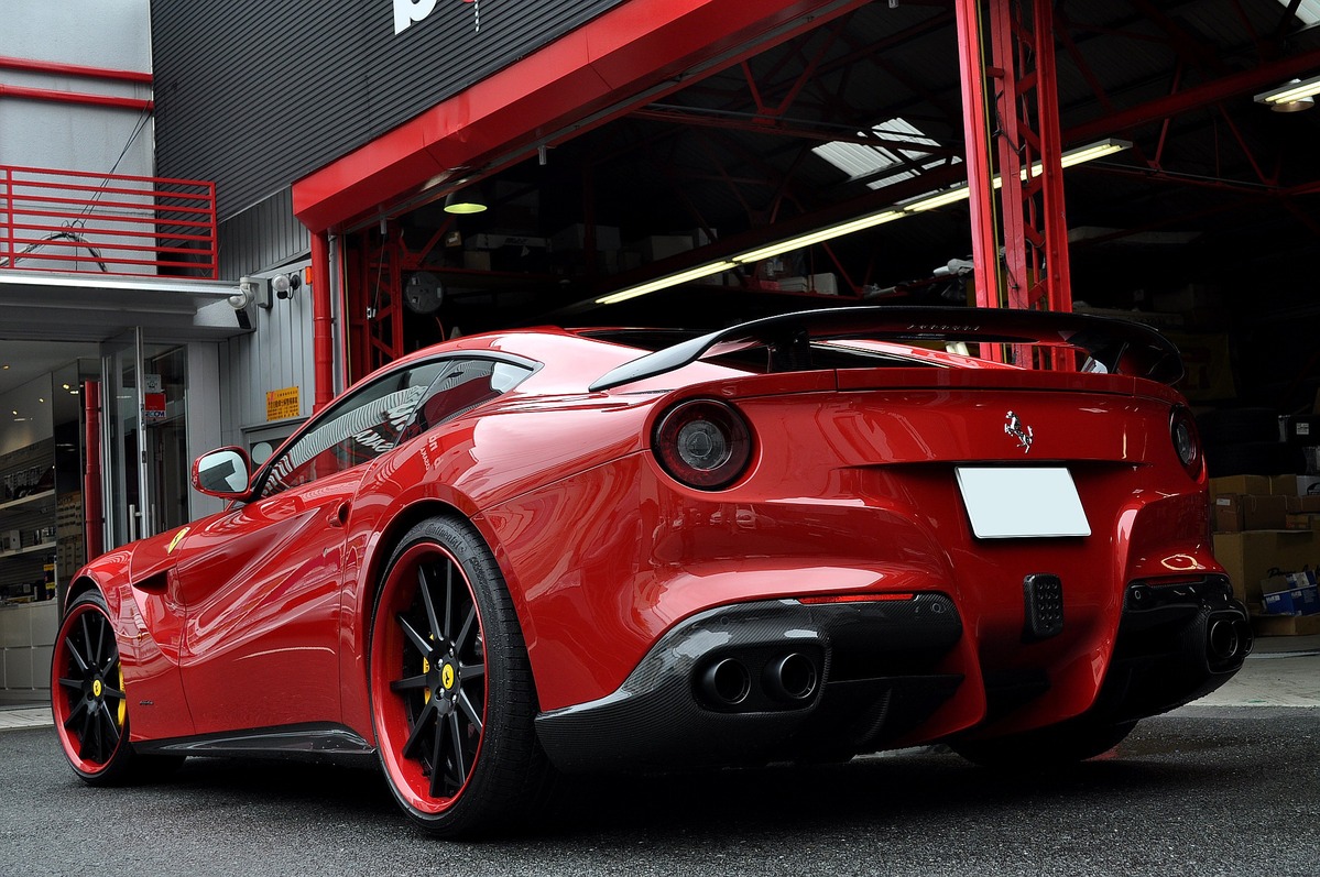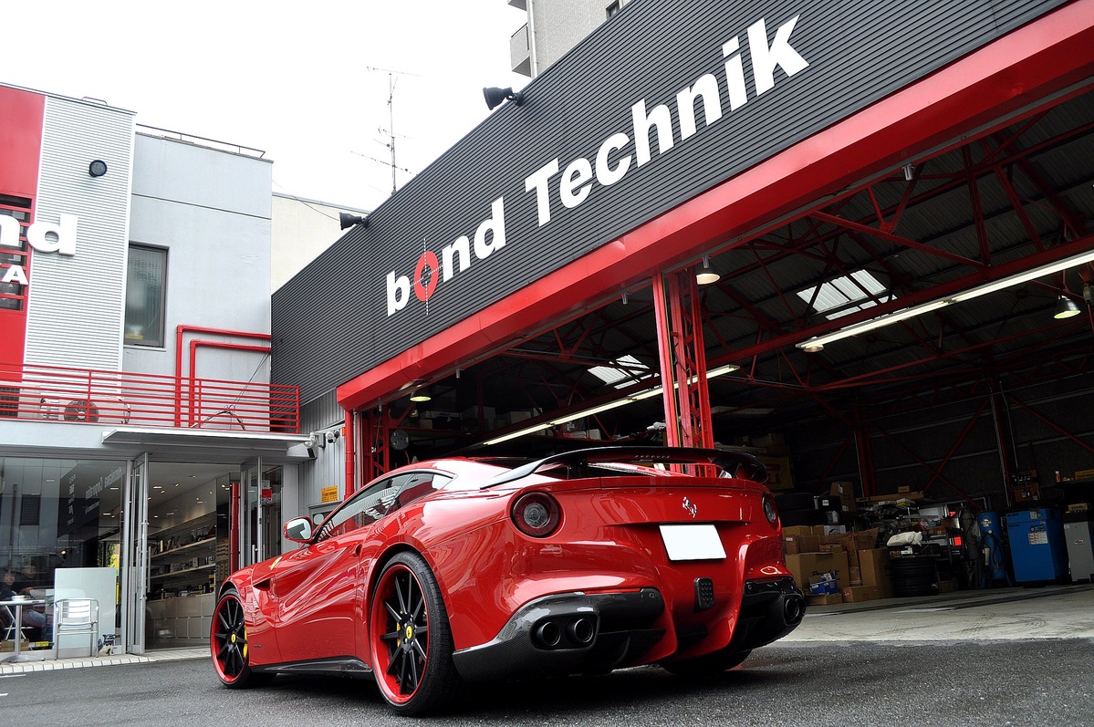 今天帶給各位由集團位於大阪的分公司Bond Osaka所操刀的義大利超級跑車Ferrari F12 Berlinetta,換裝來自RevoZport的碳纖維前下巴、後下擾流板與側裙組,再搭配御用品牌Novitec Rosso的碳纖維後擾流尾翼與燻黑尾燈組,輪圈則是選用Hyper Forged Wheels出品、型號HF-10的輕量化款式,尺寸為前21x9.5J、後22x12J的前後配設定,中心施以黑色塗裝,外圈則以與車身相同的紅色烤漆處理,搭配前255/30R21、後335/25R22的Continental Sport Contact 5P高性能跑胎。