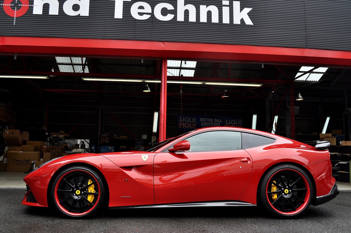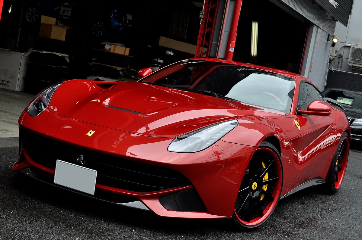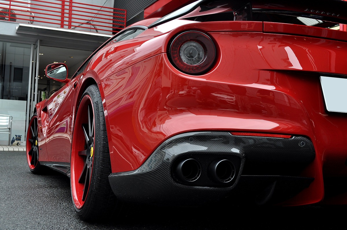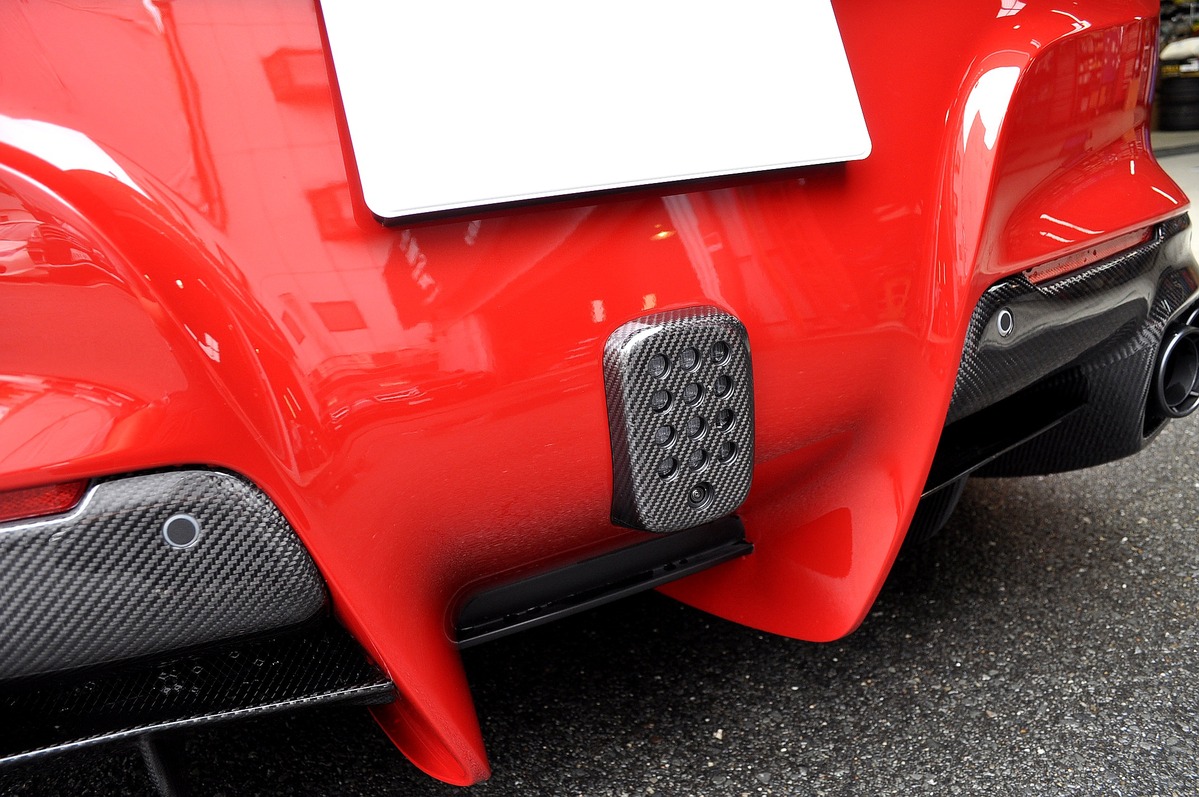 今天帶給各位由集團位於大阪的分公司Bond Osaka所操刀的義大利超級跑車Ferrari F12 Berlinetta,換裝來自RevoZport的碳纖維前下巴、後下擾流板與側裙組,再搭配御用品牌Novitec Rosso的碳纖維後擾流尾翼與燻黑尾燈組,輪圈則是選用Hyper Forged Wheels出品、型號HF-10的輕量化款式,尺寸為前21x9.5J、後22x12J的前後配設定,中心施以黑色塗裝,外圈則以與車身相同的紅色烤漆處理,搭配前255/30R21、後335/25R22的Continental Sport Contact 5P高性能跑胎。