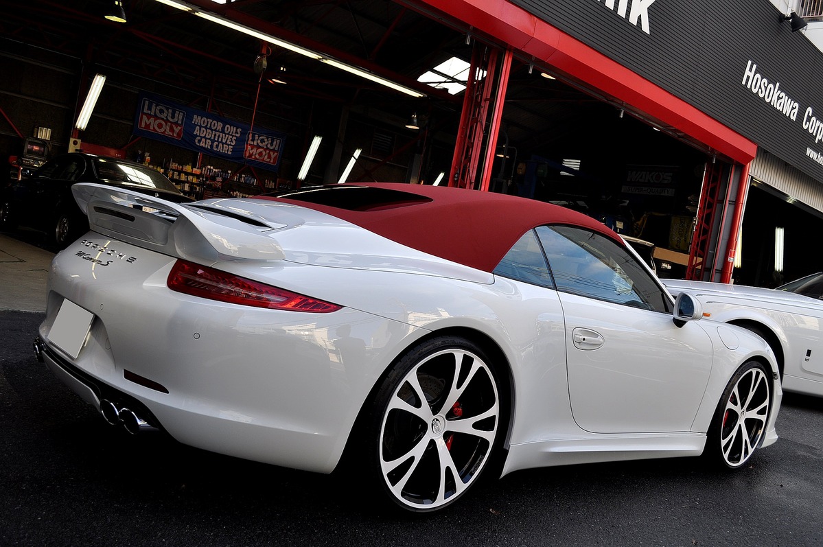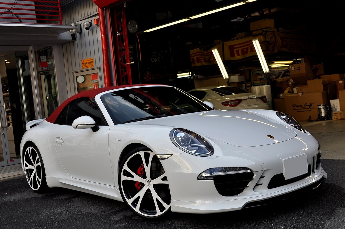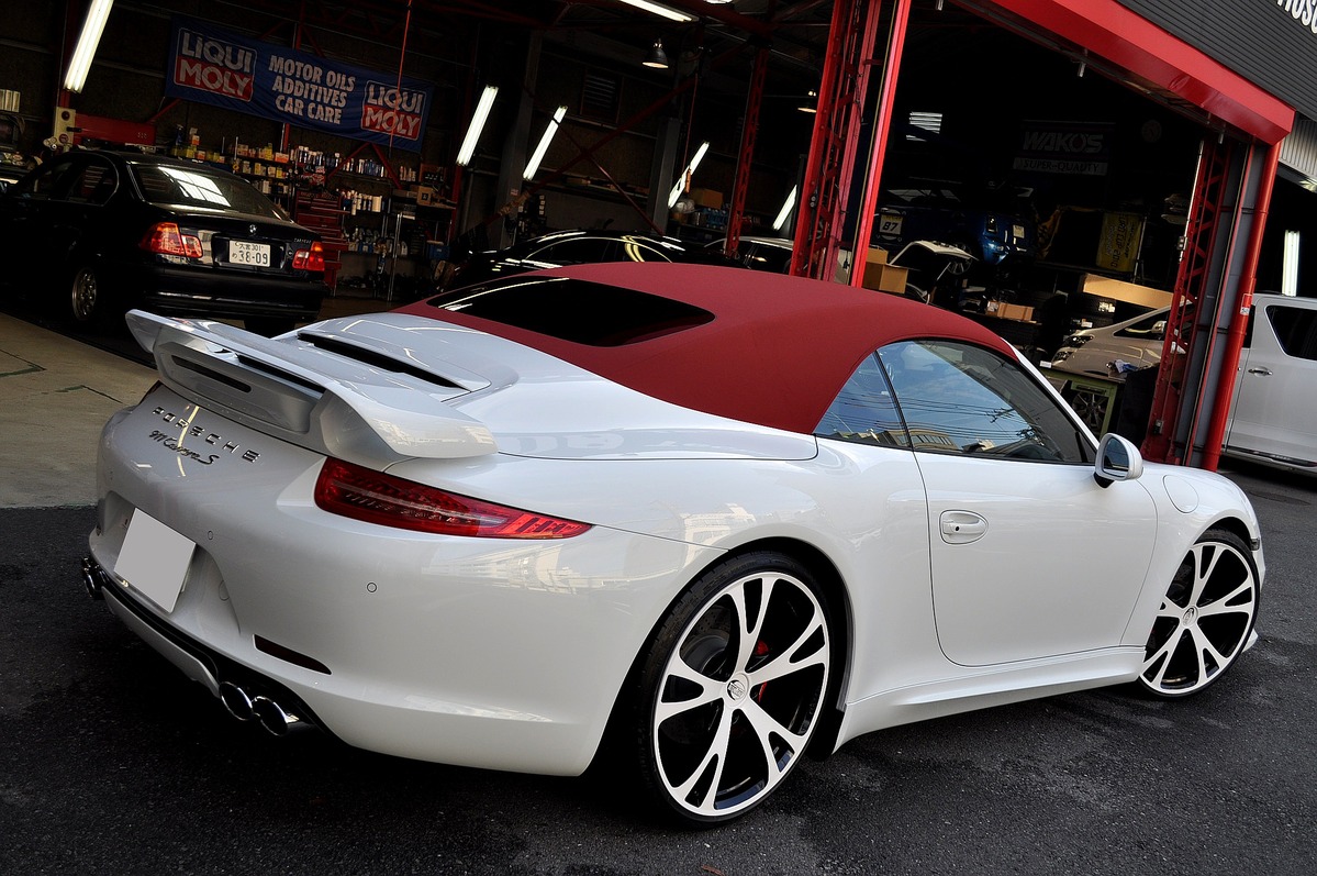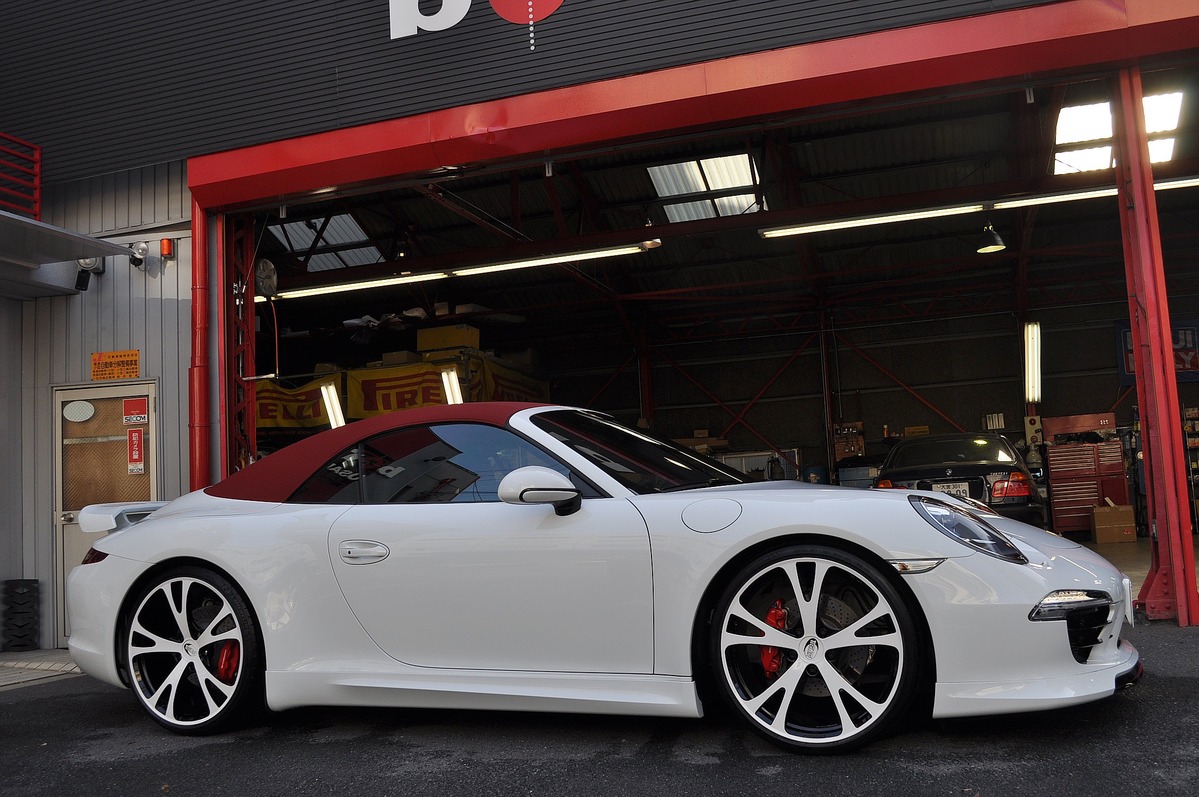 今天帶給各位一部由日本改裝廠Bond Osaka所操刀的白色塗裝、紅色頂篷Porsche 991 Carrera S Cabriolet敞篷跑車,外觀選用來自御用品牌Techart的空力套件,包含前下巴、側裙組、後下擾流板與後擾流尾翼等部品,輪圈則是換裝21吋Techart、型號Formula III的輕量化輪圈,搭配前245/30R21、後305/25R21的高性能跑胎,再將圈面施以亮面黑白雙色烤漆處理,另外透過H&R短彈簧的換裝將車身降低,營造出貼地飛行的優雅跑格。動力部分,Bond Osaka替這部德國上空跑車換裝Techart高性能排氣管以強化輸出效率,其餘則是維持原廠設定。另外,Bond Osaka捨棄原廠觸控式PCM中央螢幕,改以Clarion多功能影音系統替代,同時新增倒車攝影功能,實用性與質感皆有所提升。