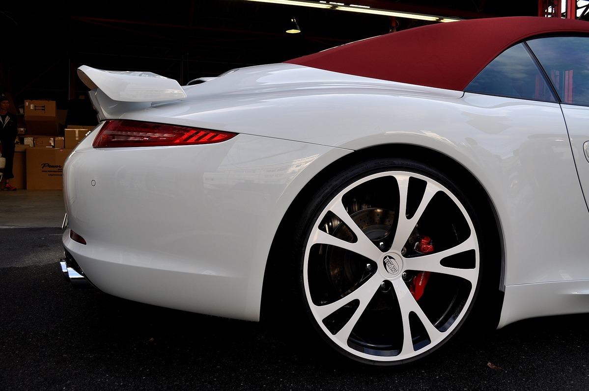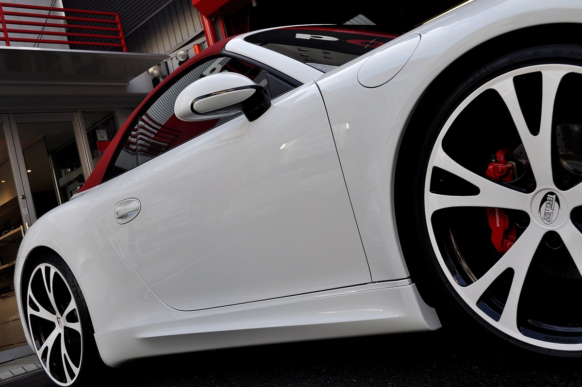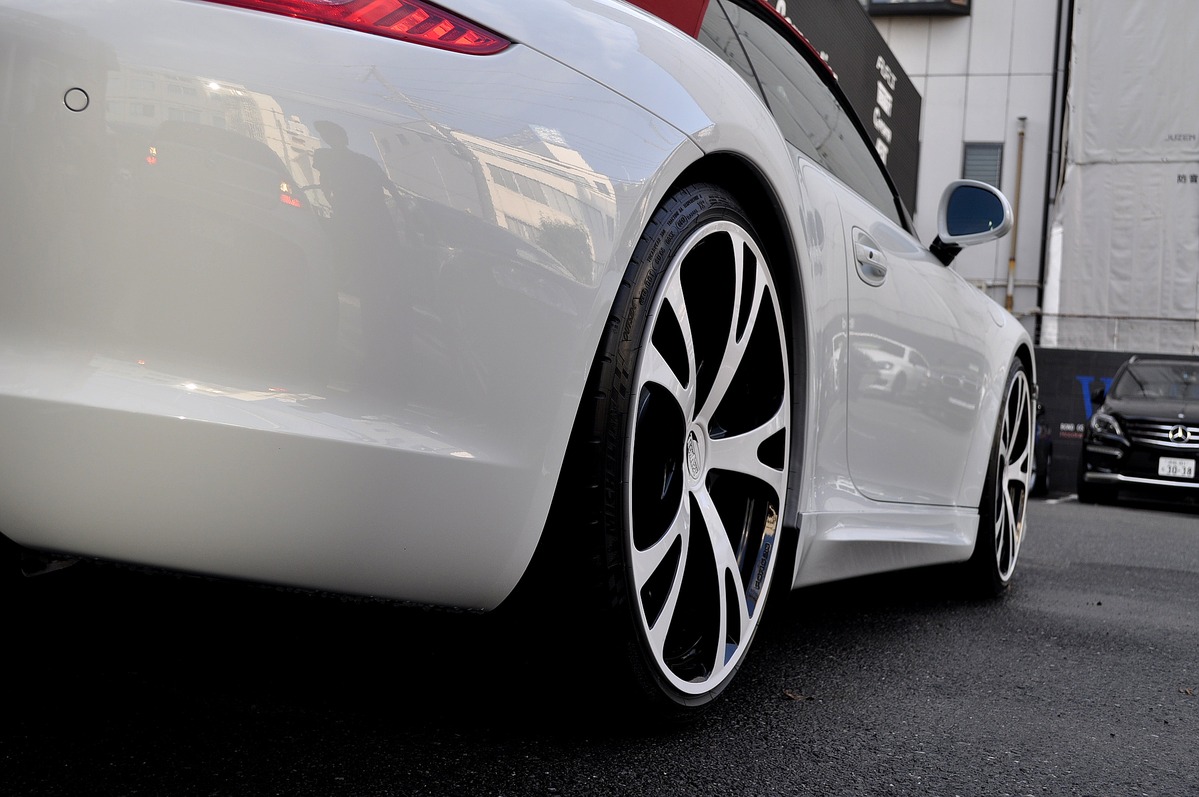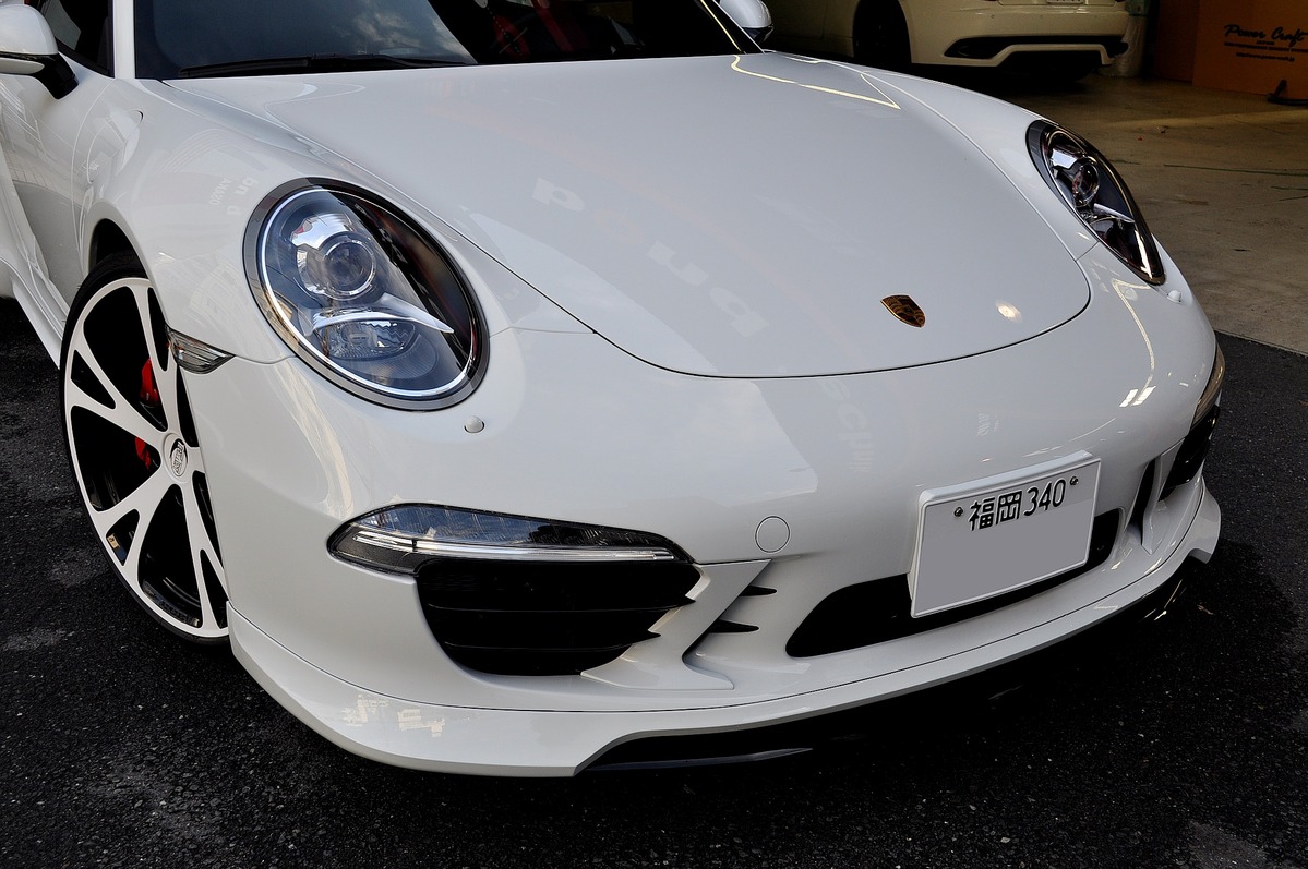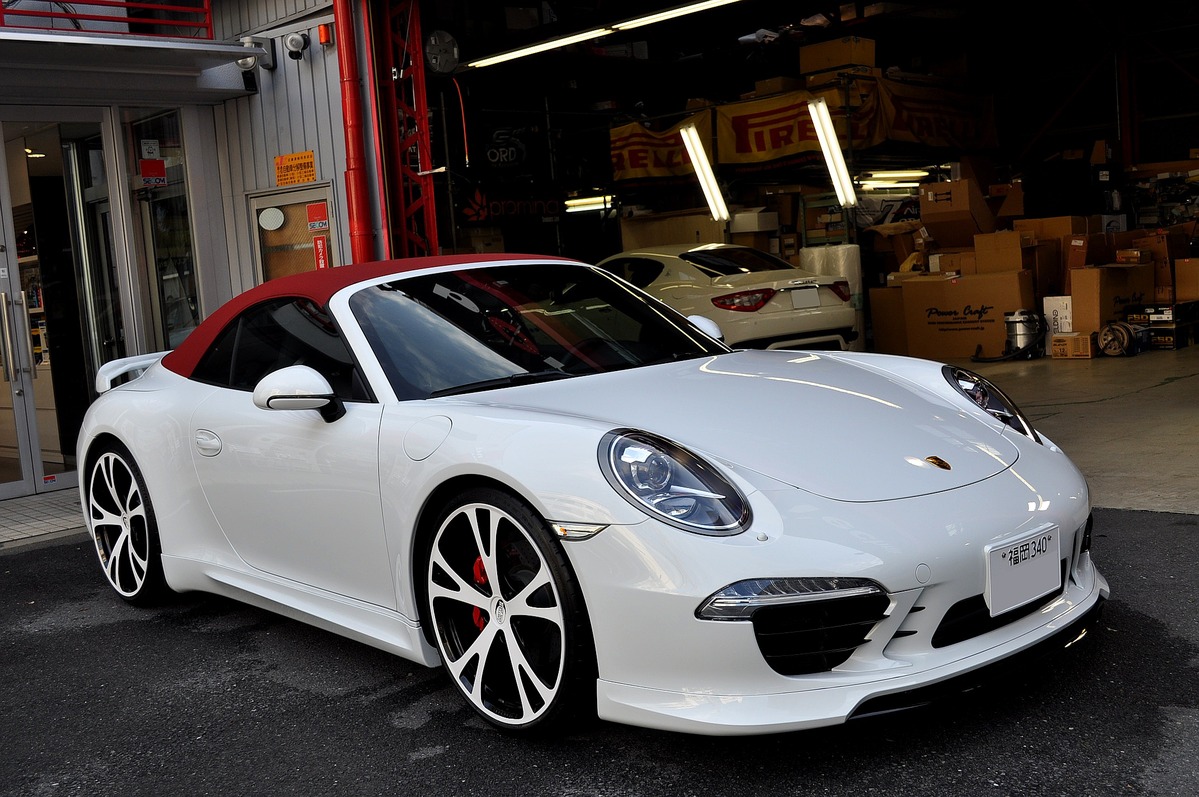 今天帶給各位一部由日本改裝廠Bond Osaka所操刀的白色塗裝、紅色頂篷Porsche 991 Carrera S Cabriolet敞篷跑車,外觀選用來自御用品牌Techart的空力套件,包含前下巴、側裙組、後下擾流板與後擾流尾翼等部品,輪圈則是換裝21吋Techart、型號Formula III的輕量化輪圈,搭配前245/30R21、後305/25R21的高性能跑胎,再將圈面施以亮面黑白雙色烤漆處理,另外透過H&R短彈簧的換裝將車身降低,營造出貼地飛行的優雅跑格。動力部分,Bond Osaka替這部德國上空跑車換裝Techart高性能排氣管以強化輸出效率,其餘則是維持原廠設定。另外,Bond Osaka捨棄原廠觸控式PCM中央螢幕,改以Clarion多功能影音系統替代,同時新增倒車攝影功能,實用性與質感皆有所提升。