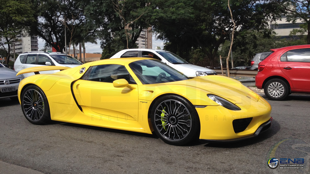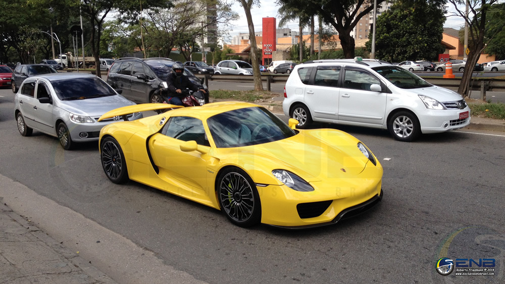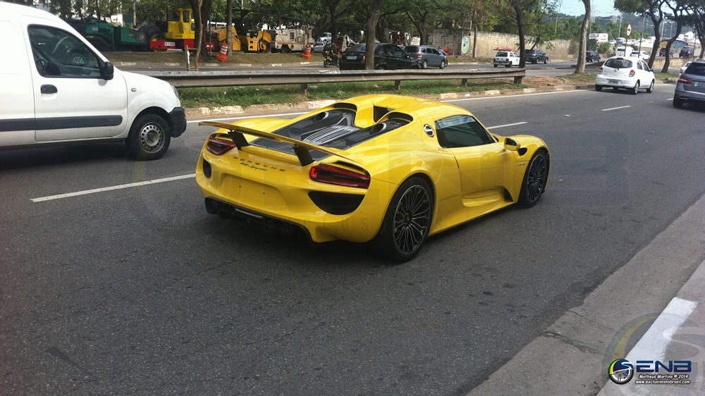 今天帶給各位由網友Exclusivos no Brasil於巴西(Brazil)街頭所擄獲的黃色塗裝Porsche 918 Spyder,而塞在車陣中的它正以純電模式行駛,因此幾乎沒有噪音產生,相當特別。黃色圖裝配在這部新世代油電混合超跑身上,各位覺得如何?