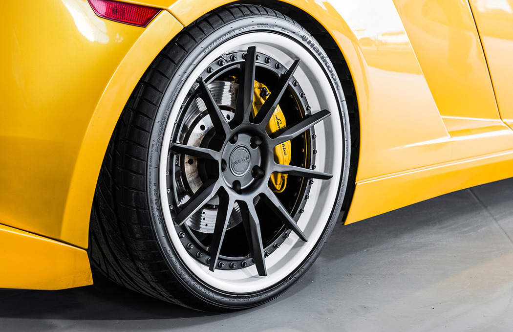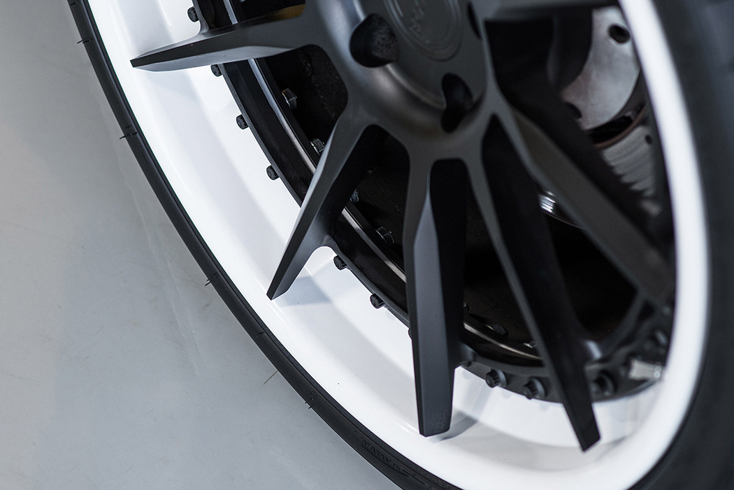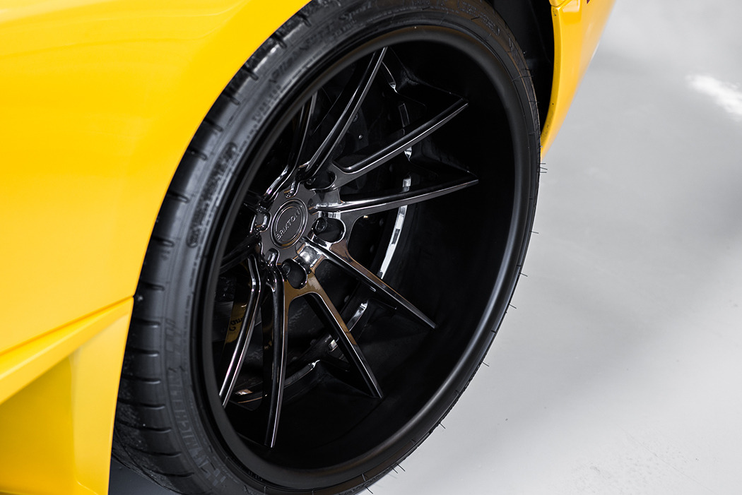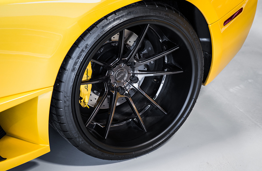 當年身為Lamborghini旗下V12旗艦超跑的Lamborghini Murcielago LP640選用來自Brixton Wheels、Monaco系列、型號M51的輕量化輪圈,圈面採用消光黑色塗裝,尺寸為前19x8.5J、後20x13J的前後配設定,搭配Michelin高性能跑胎,再透過短彈簧將車身降得低趴,霸氣十足。