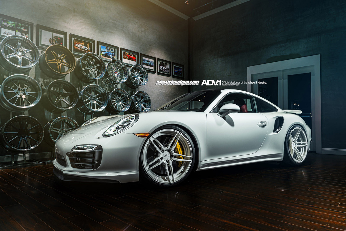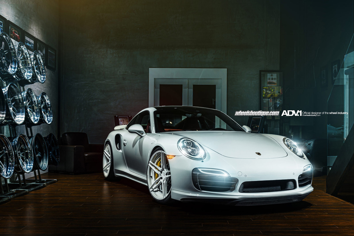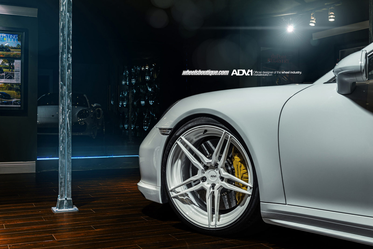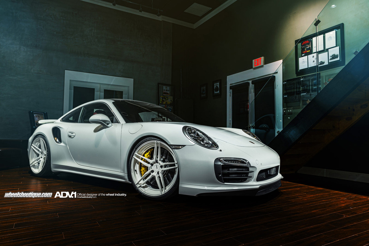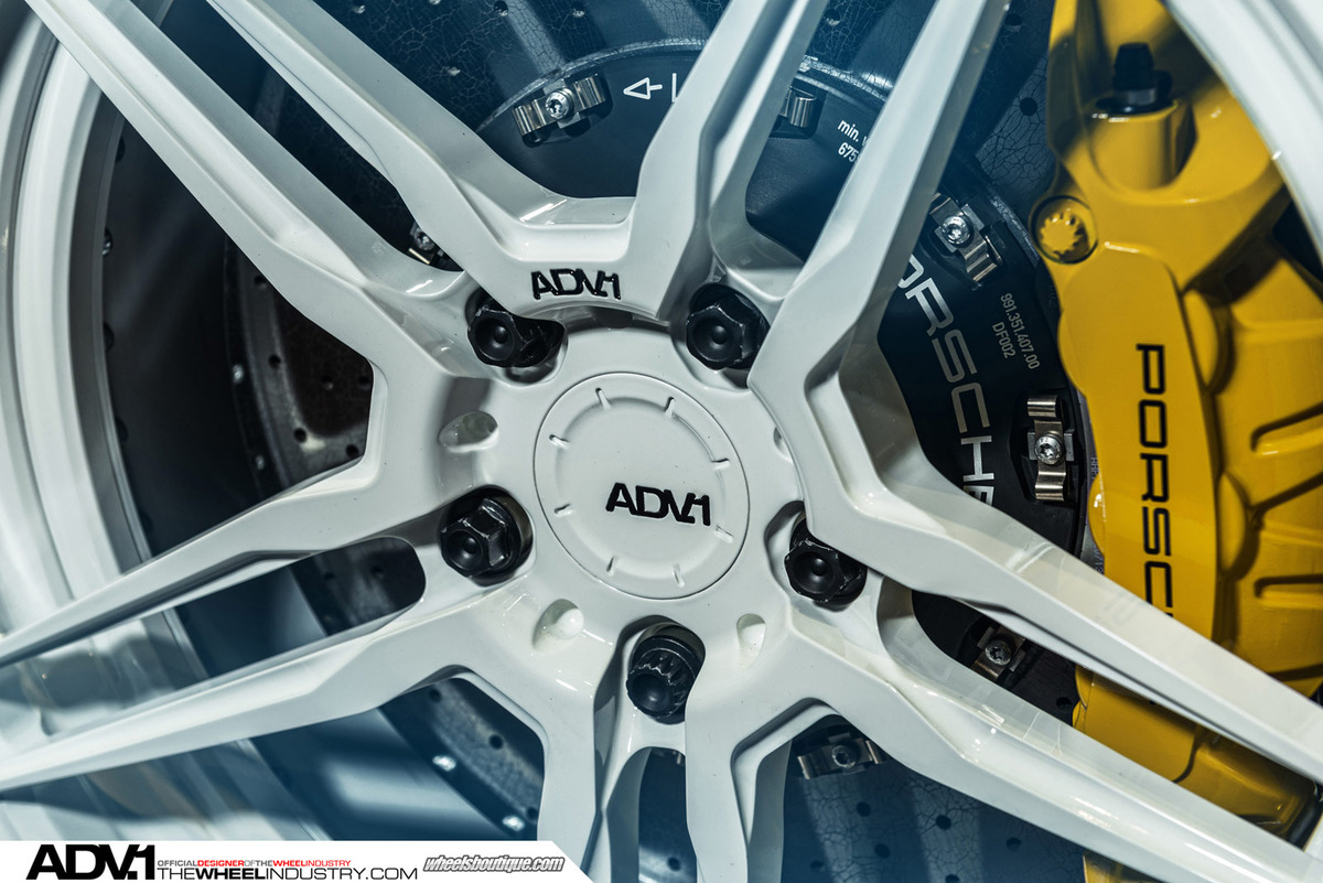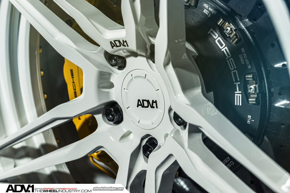 今天帶給各位一部由輪圈品牌ADV.1 Wheels所推出的白色塗裝Porsche 991 Turbo S,除了換裝高低軟硬可調式避震器組將車身降低外,另外選用ADV.1 Wheels、型號ADV05 MV2 CS的輕量化新款輪圈,四輪皆採用尺寸21x9.5J的規格,圈面與車身採用同色烤漆,營造出極具整體性的奔放跑格。