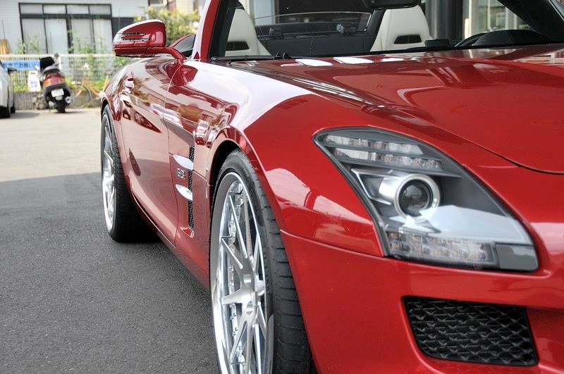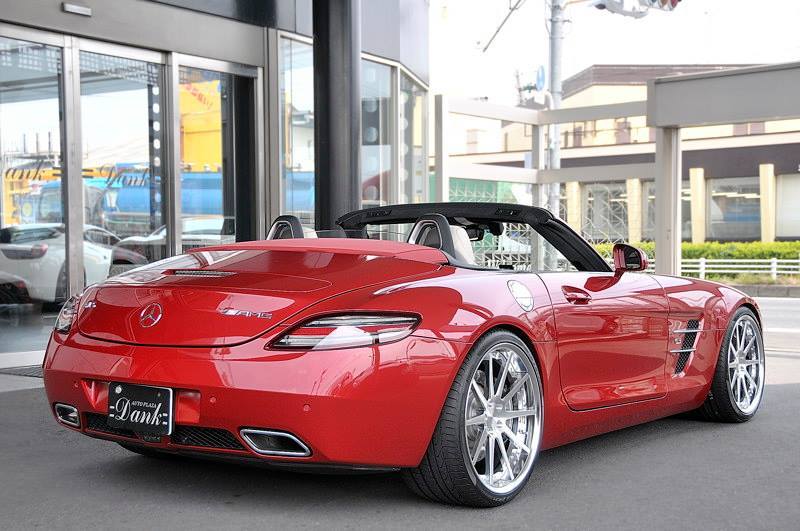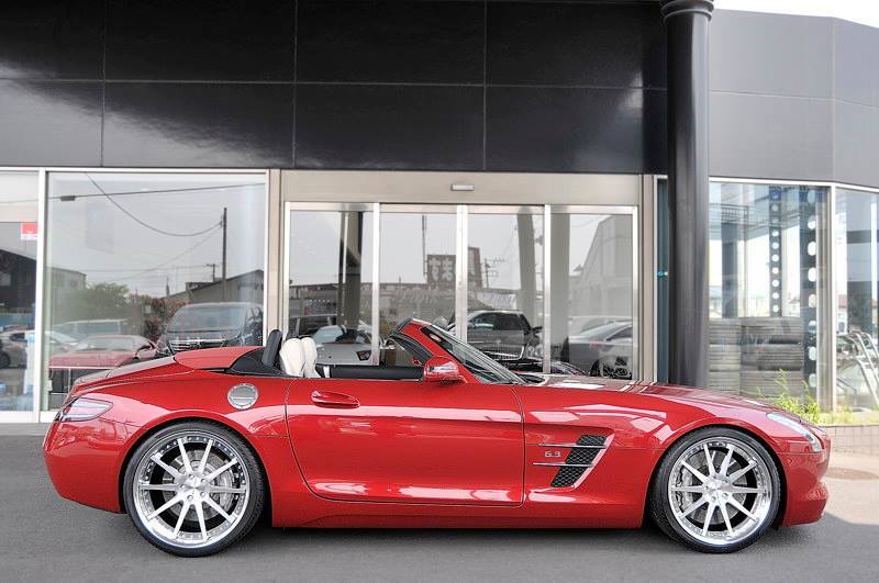 今天帶給各位的是一部由日本知名車商Auto Plaza Dank所提供的紅色塗裝Mercedes Benz SLS AMG Roadster,選用來自Hyper Forged Wheels、型號HF-C10的電鍍拋光輪圈,尺寸為前20x10J、後21x12J的前後配設定,搭配前275/30R20、後325/25R21的Pirelli P Zero高性能跑胎,再換裝高低軟硬可調式避震器組將車身降低,讓這部紅色、米黑雙色內裝配置的敞篷版本SLS AMG,在即使沒有經典鷗翼車門的情況下,依舊展現出濃烈的高質感跑格。