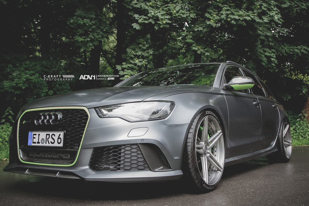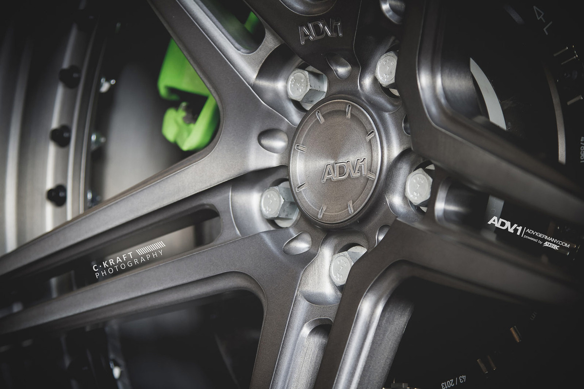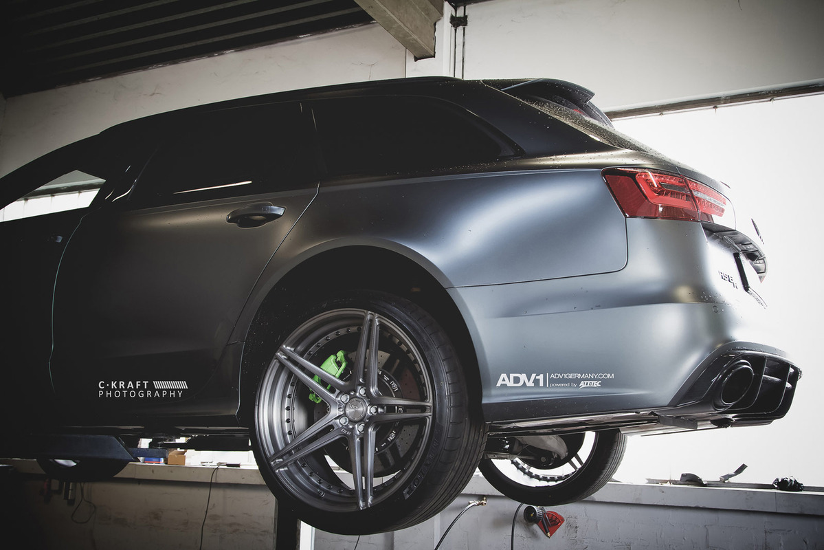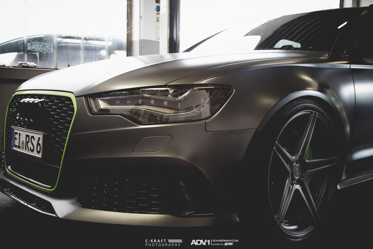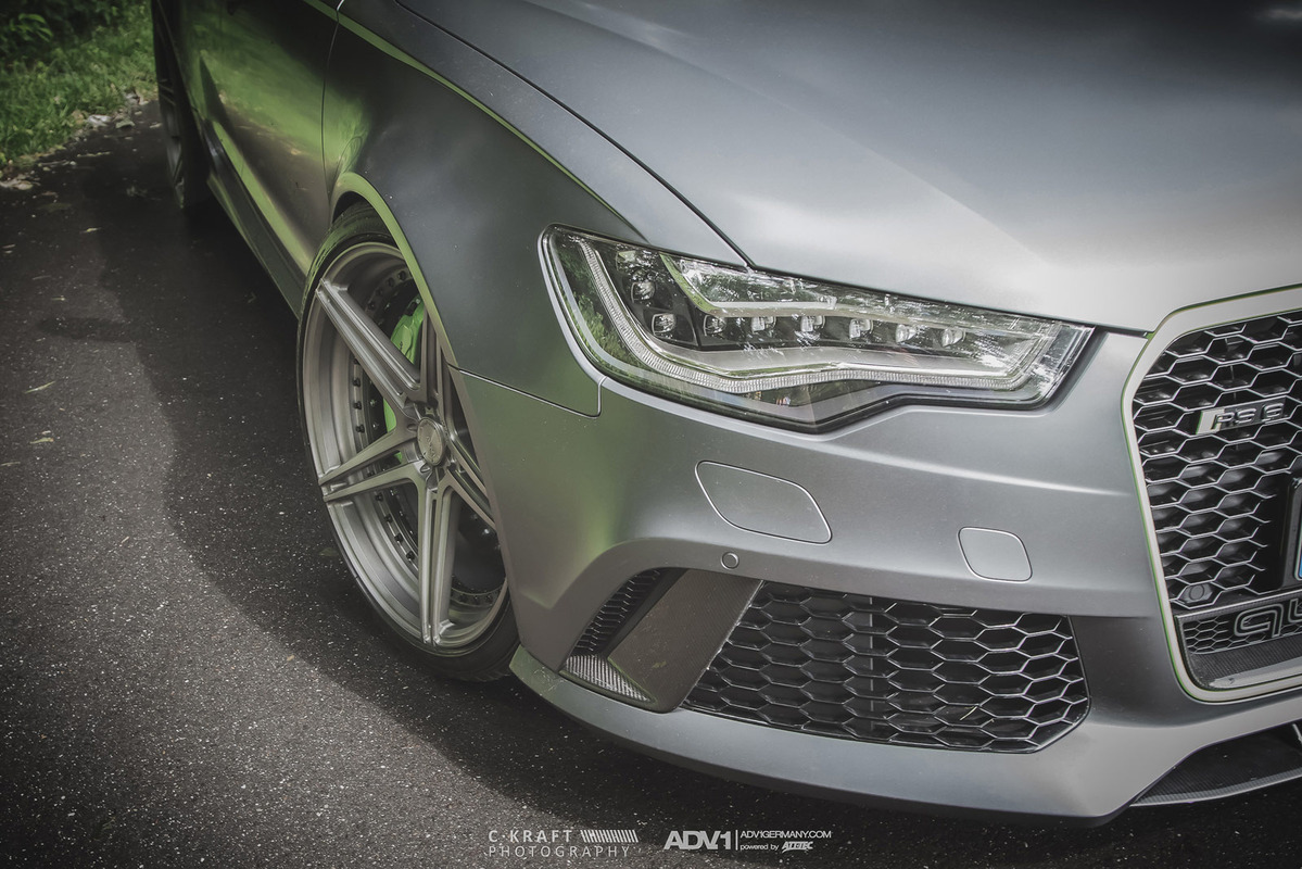 今天帶給各位的是由輪圈品牌ADV.1 Wheels所提供的消光灰色Audi C7 RS6 Avant,換上ADV.1 Wheels、型號ADV05 MV2 SL的輕量化版本輪圈,圈面施以消光槍灰色塗裝,並將水箱罩周邊、後視鏡下緣與原廠AUDI CERAMIC陶瓷碳纖煞車系統的煞車卡鉗等處施以顯眼的亮綠色處理,而為了維護Quattro四輪驅動系統的平衡性,採用前後同為21x10.5J的規格搭配Dunlop高性能跑胎,展現出質感與動感兼具的霸氣風格。