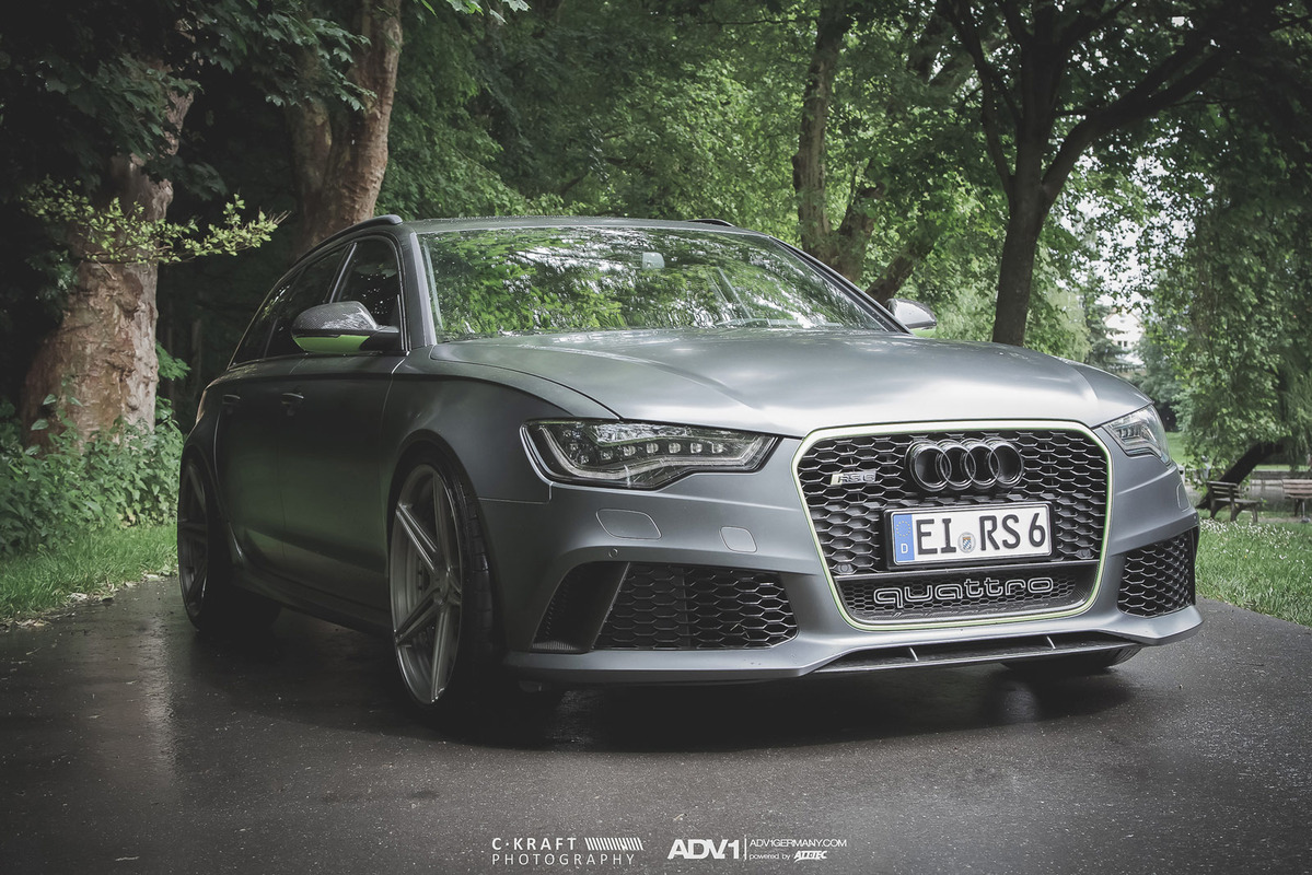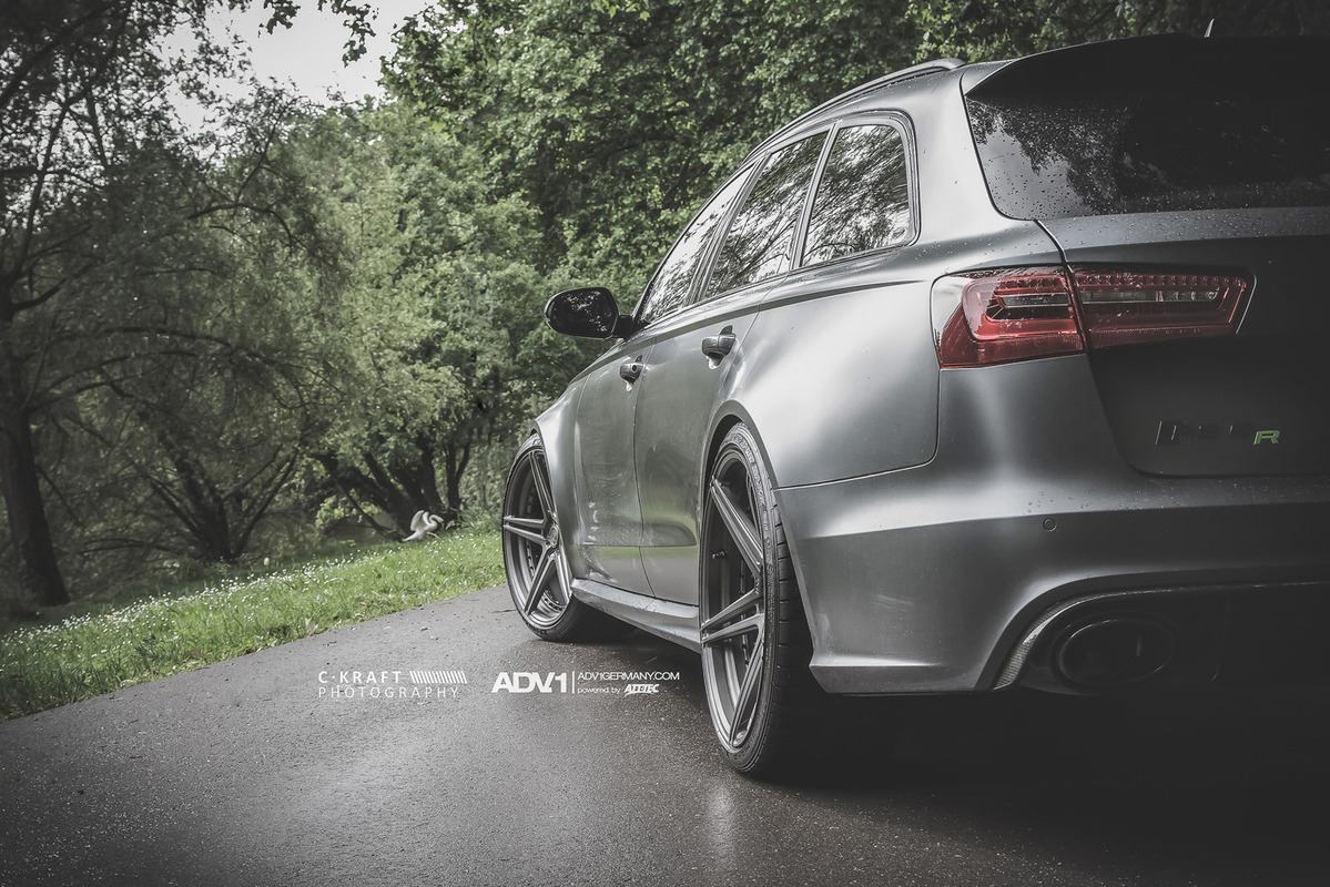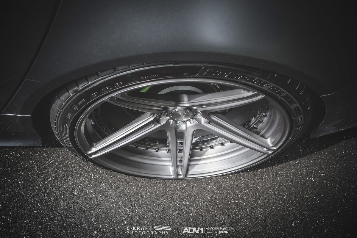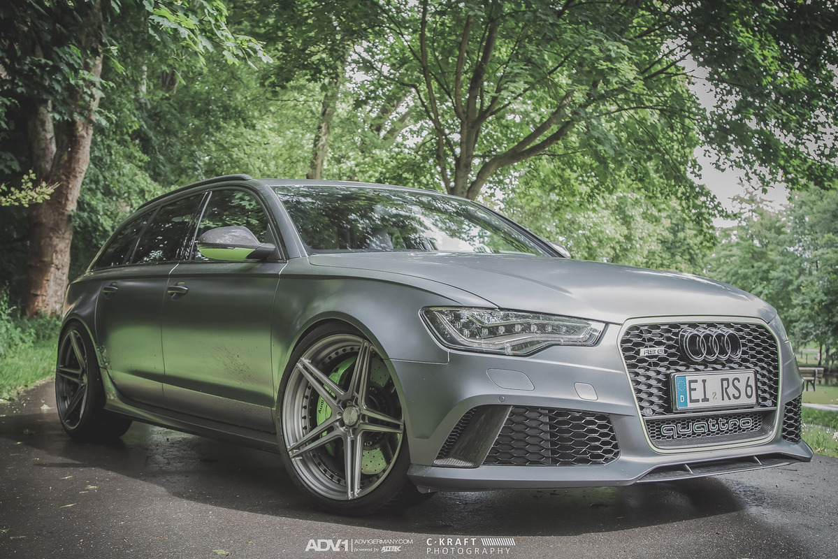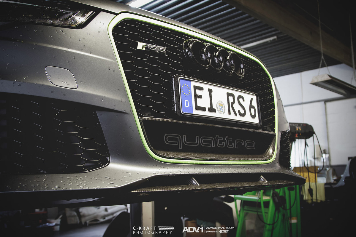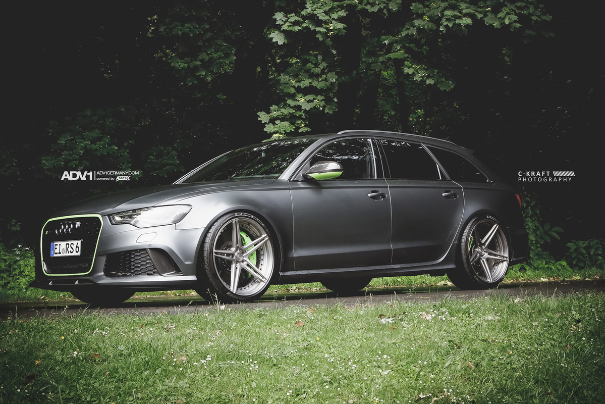 今天帶給各位的是由輪圈品牌ADV.1 Wheels所提供的消光灰色Audi C7 RS6 Avant,換上ADV.1 Wheels、型號ADV05 MV2 SL的輕量化版本輪圈,圈面施以消光槍灰色塗裝,並將水箱罩周邊、後視鏡下緣與原廠AUDI CERAMIC陶瓷碳纖煞車系統的煞車卡鉗等處施以顯眼的亮綠色處理,而為了維護Quattro四輪驅動系統的平衡性,採用前後同為21x10.5J的規格搭配Dunlop高性能跑胎,展現出質感與動感兼具的霸氣風格。