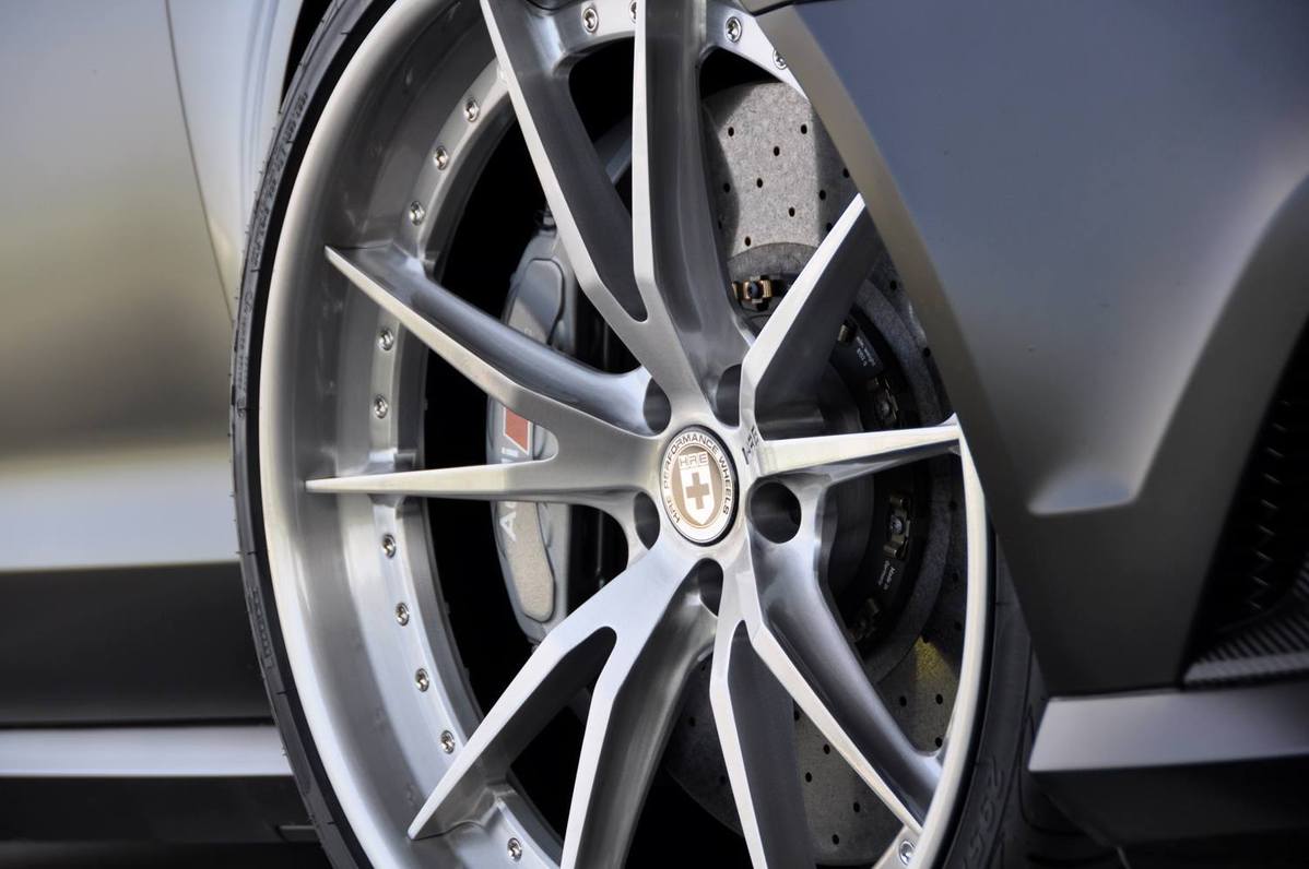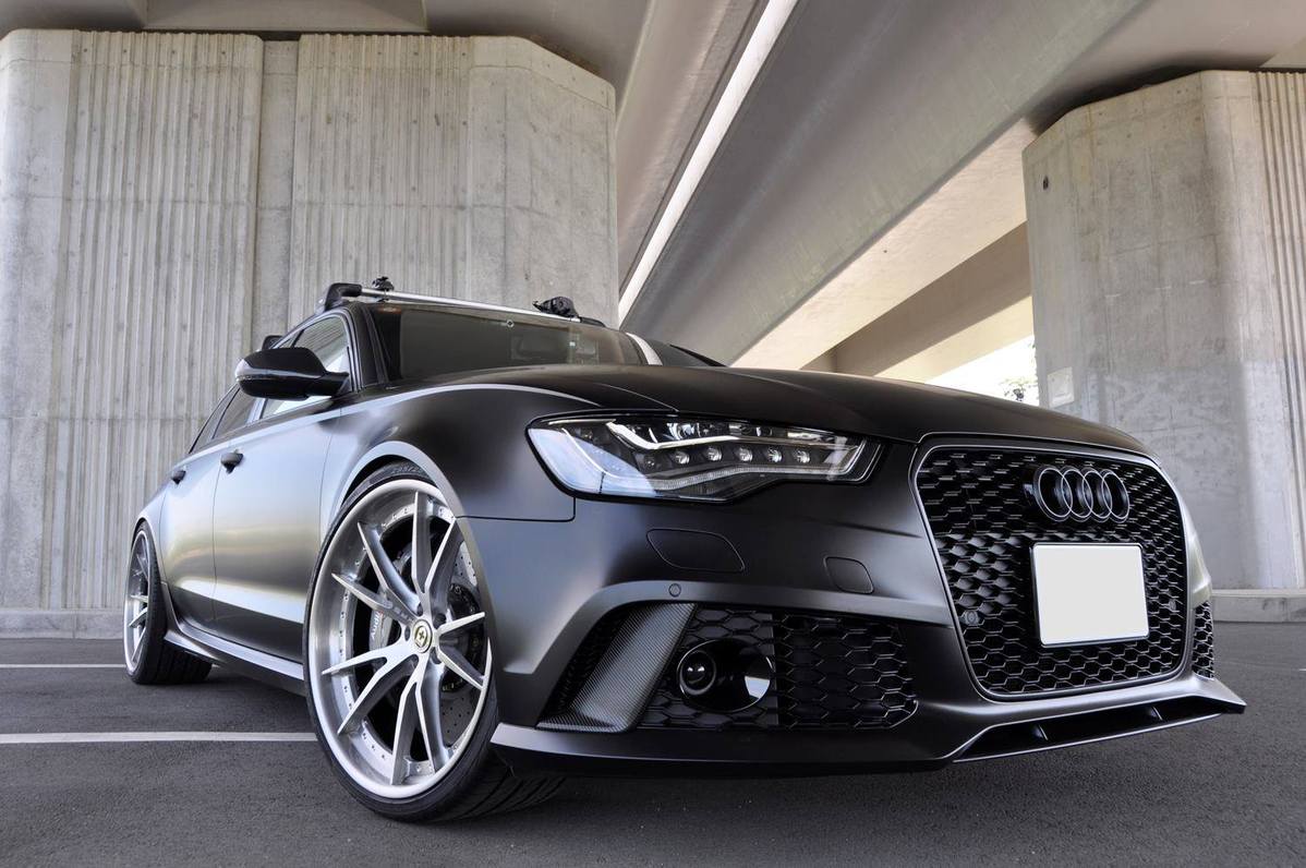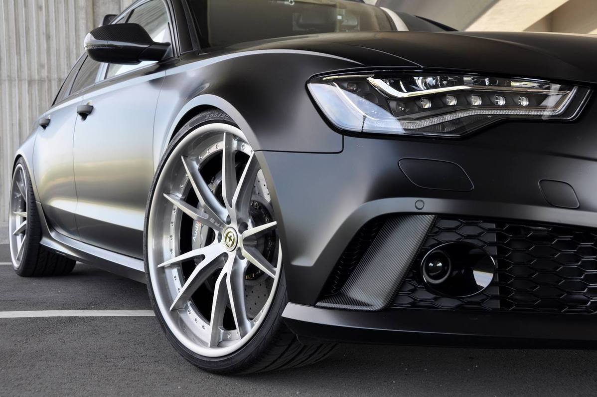 眼前這部消光黑色塗裝的Audi C7 RS6 Avant選用知名品牌HRE Performance Wheels出品、型號S104的輕量化輪圈搭配Pirelli高性能跑胎,圈面採用獨特的金屬銀色烤漆覆蓋,搭配HRE特製碳纖維中心蓋,烘托出原廠陶瓷碳纖煞車卡鉗之美,另外換裝RS6專用短彈簧將車身降低,讓這部德國高性能旅行車更具動感。