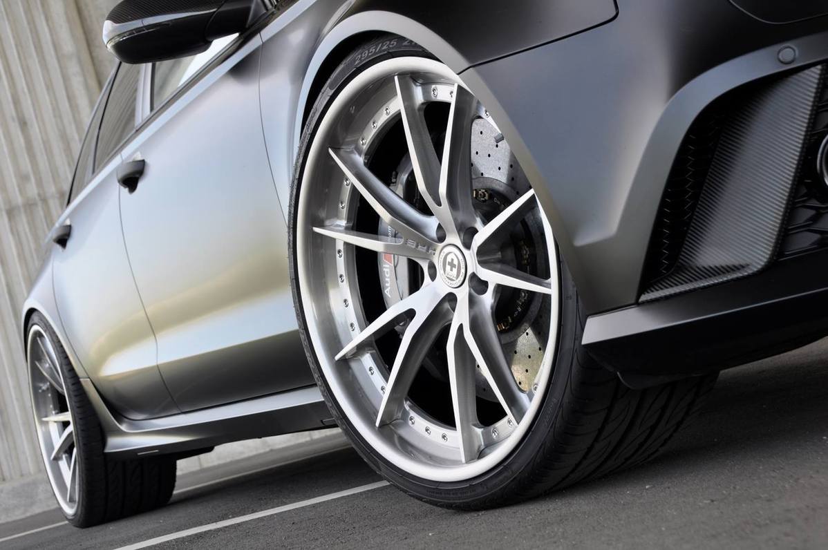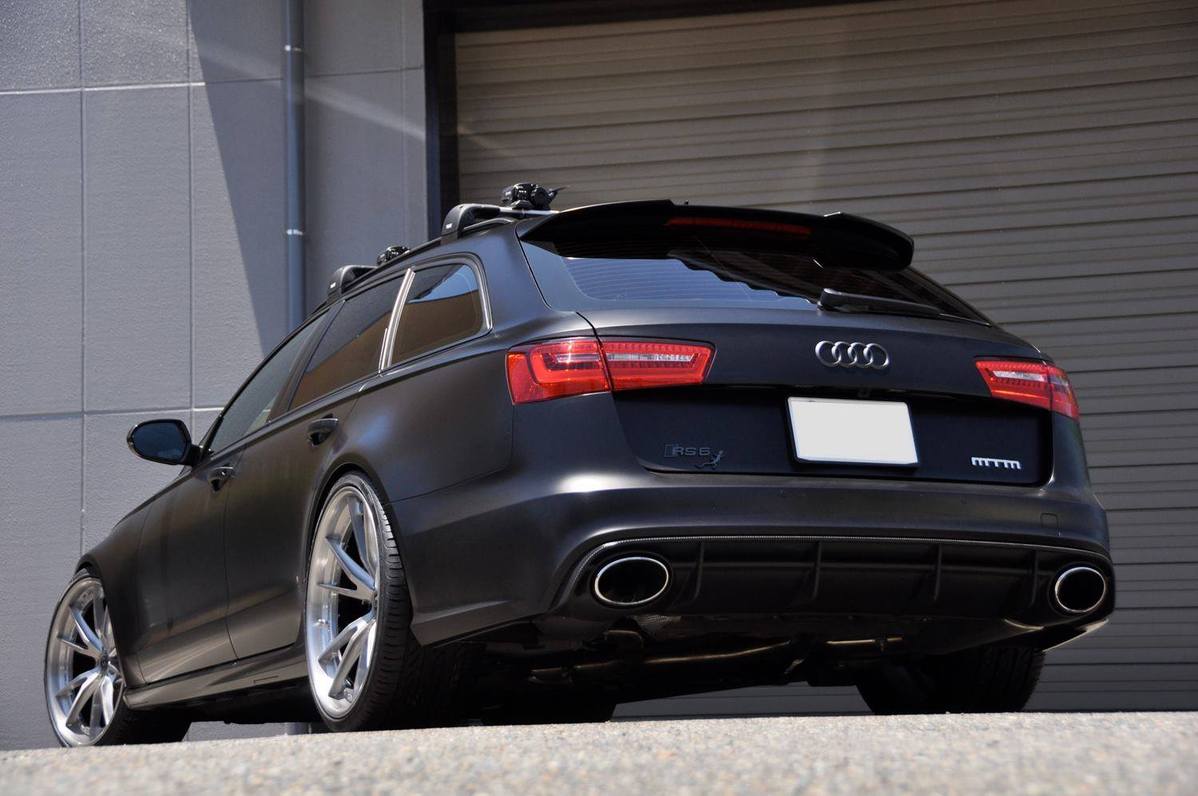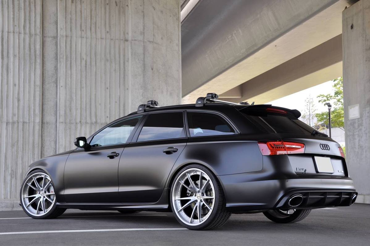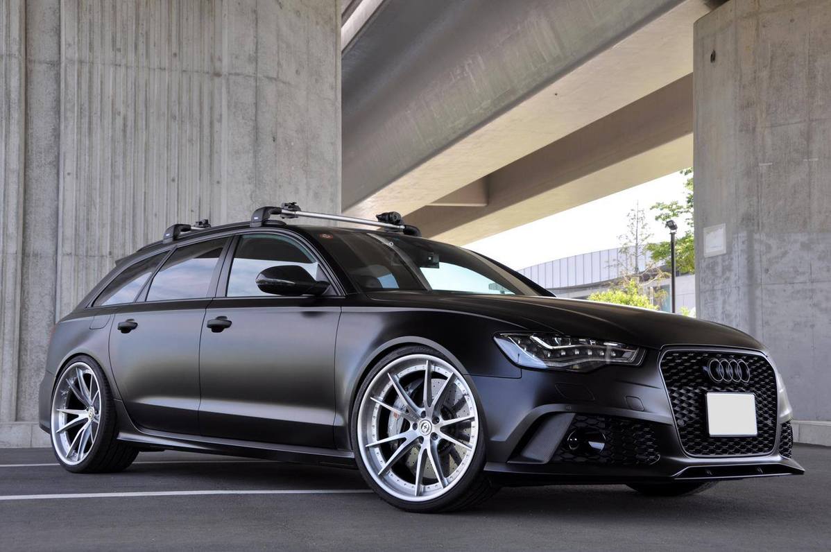 眼前這部消光黑色塗裝的Audi C7 RS6 Avant選用知名品牌HRE Performance Wheels出品、型號S104的輕量化輪圈搭配Pirelli高性能跑胎,圈面採用獨特的金屬銀色烤漆覆蓋,搭配HRE特製碳纖維中心蓋,烘托出原廠陶瓷碳纖煞車卡鉗之美,另外換裝RS6專用短彈簧將車身降低,讓這部德國高性能旅行車更具動感。
