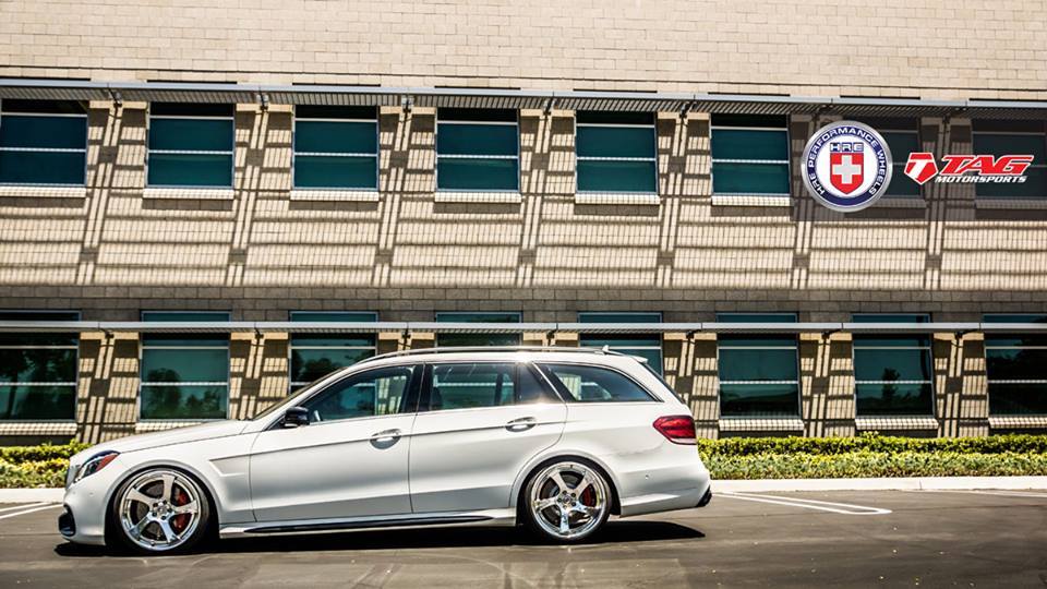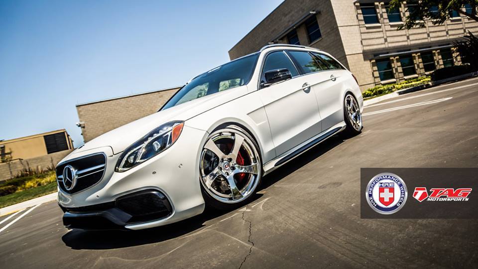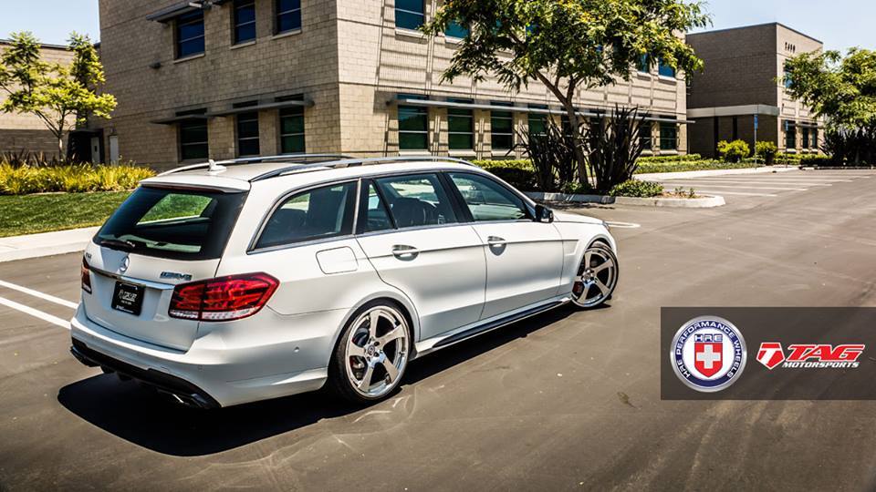 跟四門版本同步,Estate五門旅行版本的Mercedes Benz E63 AMG在今年出現小改款車型,同時新增4MATIC四輪驅動的S-Model,將原本列為選配的AMG Performance Package性能提升套件一併奉上,搭載5.5升V8雙渦輪增壓引擎,最大馬力可達577HP,相當強悍。除了性能方面的精進外,全新設計的LED頭燈組與嶄新風貌的專屬AMG空力套件等,更是賦予這部高性能旅行車更成熟內斂的高質感扮相,也讓喜好視覺改裝的車主們能有所新發揮。今天帶給各位的便是一部剛從改裝廠TAG Motorsport駛出的白色塗裝2014年Mercedes Benz E63 AMG Estate,選用知名品牌HRE Performance Wheels剛推出、型號RS102的新款輪圈,圈面採用拋光處理,另外藉由換裝高低軟硬可調式避震器組將車身降低,展現出修長霸氣的跑格。