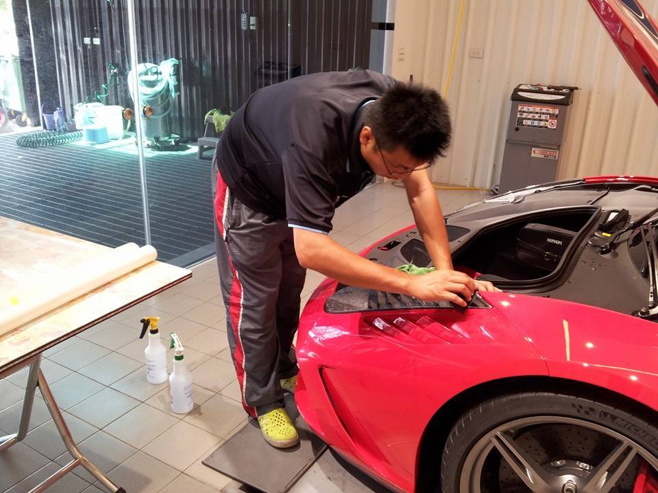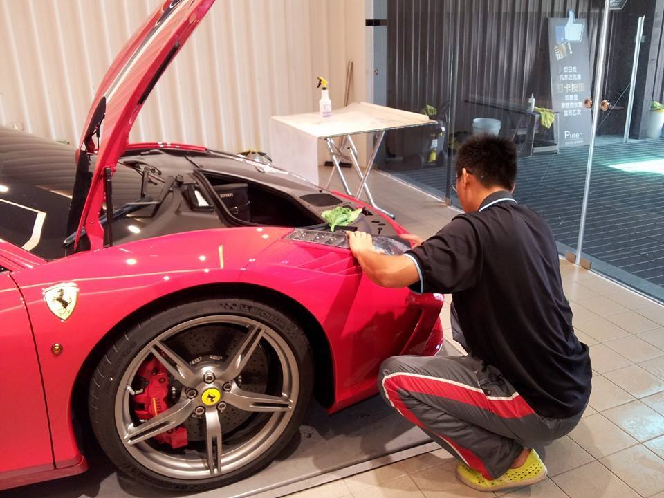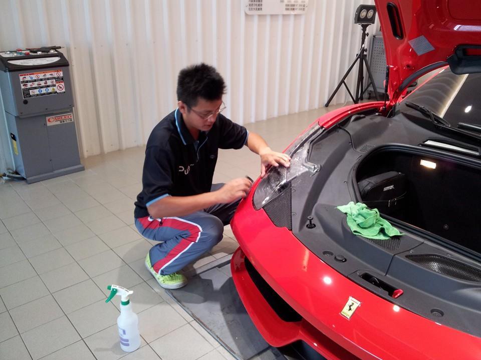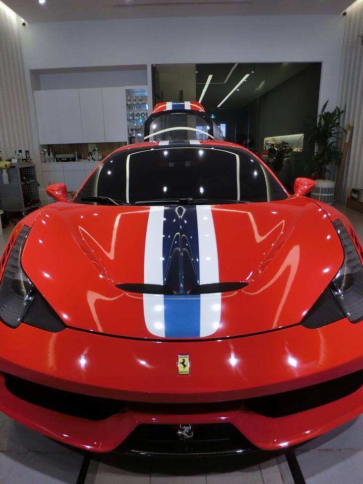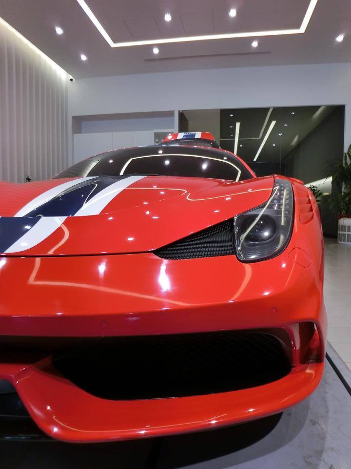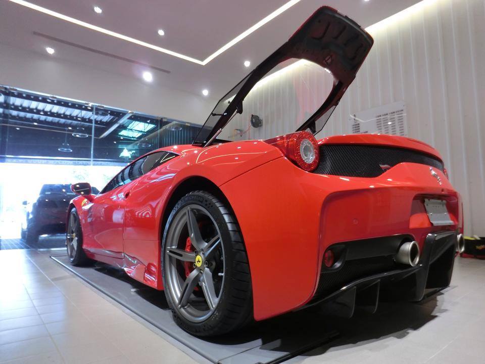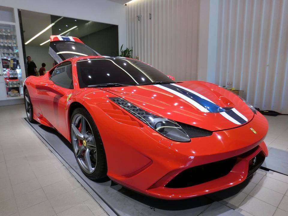 在本地Ferrari代理商台灣蒙地拿(Modena Motori Taiwan)的積極努力下,標準紅色塗裝的Ferrari 458 Speciale測試車已在數個月前抵達台灣,而先前首部顧客的Ferrari 458 Speciale也以黃色塗裝在台北(Taipei)上路行駛,現在南部地區的高雄(Kaoshiung)更添第一部即將交出的Ferrari 458 Speciale。這部即將交到貴客手中的Ferrari 458 Speciale採用與官方發表時相同的紅色塗裝與藍白NART車身飾條,輪圈則與測試車的消光黑色不同,選擇的是槍灰色版本,搭配紅色塗裝煞車卡鉗,質感極佳。該車日前被送到高雄專業店家Pure純粹自私車體美學進行交車前的美容工程,同時貼上保護車漆的犀牛皮,而該店家也是南部超級跑車玩家最推薦的專業汽車美容廠之一。