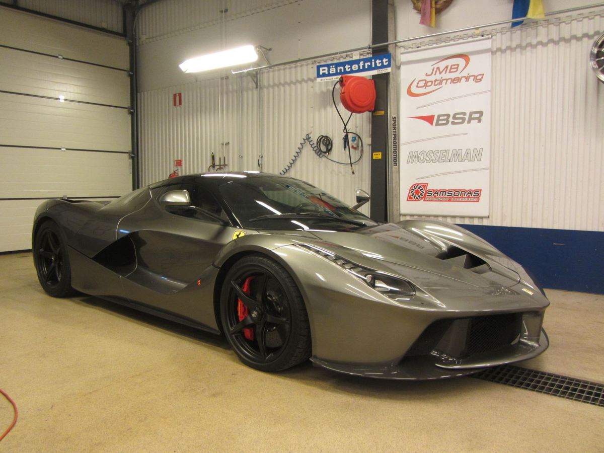 眼前這部Grigio Silverstone鐵灰色塗裝的Ferrari LaFerrari在外觀配色方面選擇走低調路線,然而動力部分車主卻企圖成為全球最速的LaFerrari。該部售價上千萬的超級跑車也是前天才與各位分享、剛抵達瑞典(Sweden)的其中一部LaFerrari,而該位車主僅試開幾圈後,便將愛車帶到當地改裝廠JMB-Optimering諮詢動力提升方案。動力部分,原廠Ferrari LaFerrari搭載6.3升V12汽油引擎與電動馬達,汽油引擎部分能於9,000rpm時提供800HP馬力與71.4kgm扭力,電力部分則是能貢獻163HP馬力與27.5kgm扭力,使得它的綜效最大馬力達到963HP,百里加速僅需不到3秒、由靜止加速至時速300km/hr不須15秒、極速超過350km/hr,業已相當兇猛,然而根據改裝廠JMB-Optimering的說法,他們透過電腦程式的精密改寫,修正供油與點火曲線,保守估計能將這部強悍烈馬提升至1,050HP,同時維持引擎正常運作。那麼,等他們完工後,這部低調扮相的Ferrari LaFerrari便會是全球最速的LaFerrari!