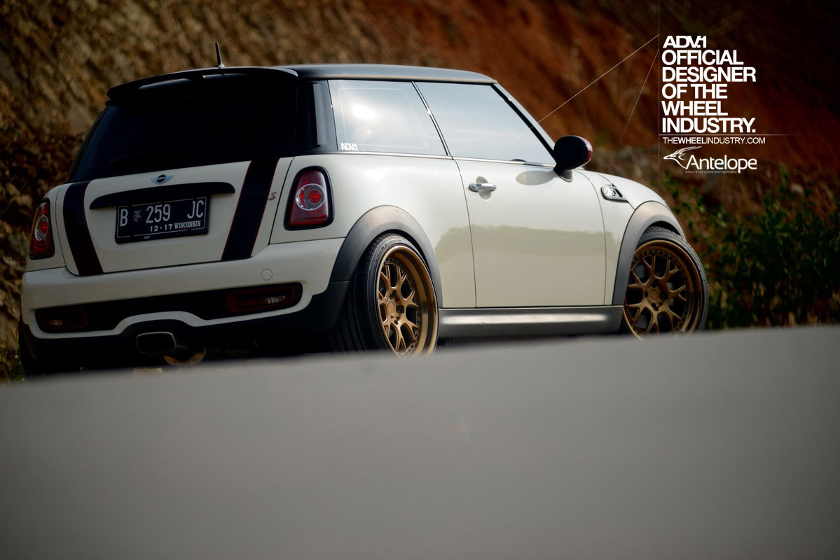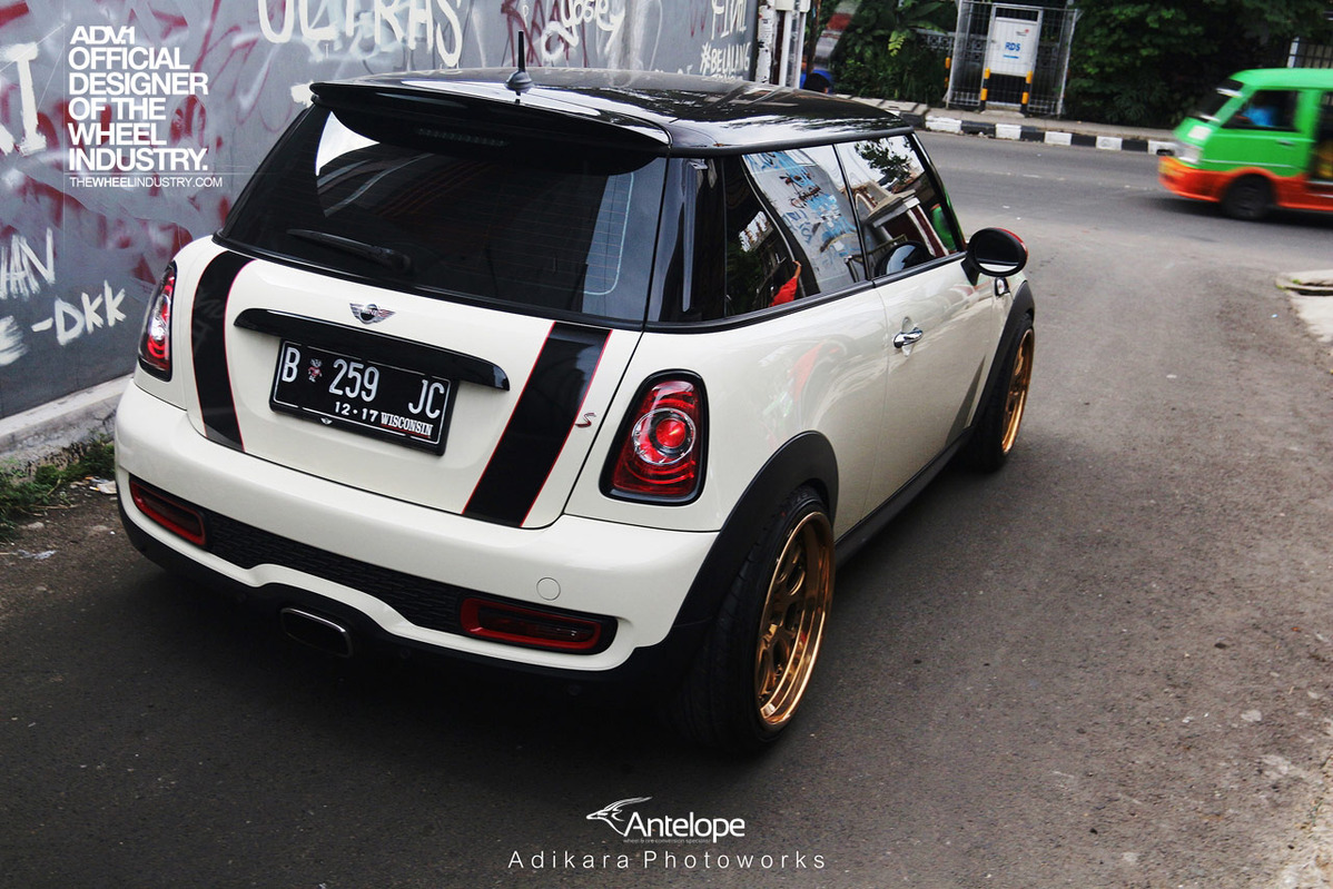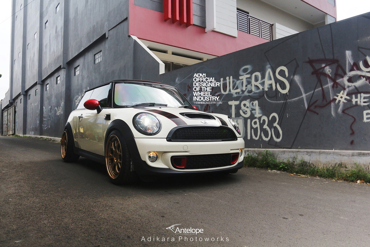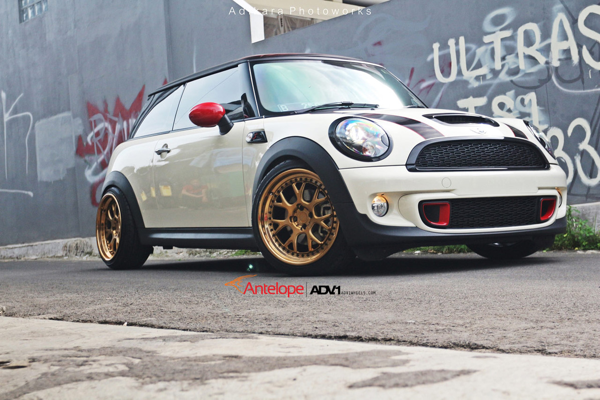 即使在F世代全新Mini車系已經問世後,R56世代的Mini依然頗受改裝車迷的歡迎,今天帶給各位的則是由改裝廠Antelope Ban所操刀的乳白色塗裝R56 Mini Cooper S,引擎蓋與後行李箱蓋貼有黑色紅邊的車身飾條,並將後視鏡蓋與前後保桿氣壩局部施以紅色處理,輪圈則是選用由ADV.1 Wheels特別訂製的4孔100規格產品,型號為ADV7 TF SL,尺寸為前18x8.5J、後18x9.5J,圈面採用消光與拋光兩種銅色塗裝交織而成,讓這部Mini Cooper S即使沒有原廠JCW空力套件的加持,也顯得獨具風格。