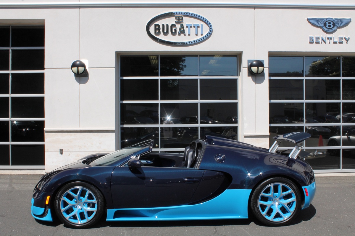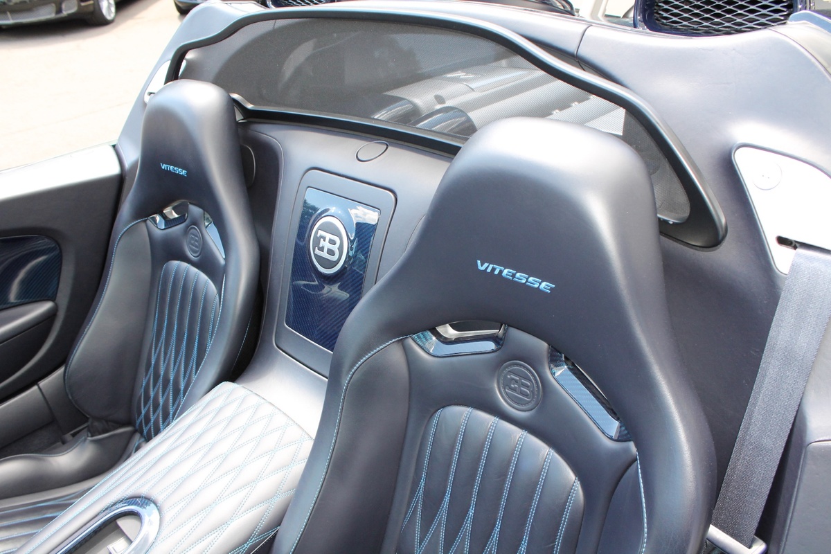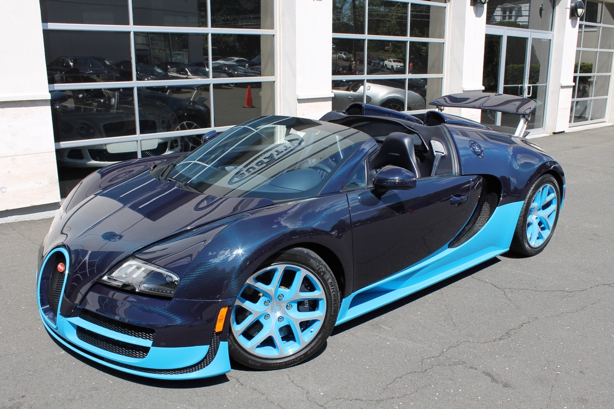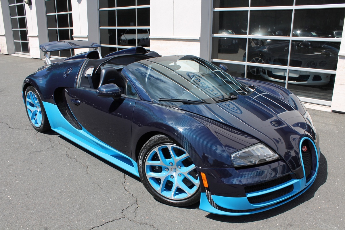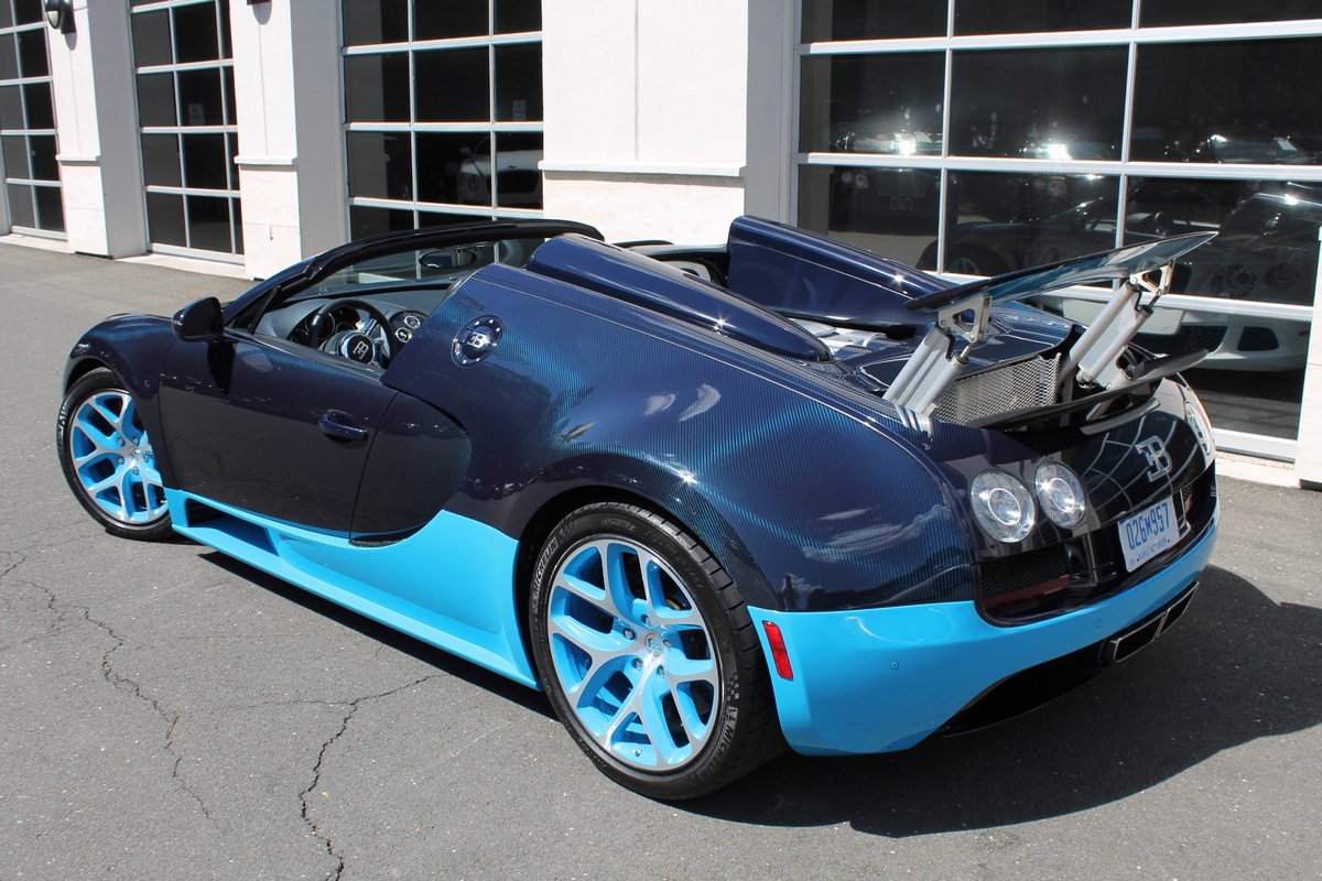 另外一部Bugatti Veyron Grand Sport Vitesse則是與出現在電影變形金剛四(Transformers 4)當中的雷同,採用深淺兩種藍色交織而成的特殊塗裝,唯獨深藍色部分為碳纖維紋路,而該部2012年出廠的Veyron Grand Sport Vitesse在過去曾擔任Bugatti經銷商的試乘車與公關活動用車,因此在它僅兩年的生命中,里程數便累積了1.5萬英里,以這類超級跑車來說,算是相當高。