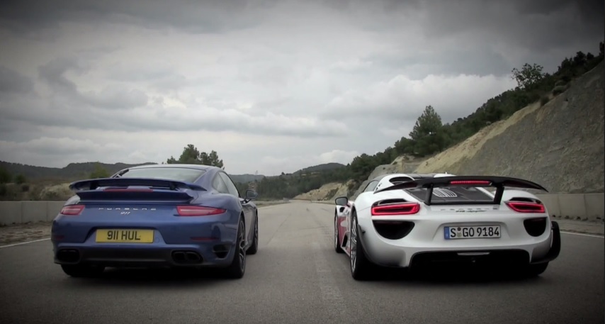 知名汽車媒體Top Gear所拍攝的汽車節目幾乎是車迷們必看的片段之一,而由於收視率與廣告效果極高,全球各大車廠大都願意將最新上市的車款借給他們拍攝與試駕,甚至是主動安排媒體採訪行程。因此,若要目睹最新車種的捉對廝殺畫面,鎖定Top Gear絕對不會敗興而歸。現在,Top Gear策畫團隊找來Porsche兩大性能旗艦進行同門纏鬥,而他們分別是油電混合超級跑車Porsche 918 Spyder與渦輪增壓旗艦Porsche 991 Turbo S!身為當今品牌最頂尖車種,Porsche 918 Spyder搭載4.6升V8引擎,另外在前軸與後軸分別裝上一顆電動馬達,並且能夠切換獨立或合力運作等模式,達到887HP的最大綜效馬力值,改良型的Porsche Doppel Kupplung (PDK)七速雙離合器變速箱則是擔綱後輪的動力傳輸。 進階版本的Porsche 918 Spyder配有原裝Weissach Package運動套件,在原廠施以輕量化工程而減重36公斤、配有鋁鎂合金輪圈、部分鈦合金材質煞車系統與碳纖維拉桿的助益下,百里加速僅需2.6秒便可完成,較普通版本快上0.2秒,由靜止加速至時速200km/hr也僅需7.2秒(較普通版本快0.5秒)、衝刺到時速300km/hr也僅需19.9秒(比普通版本快2.1秒),顯然是預算足夠的買家必定選配的高性能套件。同時,於德國紐柏林賽道(Nurburgring Nordschleife)創下6分57秒佳績便是一部配有Weissach Package的Porsche 918 Spyder,而以下影片中的918 Spyder便是配有Weissach Package的進階版本。另外,同台登場的Porsche 991 Turbo S也不是省油的燈,搭載3.8升水平對臥六缸、雙渦輪增壓引擎,最大馬力可達560HP,扭力峰值達到72.4kgm,百里加速僅需3.1秒便可完成、由靜止加速至時速200km/hr僅需10.3秒,極速上看320km/hr。兩部Porsche車款的精采較勁會擦出什麼火花?趕緊來觀賞最後結果!