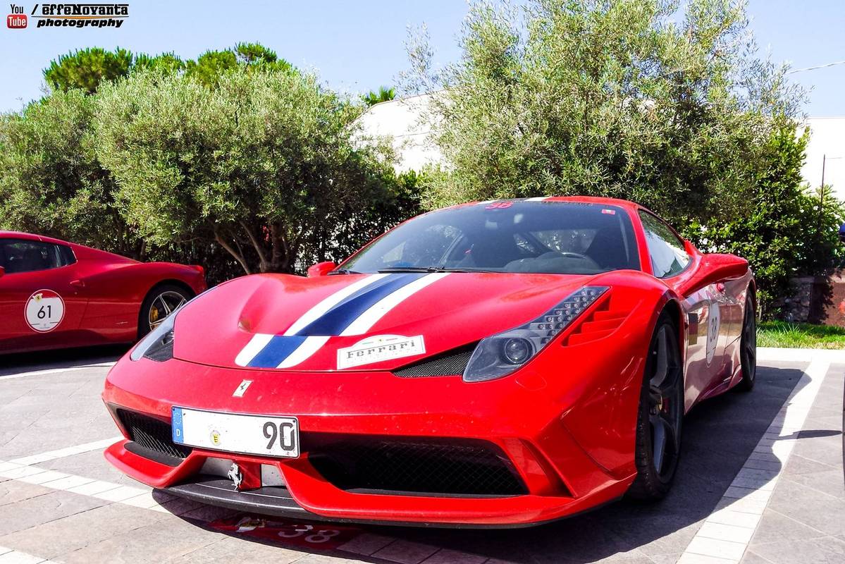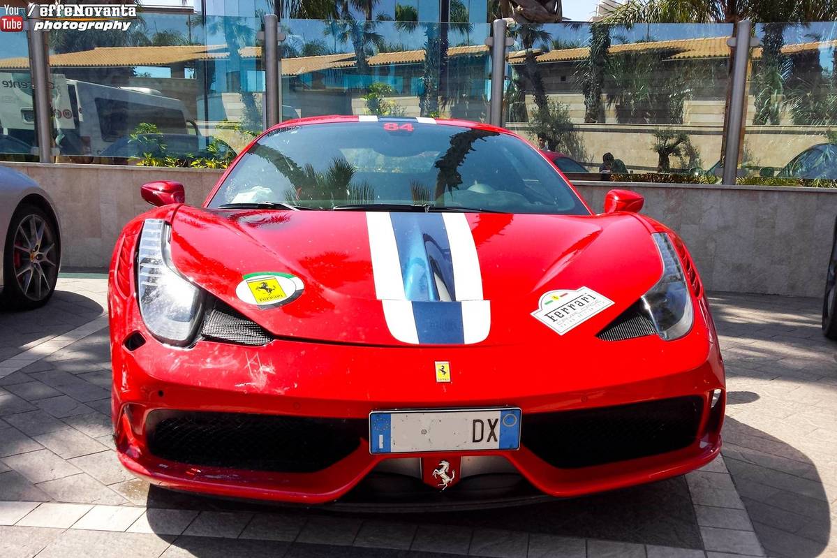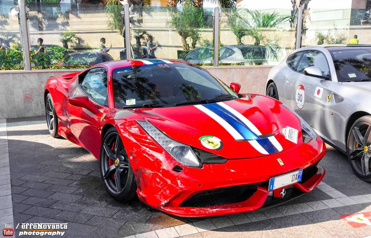 在這場由Ferrari官方所舉辦的路跑盛會活動當中,自然聚集了多部平常較罕見的稀有經典跑車與最新上市的頂尖車款,包含三部油電混合超級跑車Ferrari LaFerrari、多部全球限量599部的Ferrari 599 GTO、數部各有特色的Ferrari F12 Berlinetta、超過六部的Ferrari 458 Speciale與多輛Ferrari 458 Italia,而當中有部紅色Ferrari 458 Speciale在彎道中不慎擦撞到右前車頭,不過所幸沒有傷及主體結構,僅算皮肉傷而已,而車主也開著它繼續完成路跑活動。