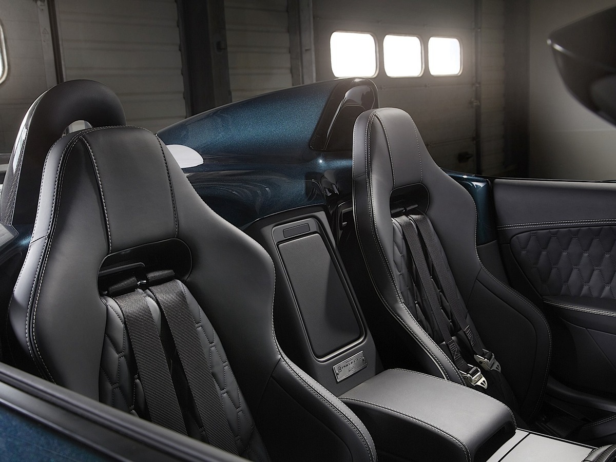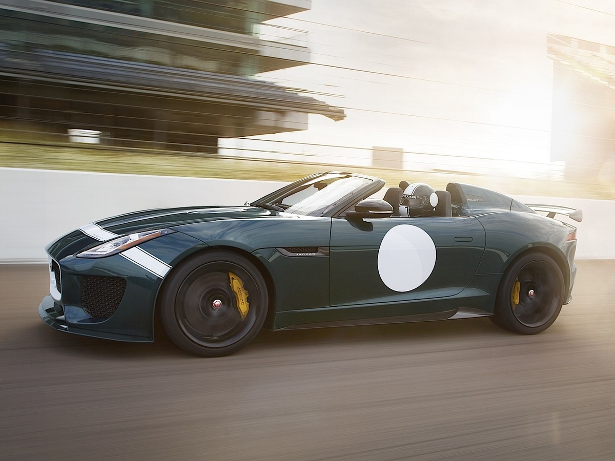 這部取名為Project 7的車款乃由Jaguar設計總監Ian Callum執行,設計靈感更是來自歷史相當悠久、1950年代的Jaguar D-Type賽車,有注意賽車歷史的朋友們可能會知道,Jaguar D-Type當年可是非常神勇,連續1955、1956、1957三年榮獲24小時利曼(Le Mans)耐久賽事。逐漸邁入量產階段的Jaguar F-Type Project 7係由原廠成立的Jaguar Special Operations特別訂製部門所組裝,而為了打造出純正的Speedster風格,Jaguar將F-Type敞篷車的頂篷構造全數移除,並且將後廂蓋雕塑成雙駝峰設計,駕駛座後上方則有防滾架,另外加裝碳纖維前下巴、後視鏡、葉子板進氣孔、側裙、後下擾流板與上揚14度的後擾流尾翼等部品。內裝方面,Jaguar F-Type Project 7採用菱格紋真皮、碳纖維飾板與鋁合金踏板,而與概念版本不同的是,Jaguar F-Type Project 7多了副駕駛座,實用性提高不少。