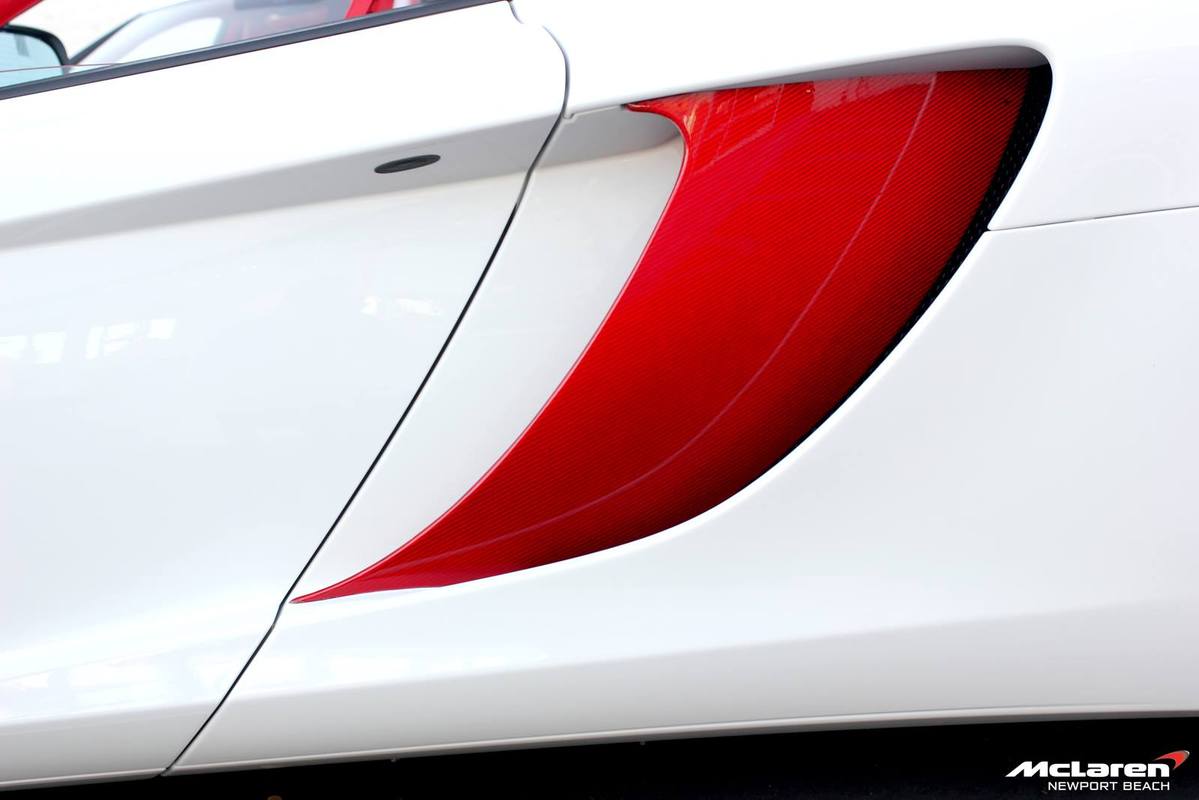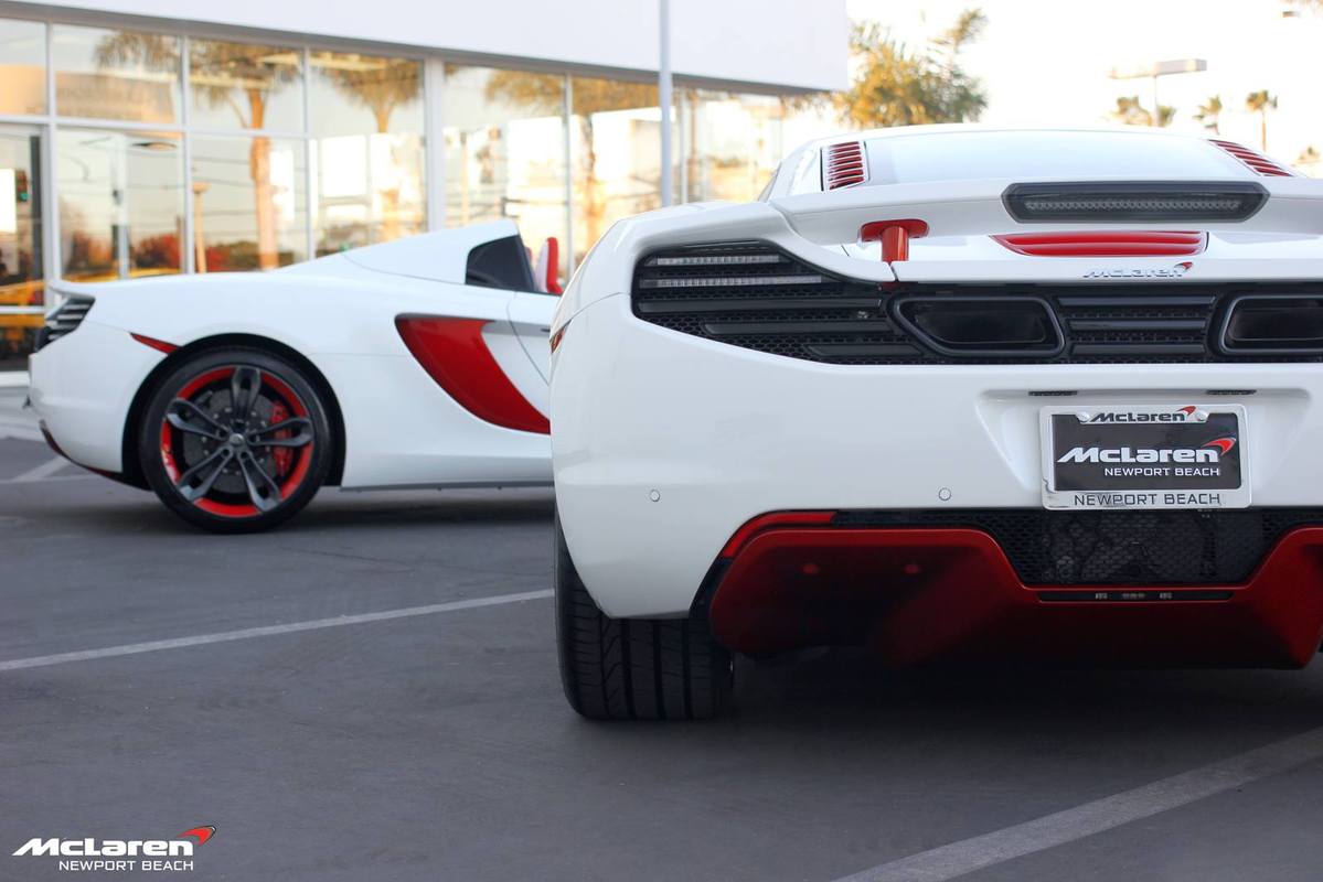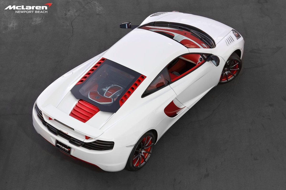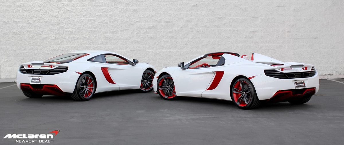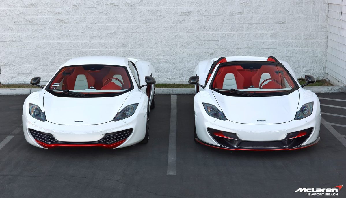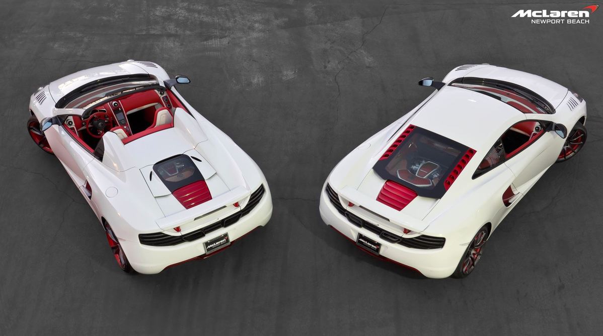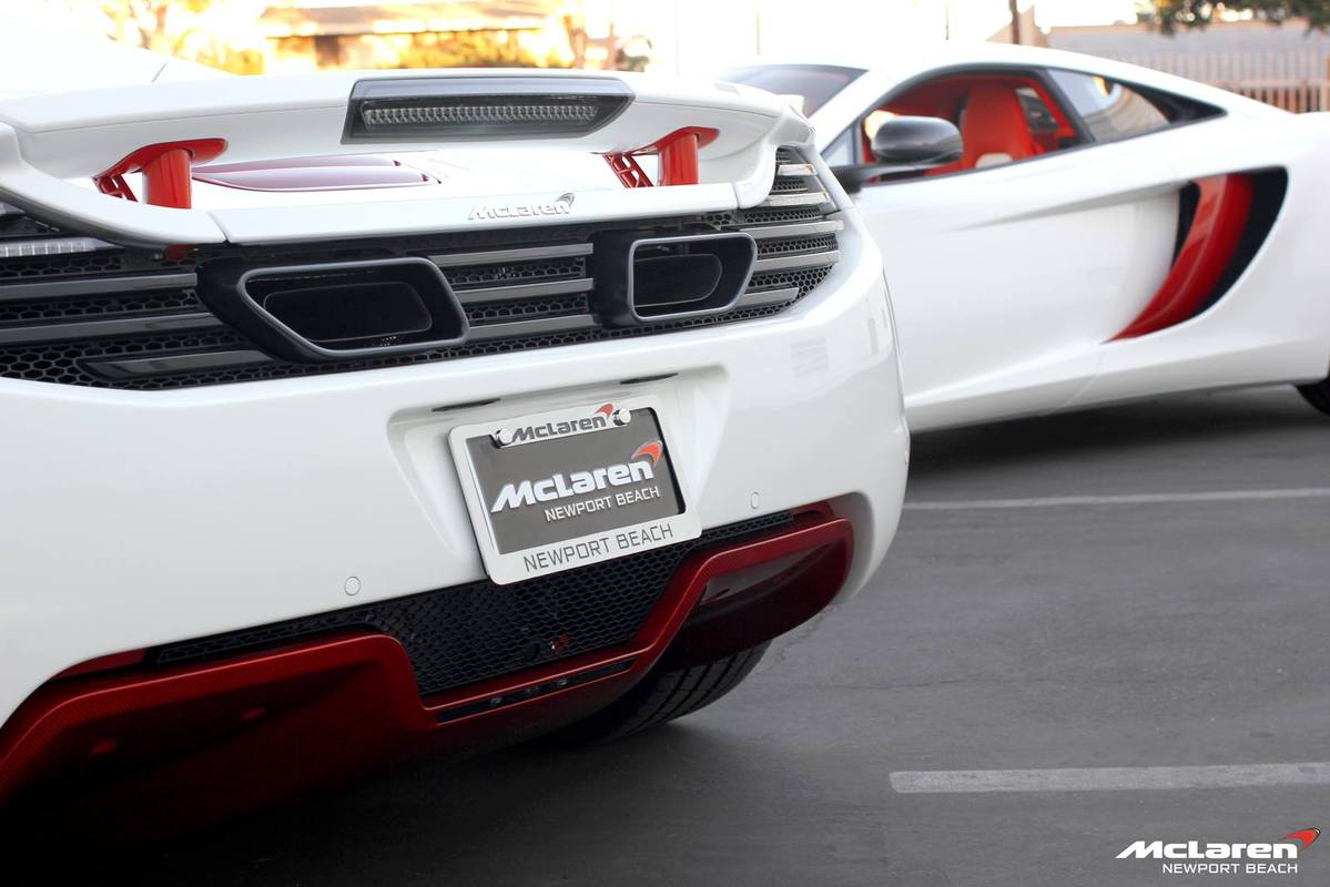 外觀方面,兩部McLaren 12C皆採用Extreme White淨白色塗裝搭配大量碳纖維套件,其中引擎室護板、前下巴、後下擾流板、後引擎蓋周邊飾板與B柱蓋板等處皆以罕見的紅色碳纖維部品妝點,與白色車身搭配,營造出極為特殊的視覺效果。內裝部分更是呼應外觀上的大膽組合,除了於頂棚、後艙置物空間與地毯等處用上頂級紅色麂皮包覆外,其餘則以白色真皮包覆,另外搭配紅色車縫線與多處紅色碳纖維飾板,方向盤則是以紅黑雙色透氣真皮搭配紅色碳纖維材質,同時選配有衛星導航、IRIS音響升級套件與全功能電動座椅等精裝部品,竭盡奢華之能事。