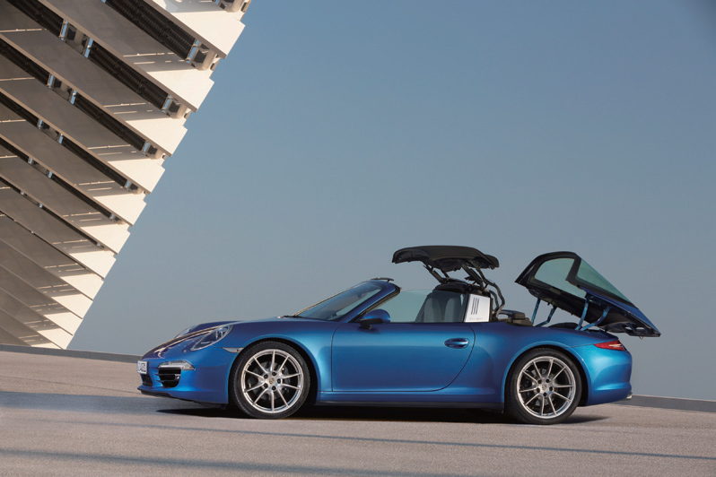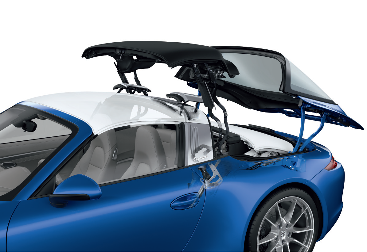 此車頂由兩個可拆卸的部件組成:一具軟篷車頂及一片玻璃後窗。只要按下按鈕,玻璃後窗便會向後方傾斜開啟,此後窗與車頂箱蓋相連。於此同時,Targa 防傾桿中的兩個翼板會開啟並釋放軟篷車頂的機構,敞篷車頂將會展開,並摺疊成 Z 形滑動至後座後方收起。一個橫跨後座後方的面板可將敞篷車頂收納其中,收折完畢之後,防傾桿的翼板和後窗會再度闔起。在軟篷車頂收起時,駕駛可用手動方式豎起整合在前圍框架中的迴風防護網,它可大幅減少車室內的氣流擾動。當車輛停駐不動時,使用中央鞍座上的按鈕開啟或關閉車頂僅需大約 19 秒的時間。為避免車輛受到損壞,標準內建的後方停車測距輔助系統 (ParkAssist) 可在車頂開關時監測 911 Targa 後方區域。如果感應器在 40 公分距離以內偵測到障礙物,便會響起警示訊號。這可避免向後傾下的後窗撞擊到停車位置極靠近 911 Targa 車尾的車輛或其它後方物體。