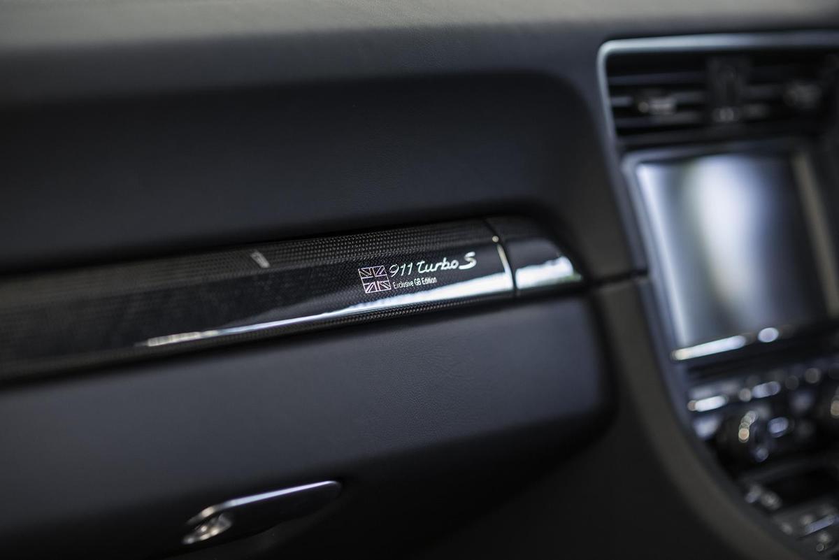 內裝部分,Porsche 911 Turbo S GB Edition在中央扶手皮革部分施以英國國旗印記並且於副駕駛座杯架碳纖維飾蓋標示「911 Turbo S Exclusive GB Edition」字樣,其餘則以黑色真皮、紅色車縫線、專屬腳踏墊與紅色安全帶為主要特徵。