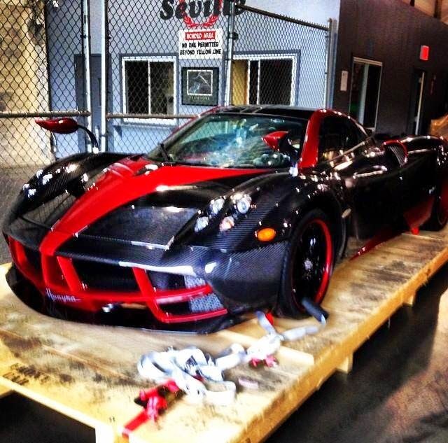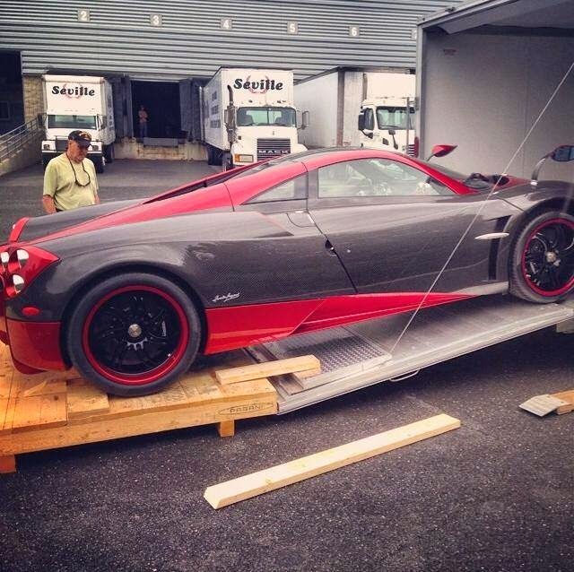 從初期僅10部的年產量成長至今,義大利超級跑車廠Pagani現在每年約可供應全球各地層峰玩家約60部車輛,而最近數個月公司將重心放在Pagani Huayra的生產上,以便在最短時間將車輛交到癡心等候的多金買家手中。隨著產能的持續擴充,Pagani已經陸續取得各國的車測標章,而Pagani Huayra在前陣子正式通國美國測試法規、能夠順利領牌上路,因此後續銷售數字與需求量持續看漲,而位於義大利聖切薩廖蘇爾帕納羅(San Cesario sul Panaro, Italy)的工廠也對此做好萬全準備,近期持續將多部剛組裝完畢的Pagani Huayra送到全球各地。動力部分,Pagani Huayra搭載代號M158、來自Mercedes Benz AMG的6.0升雙渦輪增壓V12引擎,由德國阿佛特巴(Affolterbach, Germany)最有經驗的工程師們調校,最大馬力可達720HP,扭力峰值可達102kgm,採用七速序列式變速箱與後輪驅動配置,百里加速由於後輪嚴重打滑而為看似沒有很出色的3.3秒,但極速高達370km/hr便是狂暴實力的最佳證明。今天要帶給各位的則是一部由美國網友Derekstowe於海關所擄獲的一部特殊紅黑雙色塗裝的Pagani Huayra,連原廠輪圈也施以中心黑色、外圈紅色的對比塗裝,相當特別。由於該兩張照片為Derekstowe在情急之下所拍攝,因此稍有晃到,稍後我們會再帶給各位該部Pagani Huayra的更多照片。