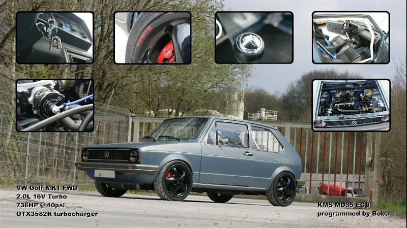 來自德國的Boba Motoring,是一間專門改裝舊款經典車的改裝廠,他們讓一些其貌不揚的車跑得飛快。這台初代Volkswagen Golf更堪稱全世界上最快的前驅車。從外表完全看不出任何肅殺之氣,這台Golf I植入2.0升16V引擎,搭配KMS MD35的可程式電腦與Garrett GTX3582R的渦輪機,爆發出驚人的736hp馬力。內裝方面,裝上防滾籠,其他大部分維持原廠樣貌。為了直線加速的穩定性與抓地力,鋼圈留用Porsche原廠款式,輪胎則使用TOYO R888全熱熔胎。