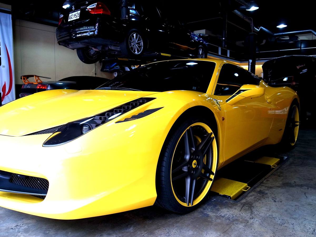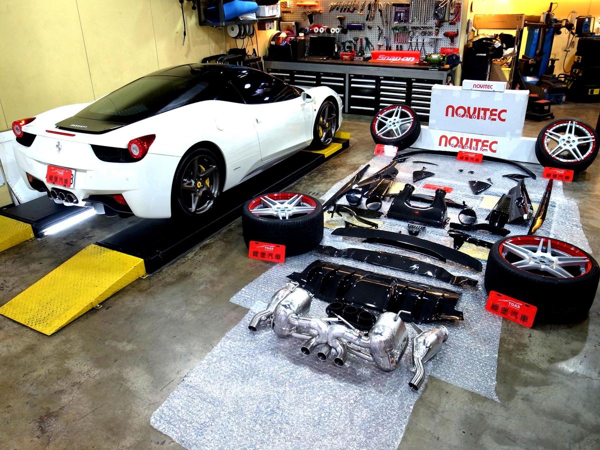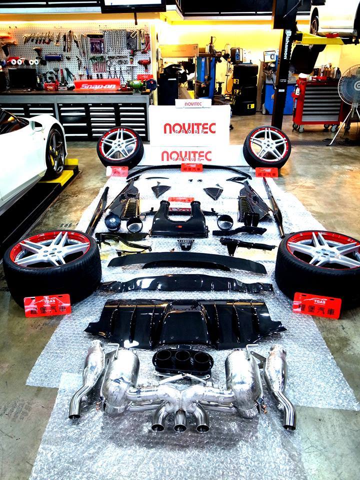 今天帶給各位的是本地全方位改裝廠緹堡汽車(Top Gear Auto Service)近期所操刀的Ferrari 458 Italia,其中採用Bianco Avus白色與Nero黑色two-tone塗裝的Ferrari 458 Italia正準備換上多樣來自Novitec Rosso的精緻部品,包含鈦合金排氣系統、碳纖維前下巴、碳纖維後擾流尾翼、碳纖維後三角窗飾板、碳纖維引擎蓋兩側飾板與碳纖維後下擾流板等,搭配Novitec Rosso出品、型號NF3的多片式雙色輕量化輪圈,完工後質感可期。