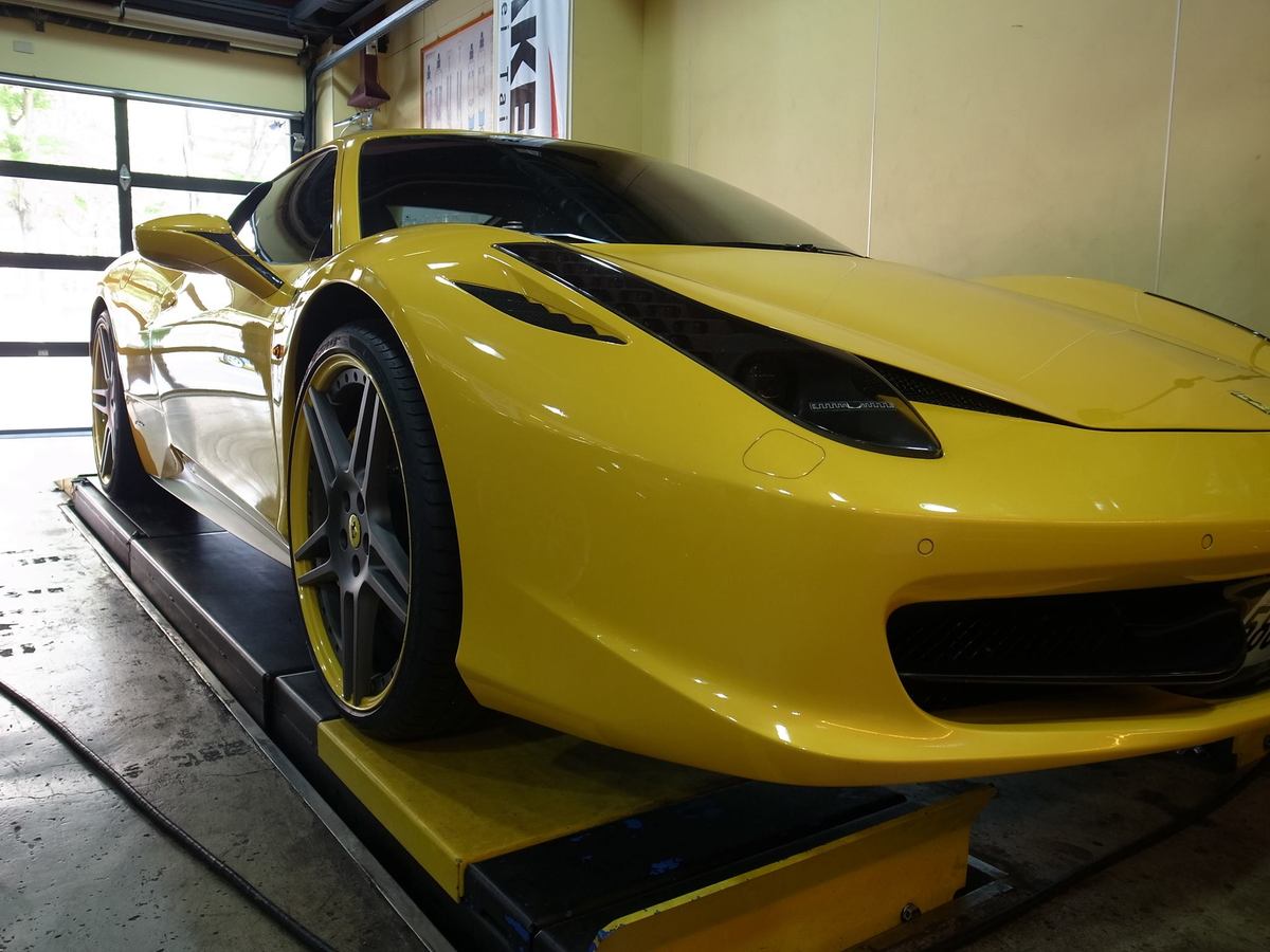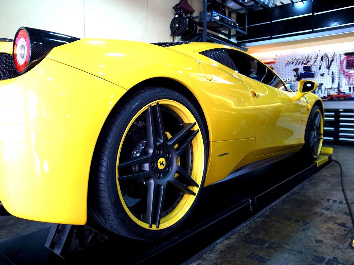 另外一部則是身披Giallo Modena黃色塗裝的Ferrari 458 Italia,同樣選擇Novitec Rosso NF3版本輪圈,然而為了配合車身顏色,將輪圈施以黃色與槍灰色的雙色塗裝,再透過Novitec Rosso短彈簧的換裝將車身降低,同時也換上部分Novitec Rosso碳纖維套件。