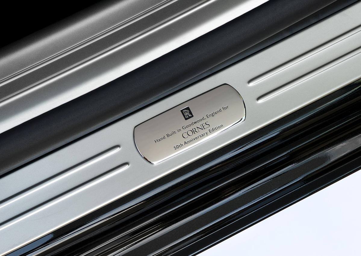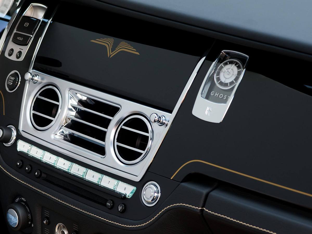 外觀部分,Rolls-Royce Ghost V-Specification配置與Wraith相同的21吋輪圈與電鍍處理排氣管尾飾管,車身顏色分為五種官方版本,也接受顧客客製化配色。針對這款特仕車,英國Rolls-Royce Motor Cars總經理Torsten Müller-Ötvös曾對外表示 : 「自從Rolls-Royce Ghost於2009年登場後,便提供全球成功商業人士自駕與聘僱司機兩種平衡間難以取代的樂趣,而它也將會陸續進化成就頂峰。」,簡單道盡提供V-Specification版本的初衷。 今天與各位分享一部被送達日本(Japan)代理商CORNES的嶄新Rolls-Royce Ghost V-Specification,車身採用高雅的黑色塗裝搭配金色車身飾條,同時也在葉子板、中控台面板與後座中央扶手等處施以「V字型」金色圖騰,門檻處也貼有「Hand Built in Goodwood , England for CORNES 50th Anniversary Edition」,相當特別。