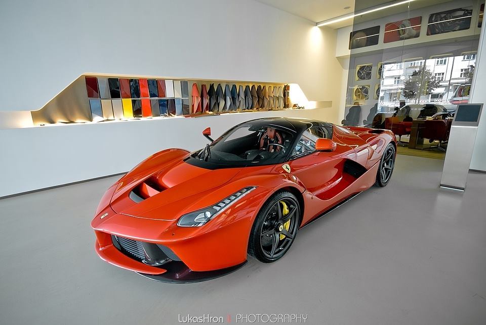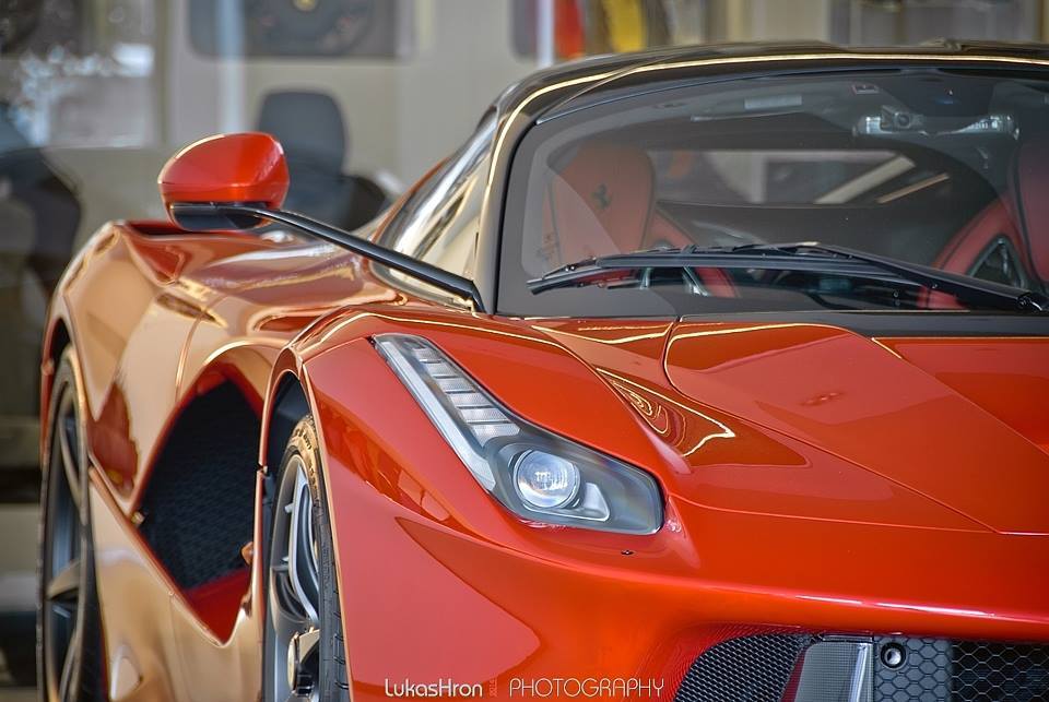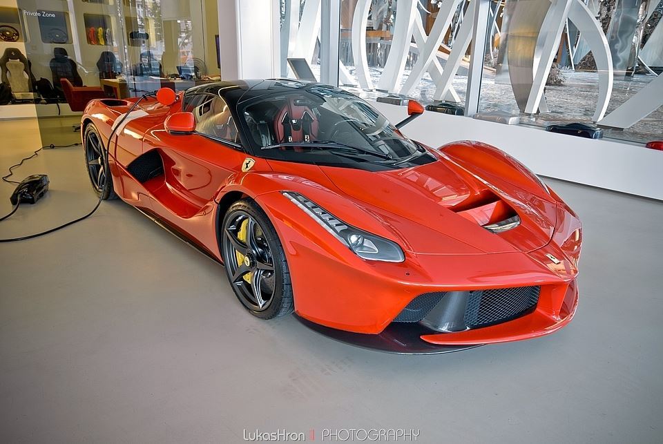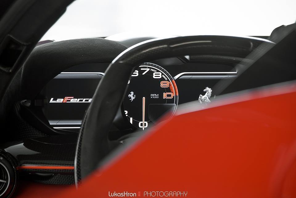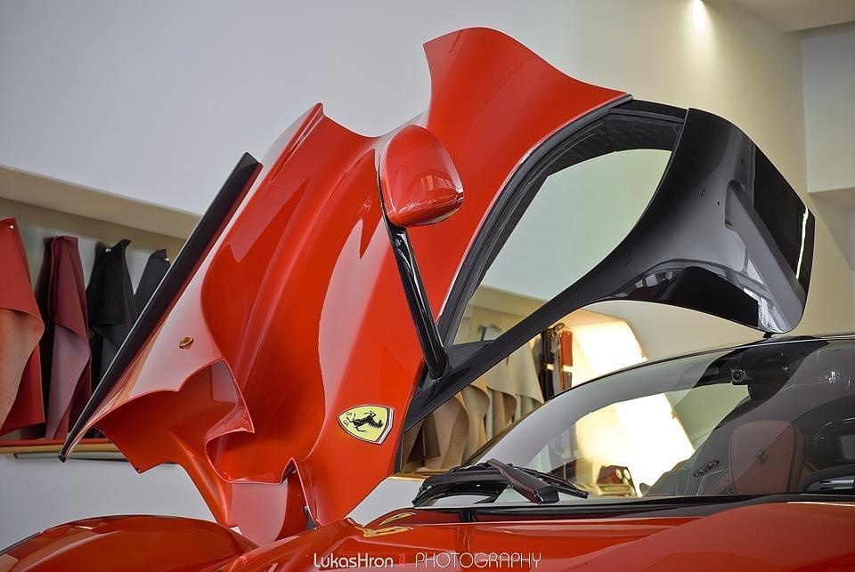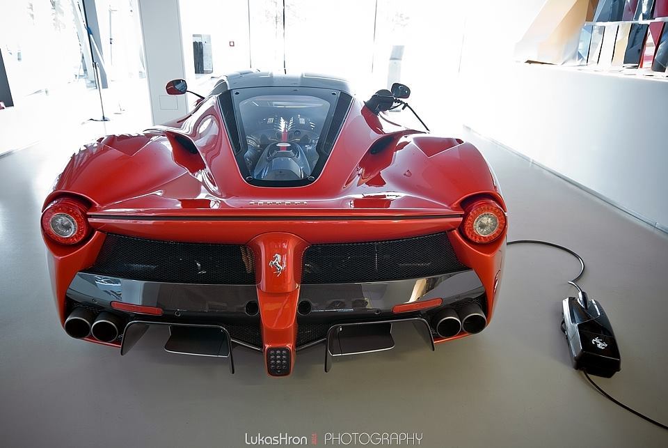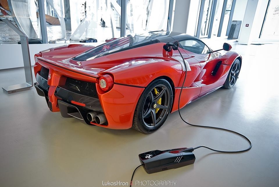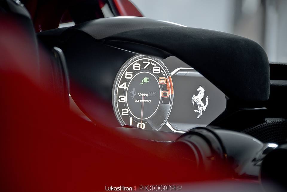 眾所周知,全球將只有499位幸運且富裕的人會拿到限量油電混合超級跑車Ferrari LaFerrari,而目前他們的愛車也陸續在世界各地現身。隨著美國(USA)、加拿大(Canada)、英國(England)與瑞典(Sweden)等地陸續出現首部Ferrari LaFerrari的同時,Ferrari LaFerrari各種角度的外觀照片各位讀者們可能已經看多了,今天要與各位分享的則是由攝影專家Lukas Hron Photography所提供的局部特寫照片。拍攝場景為捷克共和國(Czech Republic)首都布拉格(Prague)的代理商展示間當中,因此能夠見到Ferrari LaFerrari進行例行性充電時儀表顯示的畫面,而其原廠充電器也與其他款式Ferrari車種不同,體積較大也採用亮面鐵灰色覆蓋,頗具質感也相當特別。據說,該部採用Rosso Corsa紅色塗裝搭配黃色煞車卡鉗與槍灰色輪圈的Ferrari LaFerrari乃捷克當地第二部抵達境內者,正在等候尚在國外出差的車主回國後前往交車。身為現役Ferrari車種的霸主,Ferrari LaFerrari搭載6.3升V12汽油引擎與電動馬達,汽油引擎部分能於9,000rpm時提供800HP馬力與71.4kgm扭力,電力部分則是能貢獻163HP馬力與27.5kgm扭力,使得它的綜效最大馬力達到963HP,百里加速僅需不到3秒、由靜止加速至時速300km/hr不須15秒、極速超過350km/hr,相當強悍。