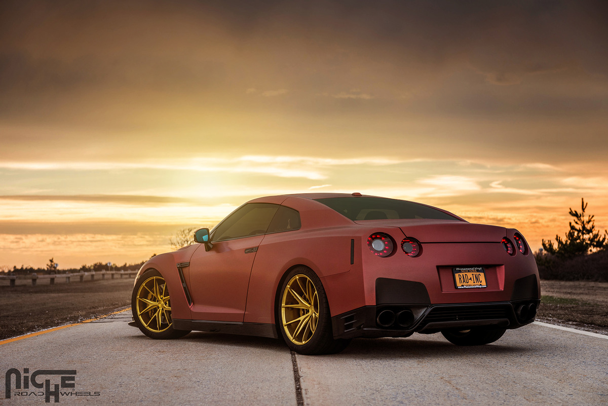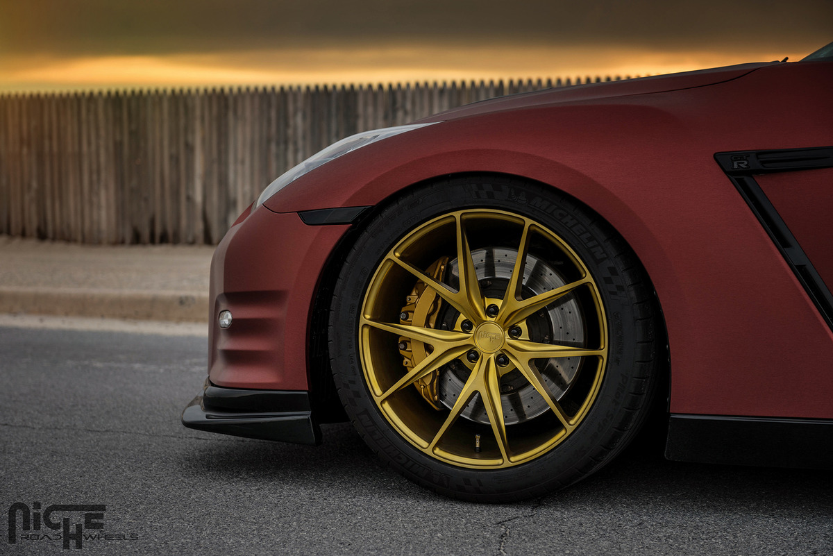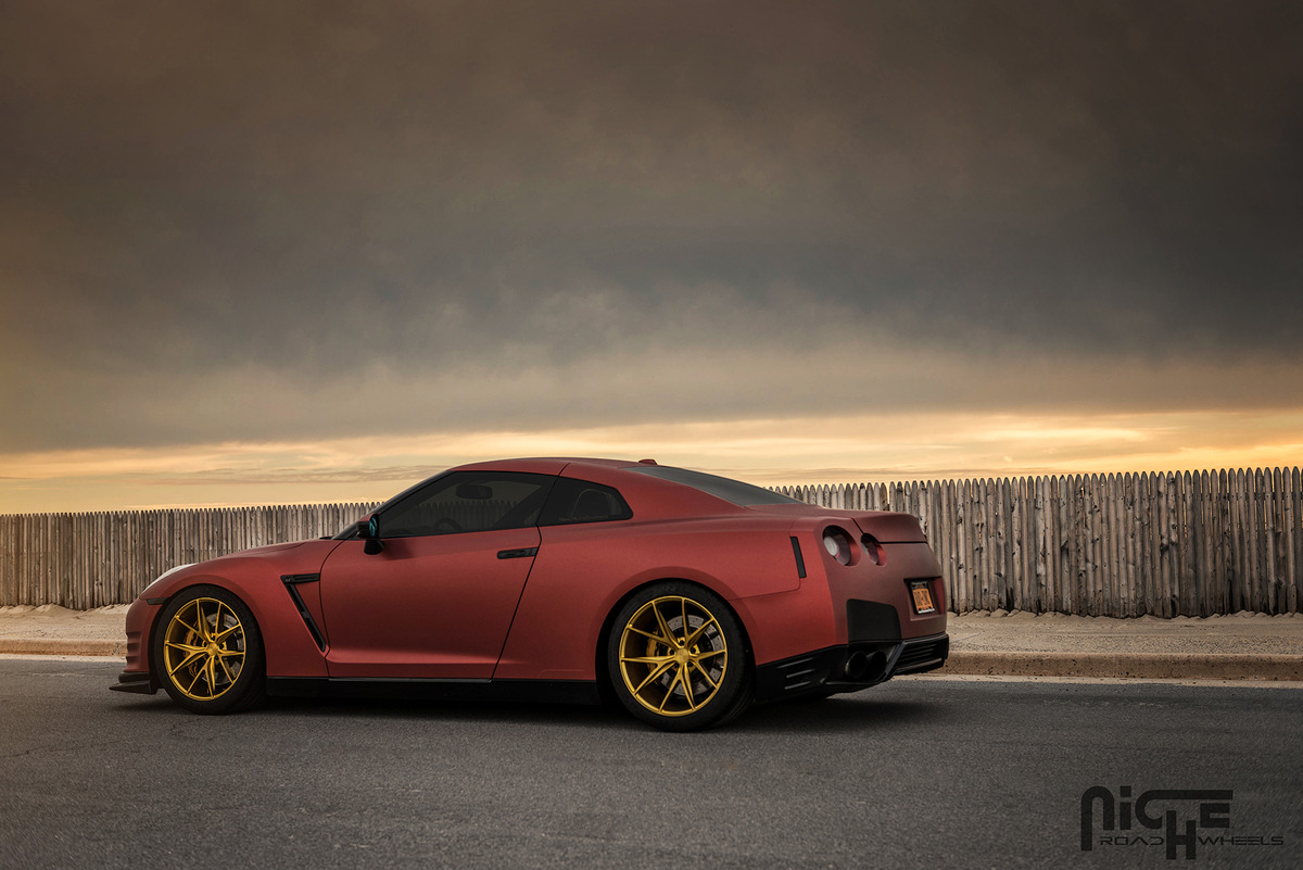 跑得飛快的確是Nissan R35 GT-R的最大賣點之一,但外觀方面其實也非常具有看頭、改裝潛力也不差。今天與各位分享由輪圈品牌Niche Road Wheels所提供的Nissan R35 GT-R,車身採用消光棗紅色貼膜,另外選用Niche Road Wheels出品、型號Misano T61的金色塗裝輕量化輪圈,尺寸為前20x10J、後20x12J的前後配設定,搭配前295/35R20、後335/30R20的Michelin Pilot Super Sport高性能跑胎,另外將原廠後擾流尾翼移除、尾燈施以燻黑處理,再搭配高低軟硬可調式避震器組將車身降低,讓這部東瀛戰神散發出獨特魅力。