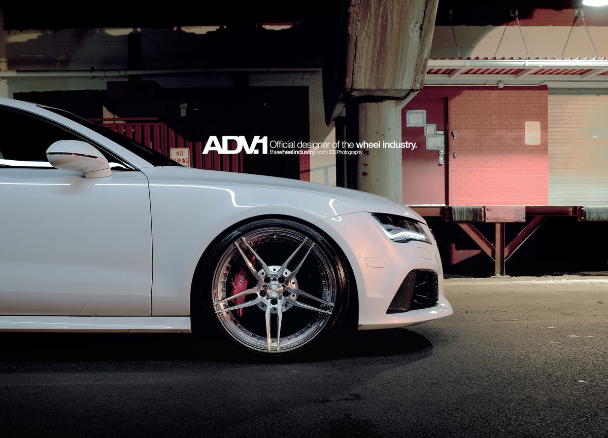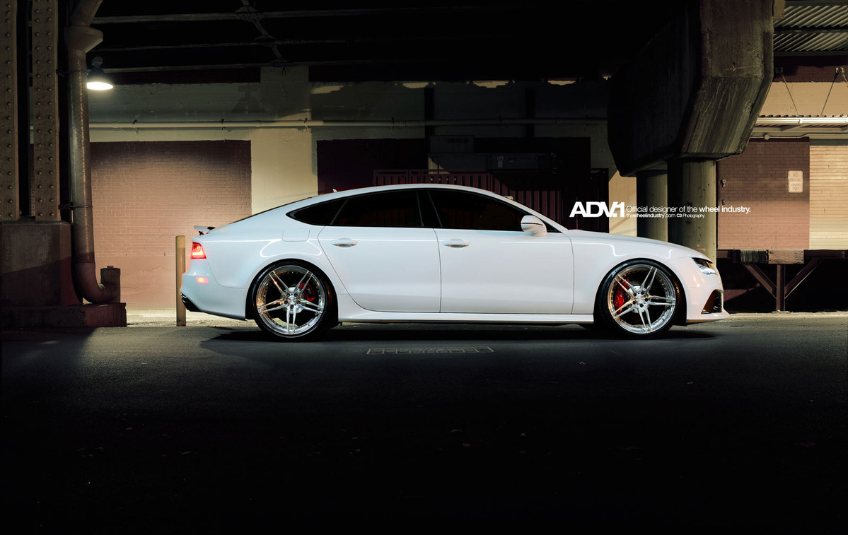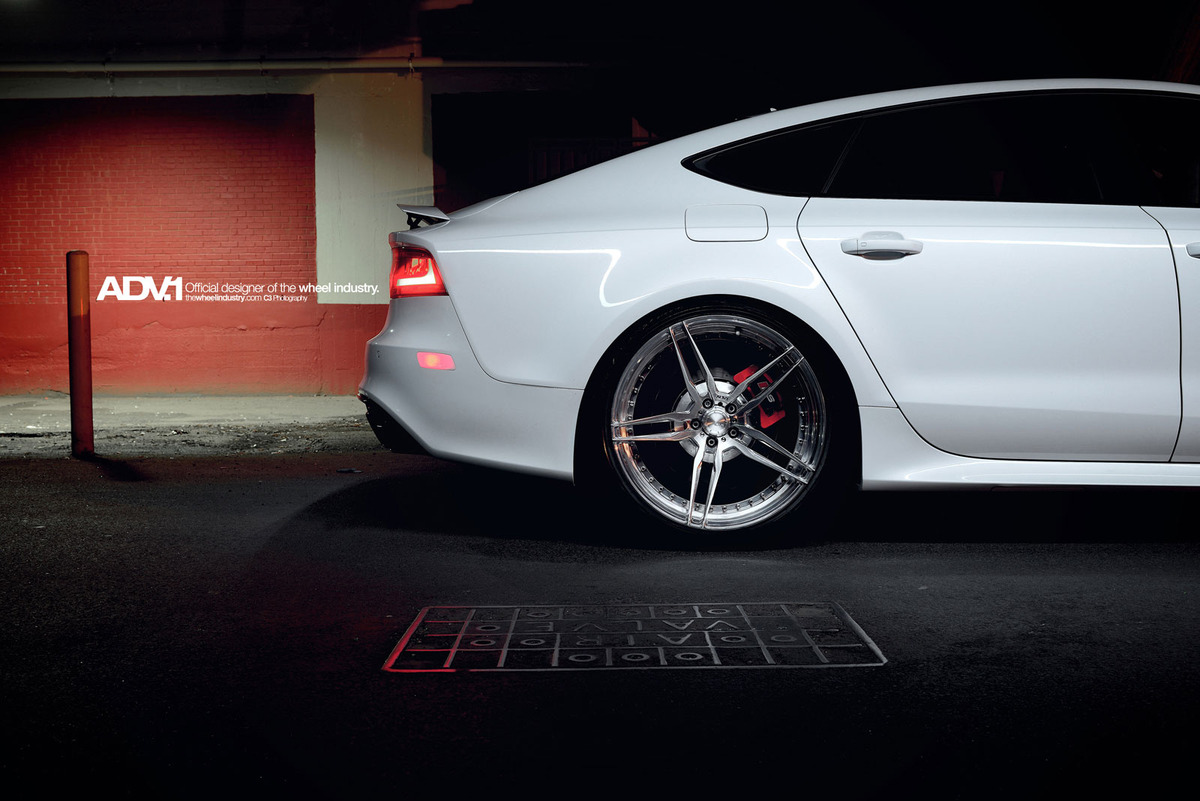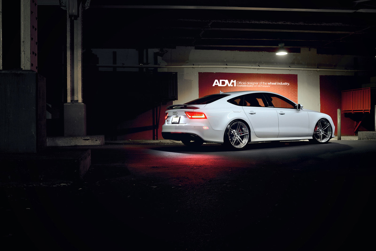 今天帶給各位一部由白色塗裝的Audi RS7,車身採用亮眼的白色塗裝,搭配出廠時選配的黑色套件與換裝的碳纖維後視鏡蓋,再選用知名品牌ADV.1 Wheels出品、型號ADV5.0M V2 CS的輕量化輪圈,圈面採用電鍍拋光處理,尺寸為前21x10.5J、後21x11J的前後配規格,搭配Pirelli P Zero高性能跑胎,再透過換裝高低軟硬可調式避震器組將車身降低,營造出帥勁滿點的動感跑格。