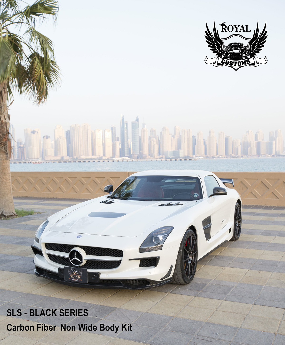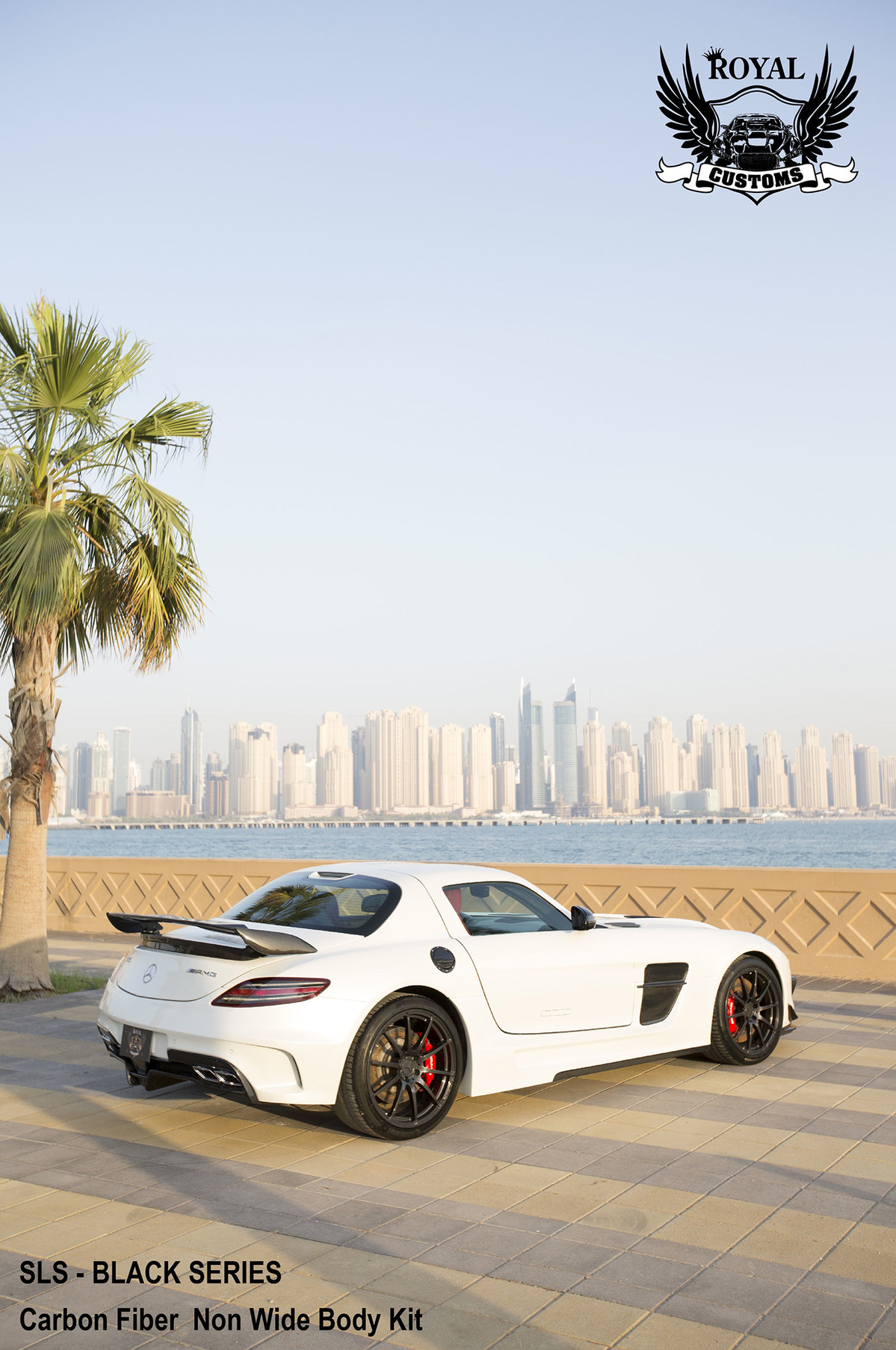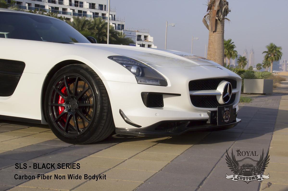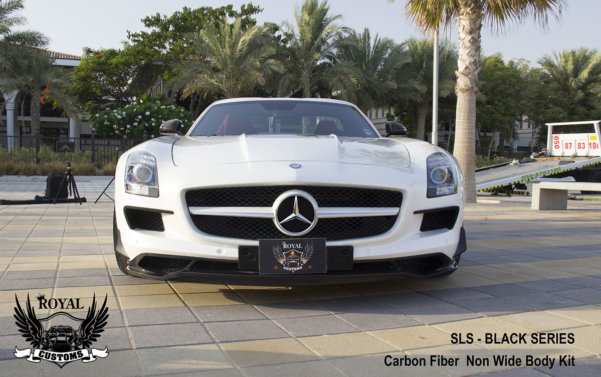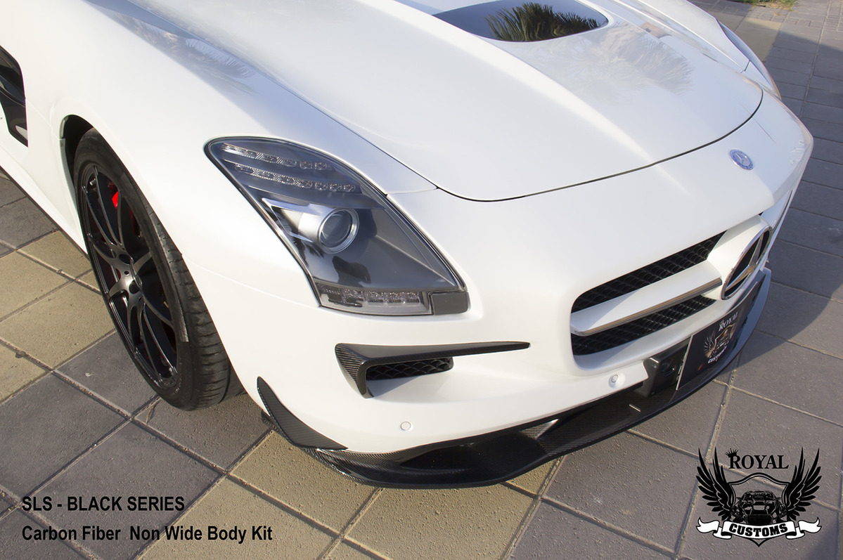 今天帶給各位一部由杜拜(Dubai)改裝廠Royal Customs所操刀的白色塗裝Mercedes Benz SLS AMG,全車換上設計靈感源自SLS AMG Black Series的整組空力套件,包含碳纖維前下巴、側裙組、前氣壩蓋板、引擎蓋、碳纖維後視鏡蓋、碳纖維油箱蓋、碳纖維葉子板進氣孔飾蓋、兩片式後擾流尾翼與碳纖維後下擾流板等部品,排氣管尾段也同樣流用自SLS AMG Black Series,完整度相當高,其中側裙組與後保桿等採用LFP輕量化彈性塑膠纖維材質打造而成,具有平整與輕盈的優勢。