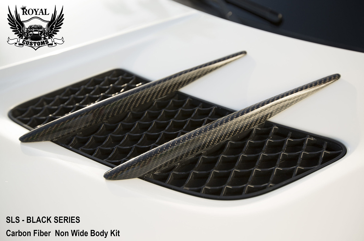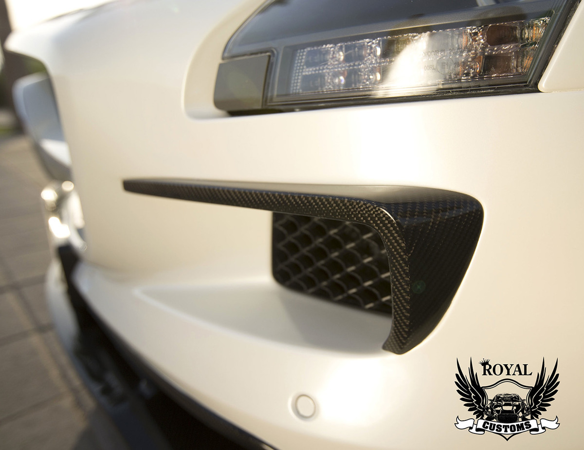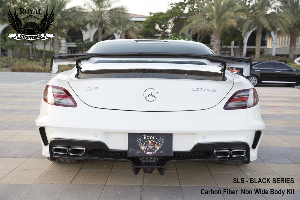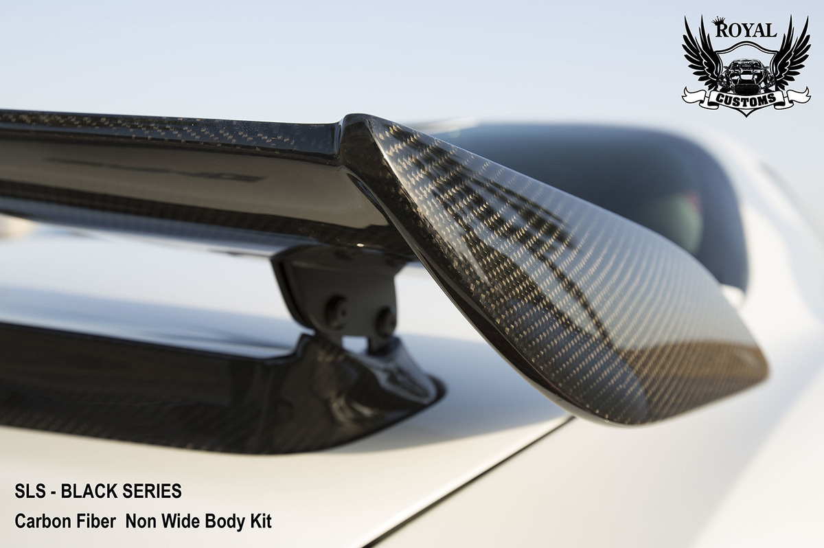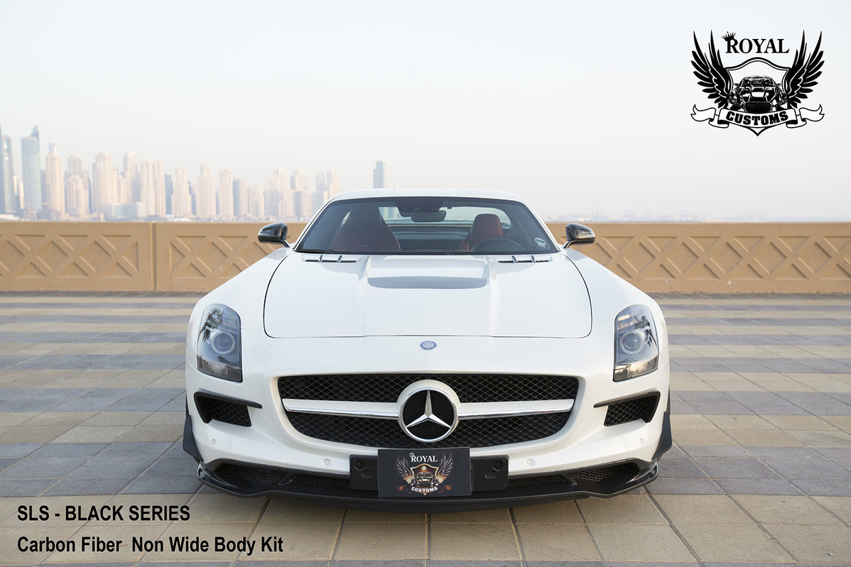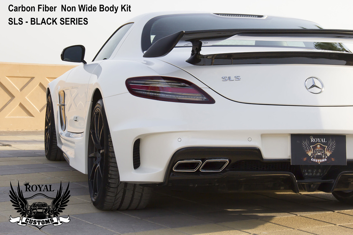 今天帶給各位一部由杜拜(Dubai)改裝廠Royal Customs所操刀的白色塗裝Mercedes Benz SLS AMG,全車換上設計靈感源自SLS AMG Black Series的整組空力套件,包含碳纖維前下巴、側裙組、前氣壩蓋板、引擎蓋、碳纖維後視鏡蓋、碳纖維油箱蓋、碳纖維葉子板進氣孔飾蓋、兩片式後擾流尾翼與碳纖維後下擾流板等部品,排氣管尾段也同樣流用自SLS AMG Black Series,完整度相當高,其中側裙組與後保桿等採用LFP輕量化彈性塑膠纖維材質打造而成,具有平整與輕盈的優勢。