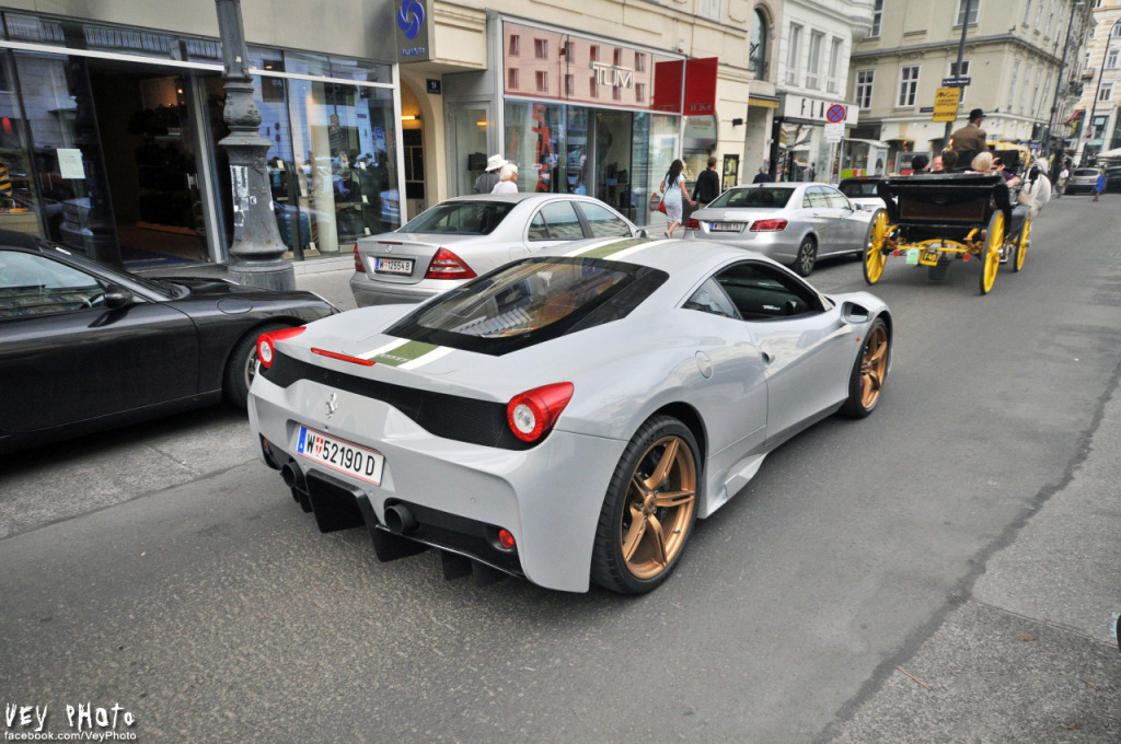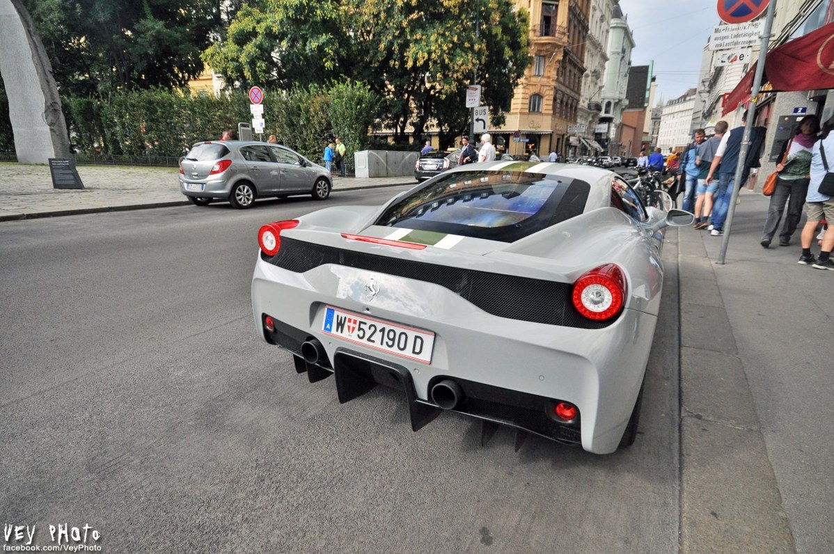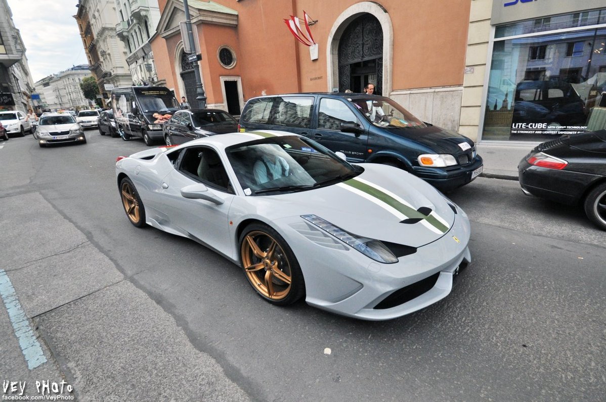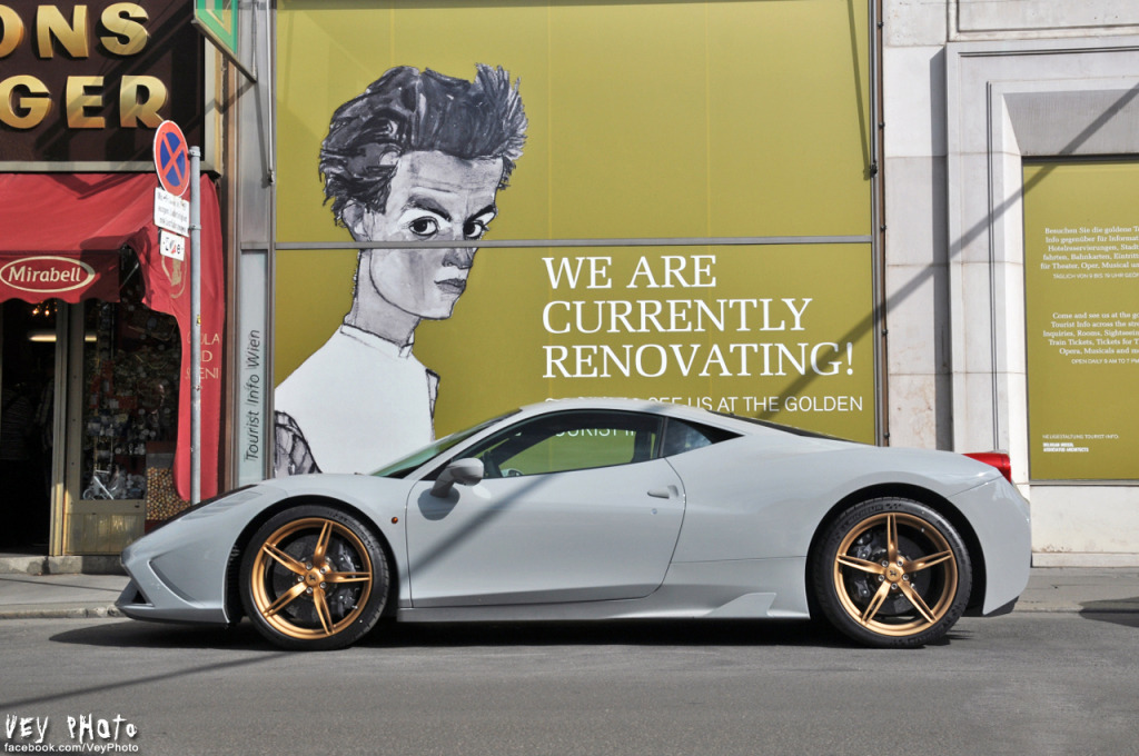 自從上市後便得到全球超跑車主極大迴響的Ferrari 458 Speciale搭載一具4.5升V8自然進氣引擎,擁有高達605HP的最大馬力,使得僅種1,290公斤的它能繳出百里加速3秒整的優異成績、由靜止加速至時速200km/hr也僅需9.1秒,相當強悍,堪稱當今自然進氣世代的極致。底盤方面,Ferrari 458 Speciale導入SSC(Side Slip angle Control system)側滑角度控制系統,能夠依照不同方向盤轉動幅度、側滑角度與行車速度調整電子循跡系統或防滑差速器介入時機,配上輪胎大廠Michelin最新款式Pilot Sport Cup 2高性能跑胎,於自家Pista di Fiorano測試賽道繳出1分23秒5的絕佳成績,穩坐Ferrari史上最速量產V8跑車的頭銜。除此之外,可能因為「車如其名」的緣故,不少買家在訂購Ferrari 458 Speciale的時候會來點「Special」的選配內容,而在先前與各位分享過多部來自世界各地、有著極為「特別」配置的458 Speciale之後,今天要帶給各位的是一部奔馳在奧地利(Austria)首都維也納(Vienna)的亮眼Ferrari 458 Speciale。