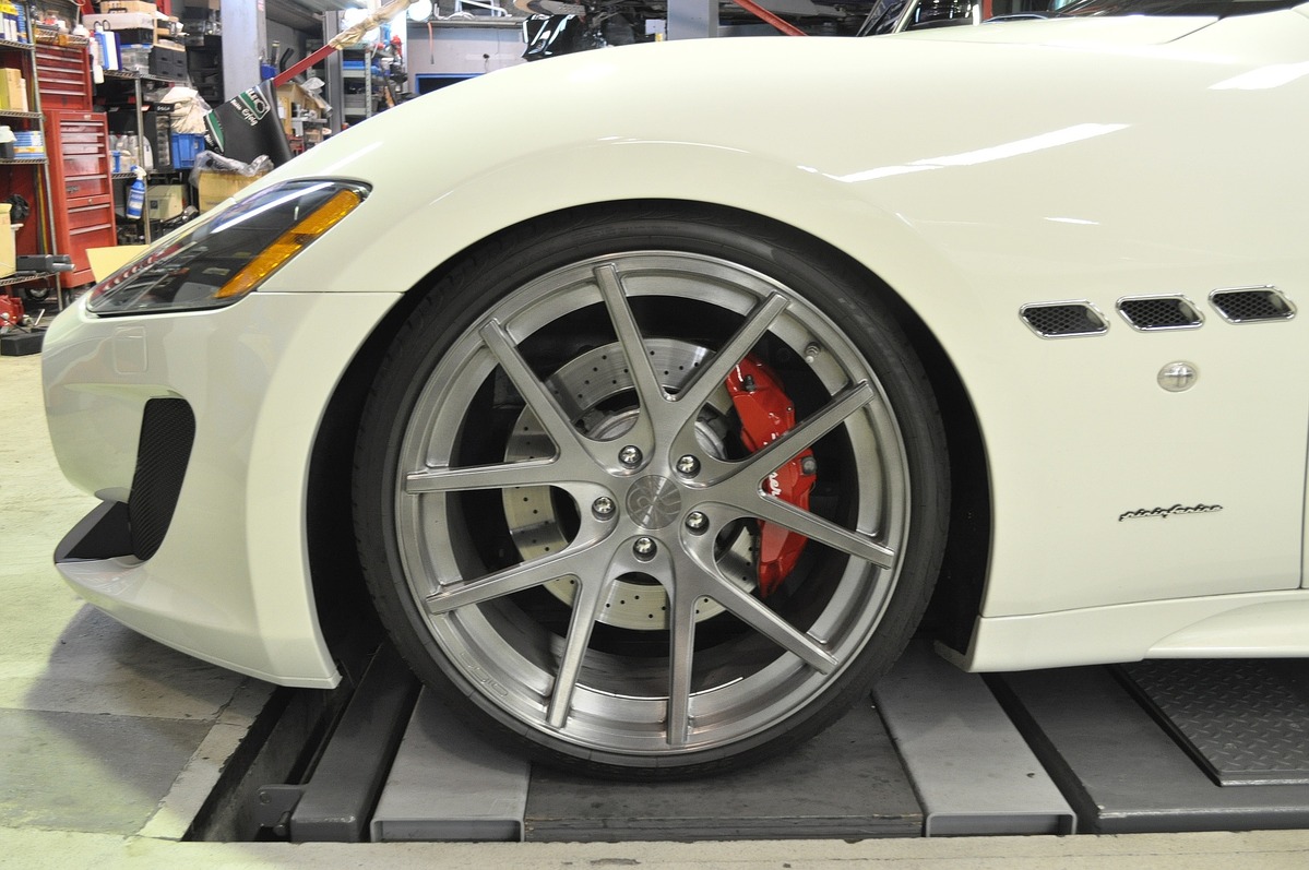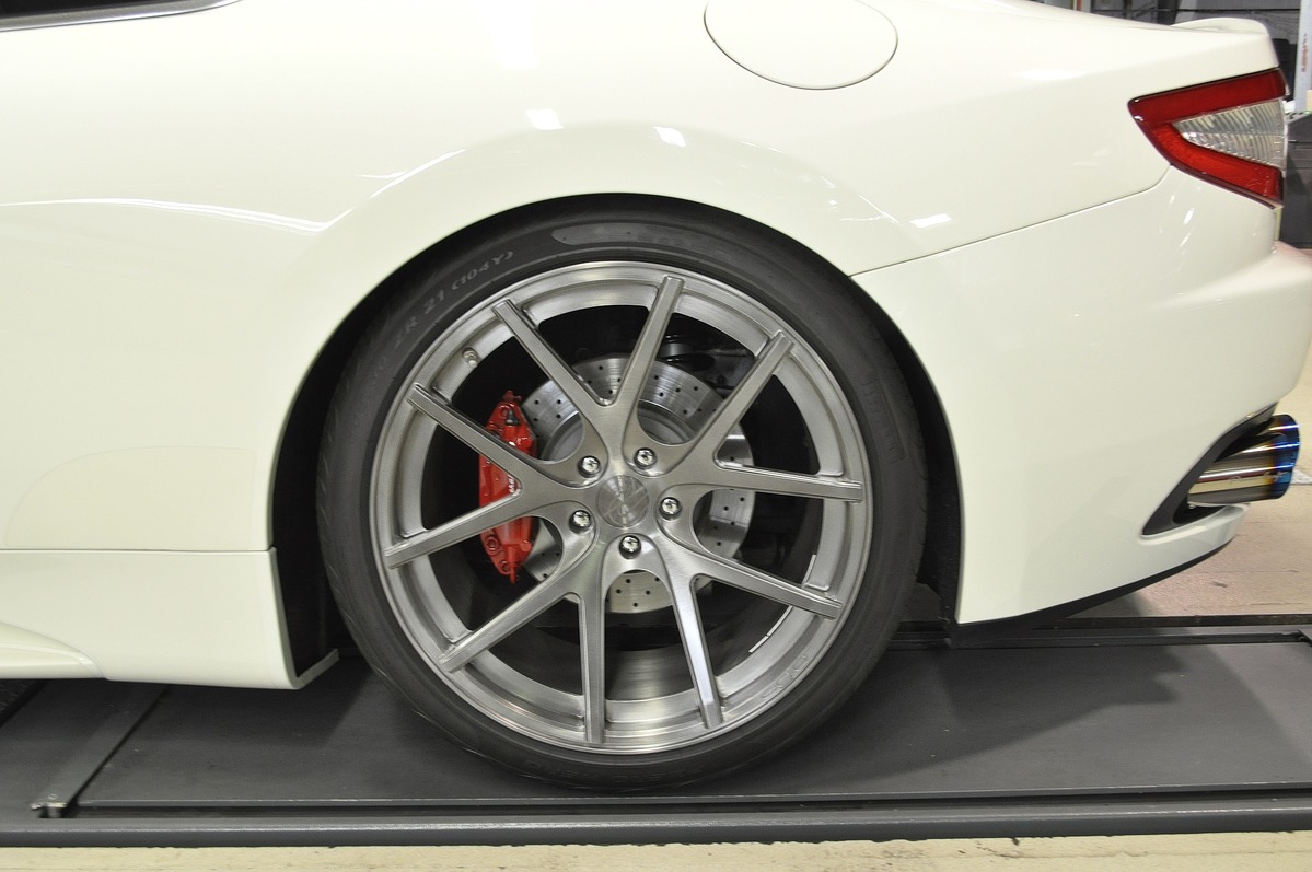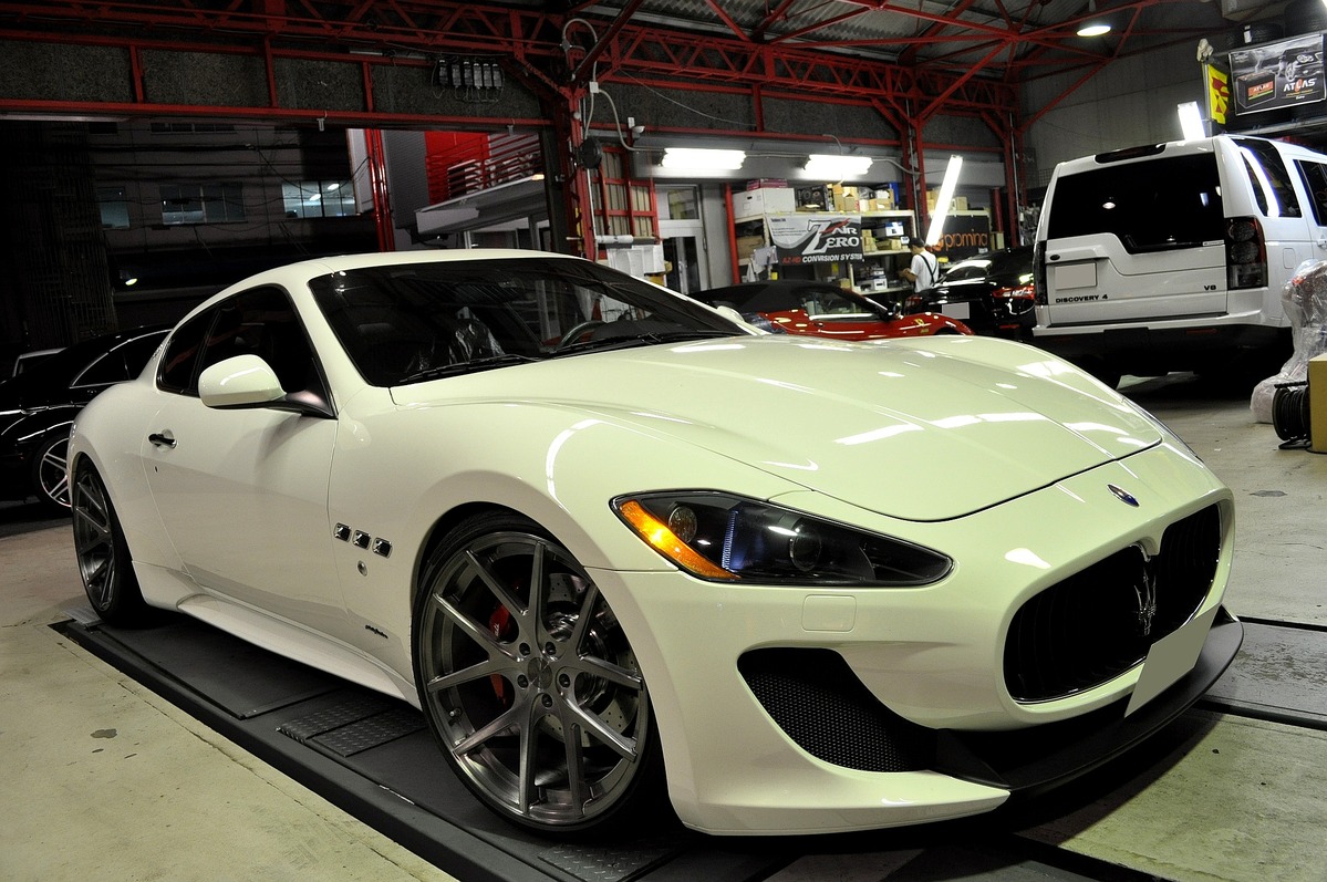 今天帶給各位的是由日本改裝廠Bond Osaka所操刀的白色塗裝Maserati GranTurismo 4.7 Sport Auto,選用知名品牌Agio Sport Wheels、Precisione系列當中型號PKR的輕量化21吋輪圈搭配Pirelli P Zero高性能跑胎,圈面採用質感極佳的手工刷痕處理,另外換裝專用H&R高低軟硬可調式避震器組將車身降低,再安裝Power Craft高性能排氣管,展現出奔放的熱情跑格。