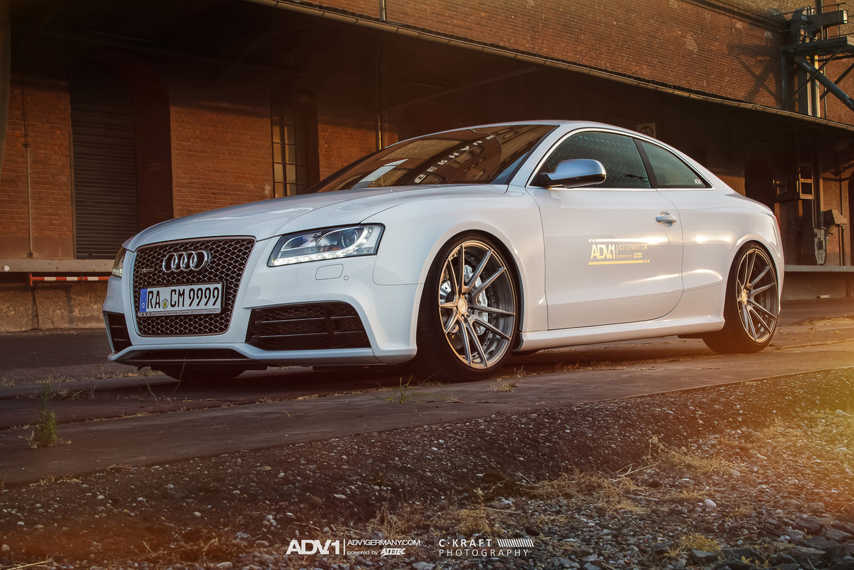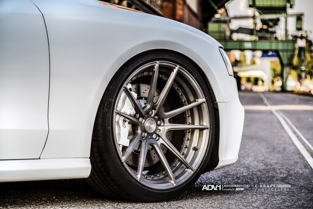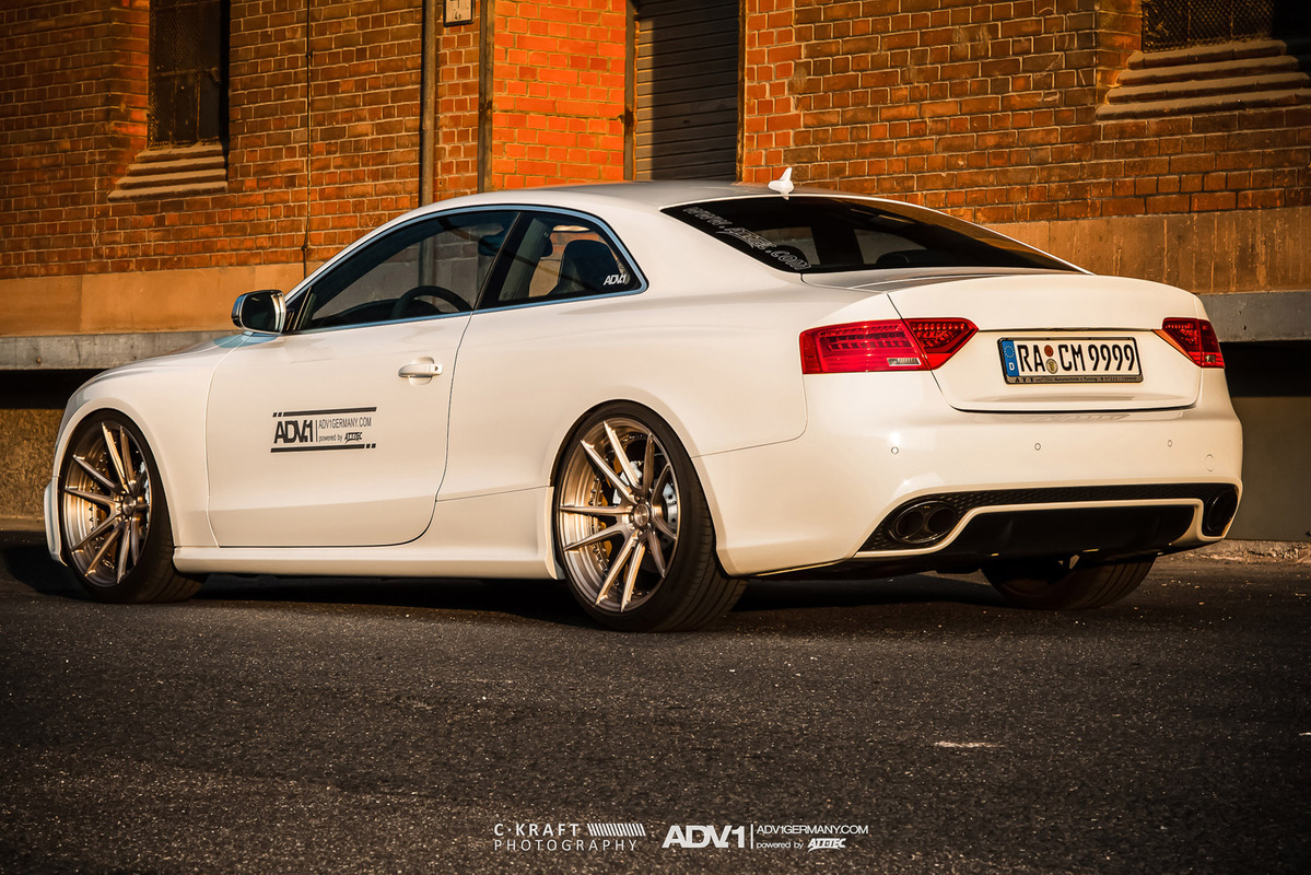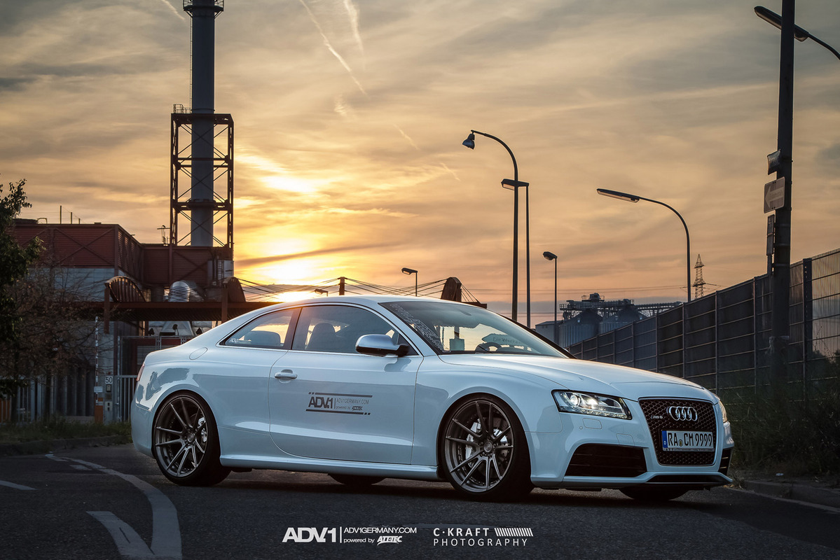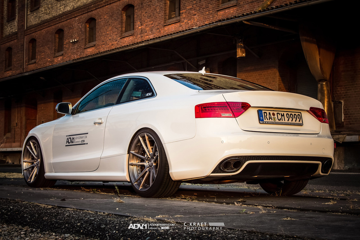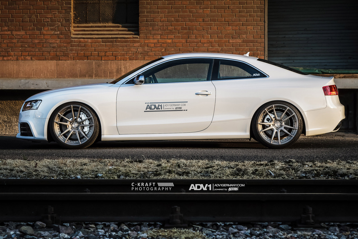 今天帶給各位的是一部由德國改裝廠ATT-TEC所操刀的小改款前Audi RS5雙門跑車,換裝知名品牌ADV.1 Wheels出品、型號ADV5.2 MV2 SL的輕量化輪圈,為了顧及Quattro系統的穩定運作,車主選用四輪皆為20x10J的尺寸,圈面採用鈦灰色處理,搭配Continental Sport Contact高性能跑胎,同時將煞車卡鉗施以與車身相同的白色塗裝,再透過KW V3高低軟硬可調式避震器組的換裝將車身降低,懸掛著「鐵支9999」的車牌,整體感十足。動力部分,ATT-TEC透過電腦程式改寫與進排氣系統優化,將最大馬力提升至約480HP,一般道路已足敷使用。