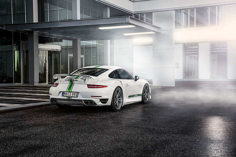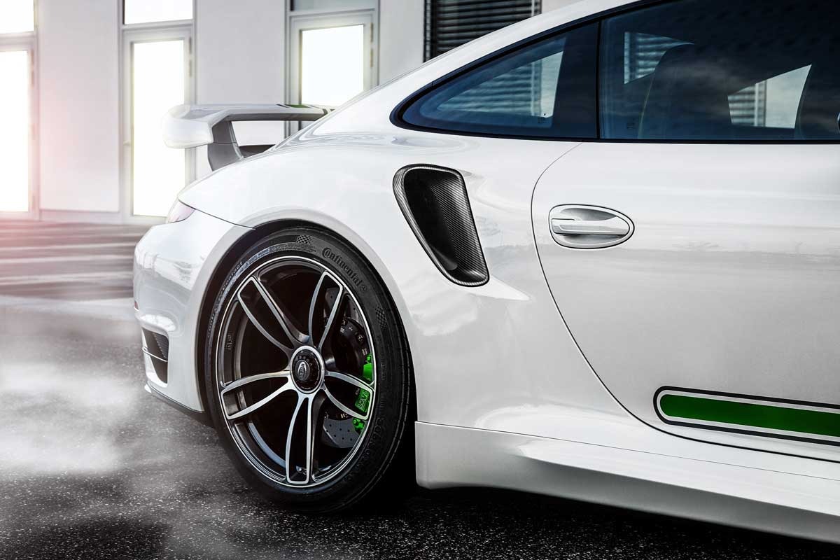在原廠未改裝的情況下,2014年新款Porsche 911 Turbo原廠搭載3.8升水平對臥六缸雙渦輪增壓引擎,最大馬力為520HP,扭力峰值有67.3kgm,輔以PDK雙離合器變速箱與跑車升級套件,百里加速僅需3.2秒便可完成,更高階的Turbo S則僅需3.1秒。,皆已相當強悍。然而,身為Porsche改裝圈內領導品牌,TechArt從不怠慢,從埃森車展結束後便閉門造車,而強調耐用度與妥善率的他們,最後決定以代號TA091/T1.1的動力套件、將Porsche 991 Turbo S的最大馬力提升至620HP,若搭配原廠Sport Plus模式,這部TechArt 991 Turbo S能夠於2.8秒由靜止加速至時速100km/hr,強悍至極。除了動力提升套件之外,TechArt前陣子也推出新款Porsche 911車系專用的全新輪圈,型號為「Formula IV Race」,採用單孔式、五幅雙肋設計與鍛造製程,每顆比Porsche 991 Turbo S的原廠輪圈輕上約1公斤,對於操控性能有一定程度的助益,而在繼新款輪圈發表之後,TechArt更推出多樣Porsche 991專用套件,在此與各位分享。