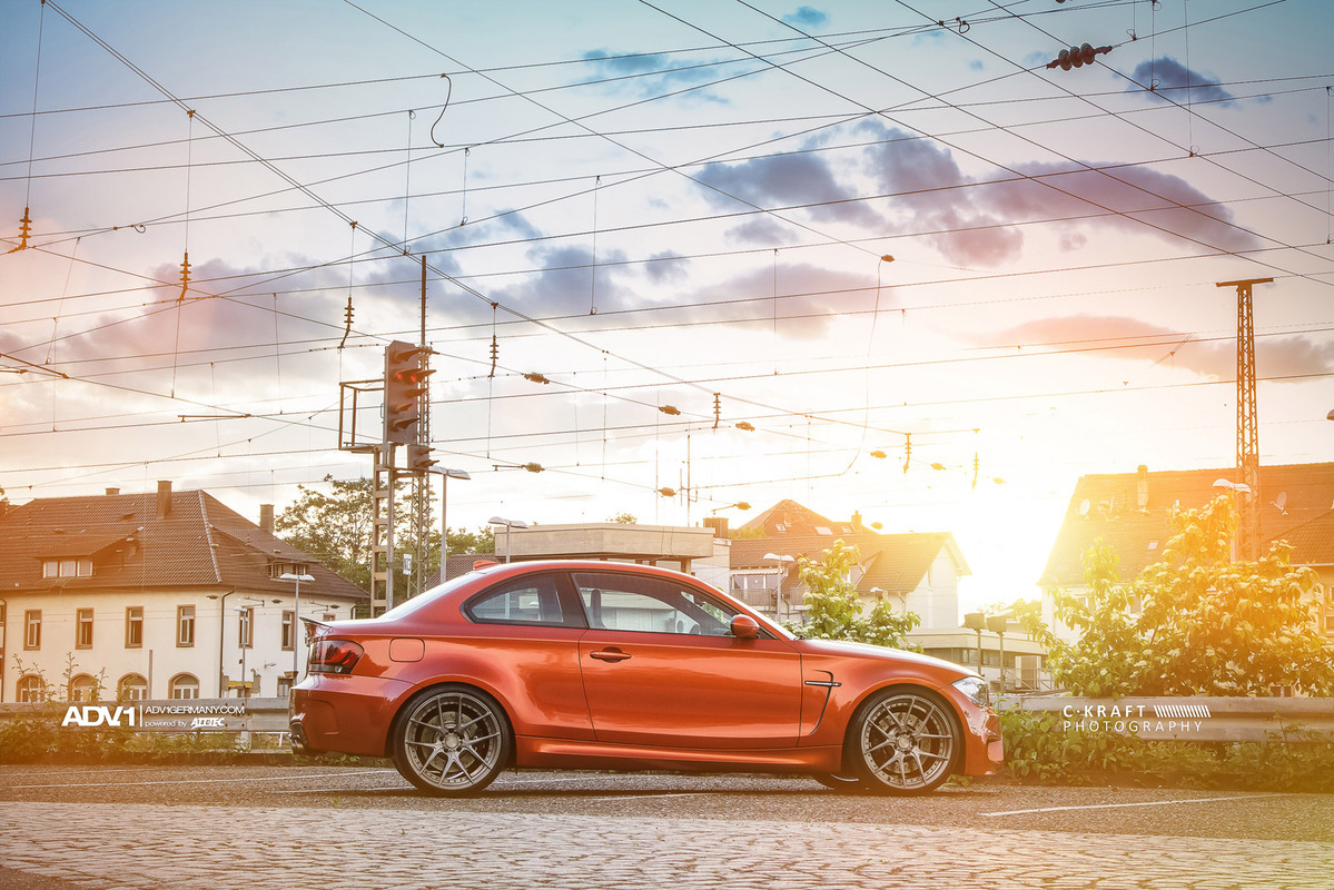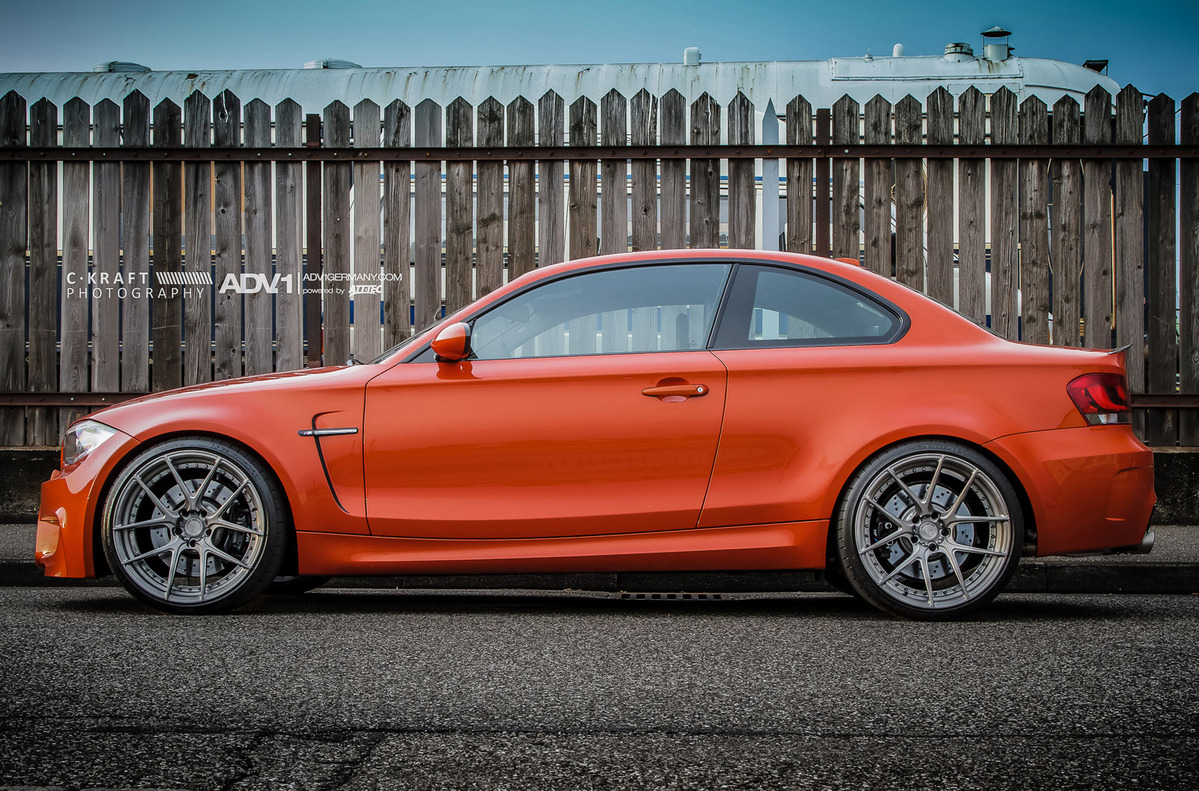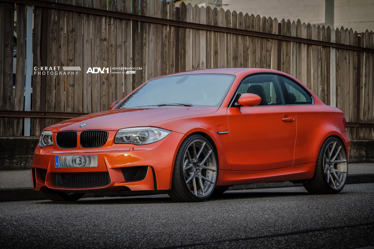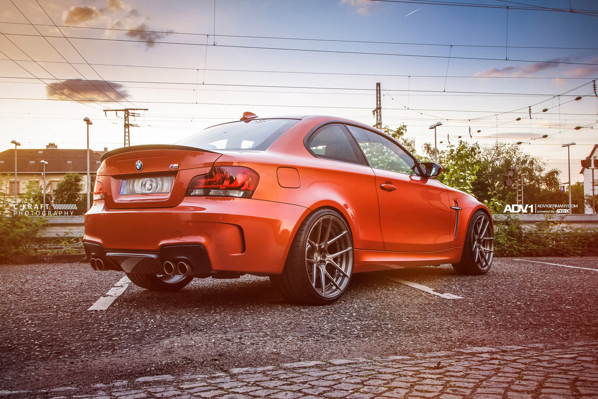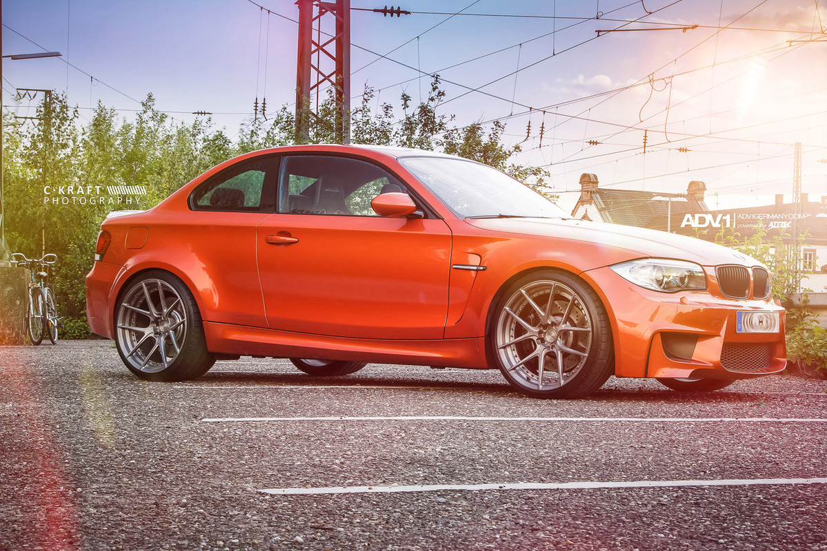 今天帶給各位由輪圈品牌ADV.1 Wheels所提供的橘紅色塗裝BMW E82 1M Coupe,選用型號ADV5.0 MV2 SL的五幅雙肋式樣槍灰色塗裝輪圈,尺寸為前20x9J、後20x11J的前後配設定,搭配前245/30R20、後285/25R20的跑胎,另外換裝KW V3高低軟硬可調式避震器組將車身降低,搭配加裝的M Performance碳纖維後擾流尾翼與車內的BMW Performance可調式賽車座椅等精緻部品,讓這部高人氣小鋼砲展現出高質感的迷人風采。