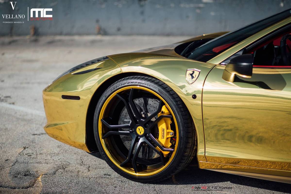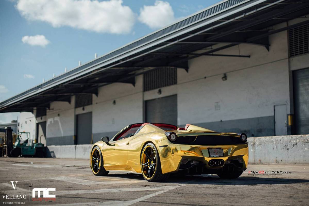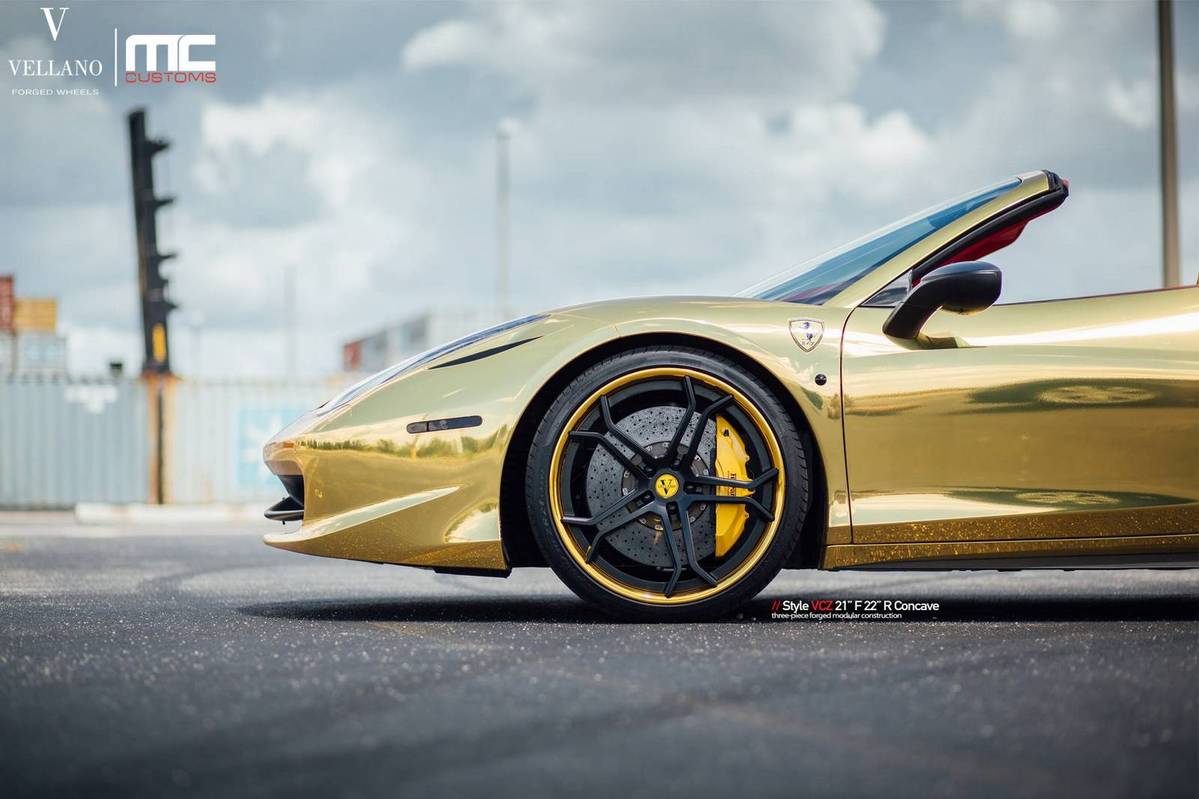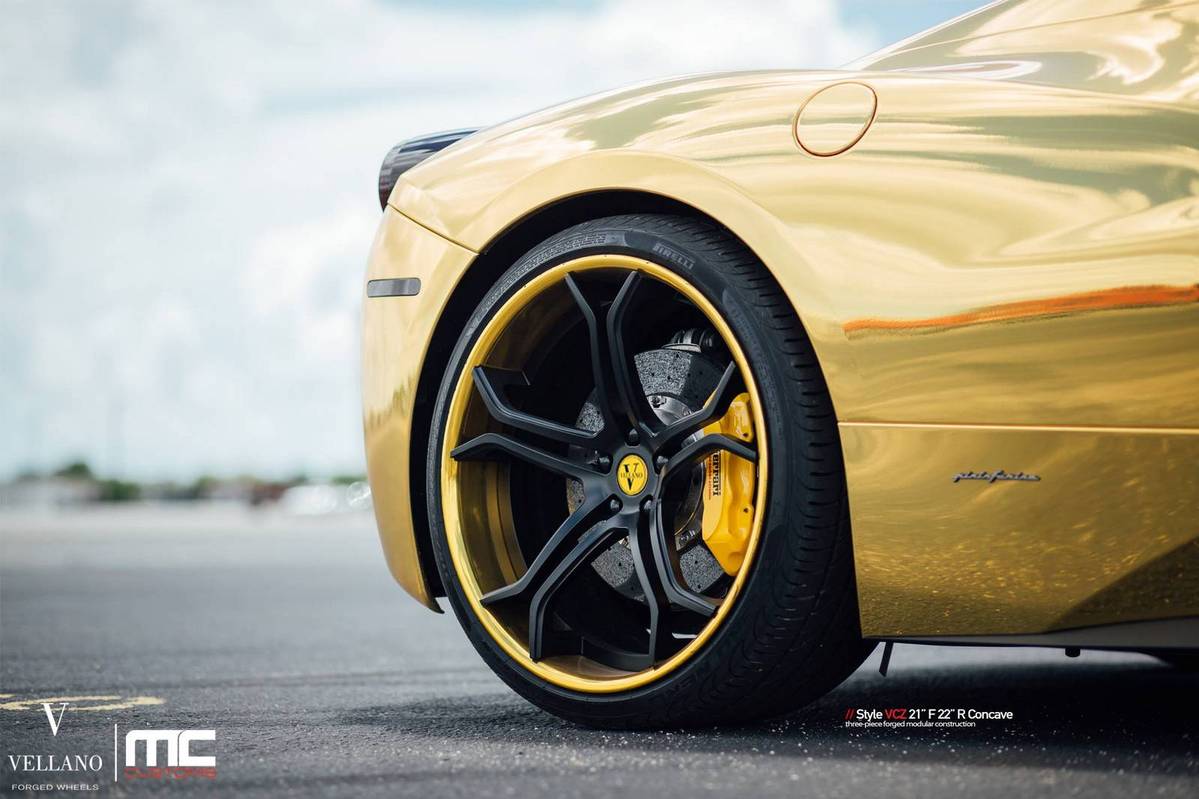 今天提供給各位參考的是眼前這台採用全車電鍍金色貼膜的Ferrari 458 Spider敞篷車,選用輪圈品牌Vellano Wheels、型號VCZ的輕量化輪圈,尺寸為前21x9.0J、後22x11.0J的前後配設定,中心以消光黑色塗裝,外圈則以呼應車身的金色處理,再透過Novitec短彈簧的換裝將車身降低,配上原廠選配的紅色真皮內裝,吸睛度可謂百分百!